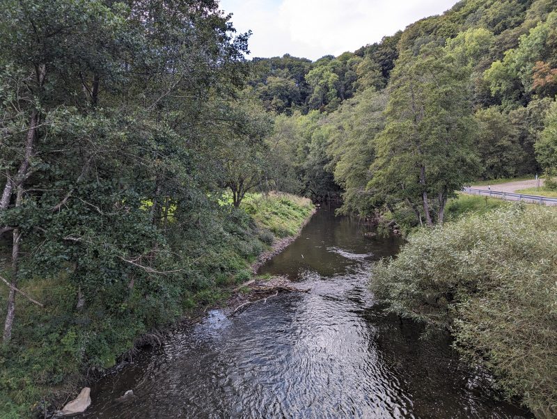 Nach der dritten Runde geht es wieder 2 Stunden auf Autoheimfahrt, daher ist ohne Bäckerlauf kurz nach neun der Start entlang der B252 Richtung Korbach auf einem gut ausgebauten leicht ansteigenden Radweg Richtung Norden. In Dorfitter zweigt die Itter nach Westen ab, nach einem kleinen Stück Straße und weiteren Wirtschaftswegen ist die alte Bahnlinie der Ederseebahn erreicht. Auf der Trasse geht es in einer größeren Schleife bis hinter Sachsenhausen, wo der Radweg Richtung Edersee Nordufer in das Reiherbachtal abzweigt. Die Strecke ist ein Genuss bis zur Mündung auf der Landesstraße vor Niederwerbe an einer Ederseenase. Der Ederseeradweg führt dann erst auf der Kreisstraße Richtung Scheid, einer Sackgasse auf der freizeitbestimmten Halbinsel. Das Ederseeufer ist dann bis Asel nicht befahrbar, es geht durch den Wald erst steigig über die Felsnase und dann flacher auf einem Waldweg hoch nach Basdorf und dann wieder bergab nach Asel.