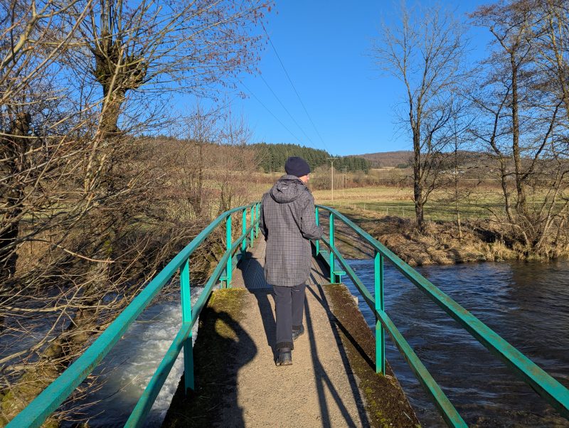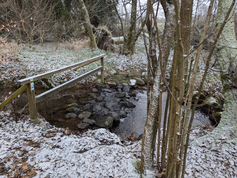 Die sechste Etappe wurde als Lauf- und Wanderstrecke an einem schneegrieseligen Samstag absolviert. Erst mit dem Auto nach Alpenrod zum Parkplatz an der Alperoder Hütte, dann laufend nach Freilingen über teils holprige aber auch flowende Pfade an der jungen Wied entlang. Am Treffpunkt am Standbadparkplatz am Campingplatz Freilingen dann Kleider und Wanderschuhwechsel und zu zweit wieder zurück über den Westerwaldsteig nach Alpenrod. War anstrengend, aber die leicht angezuckerte Landschaft war motivierend.