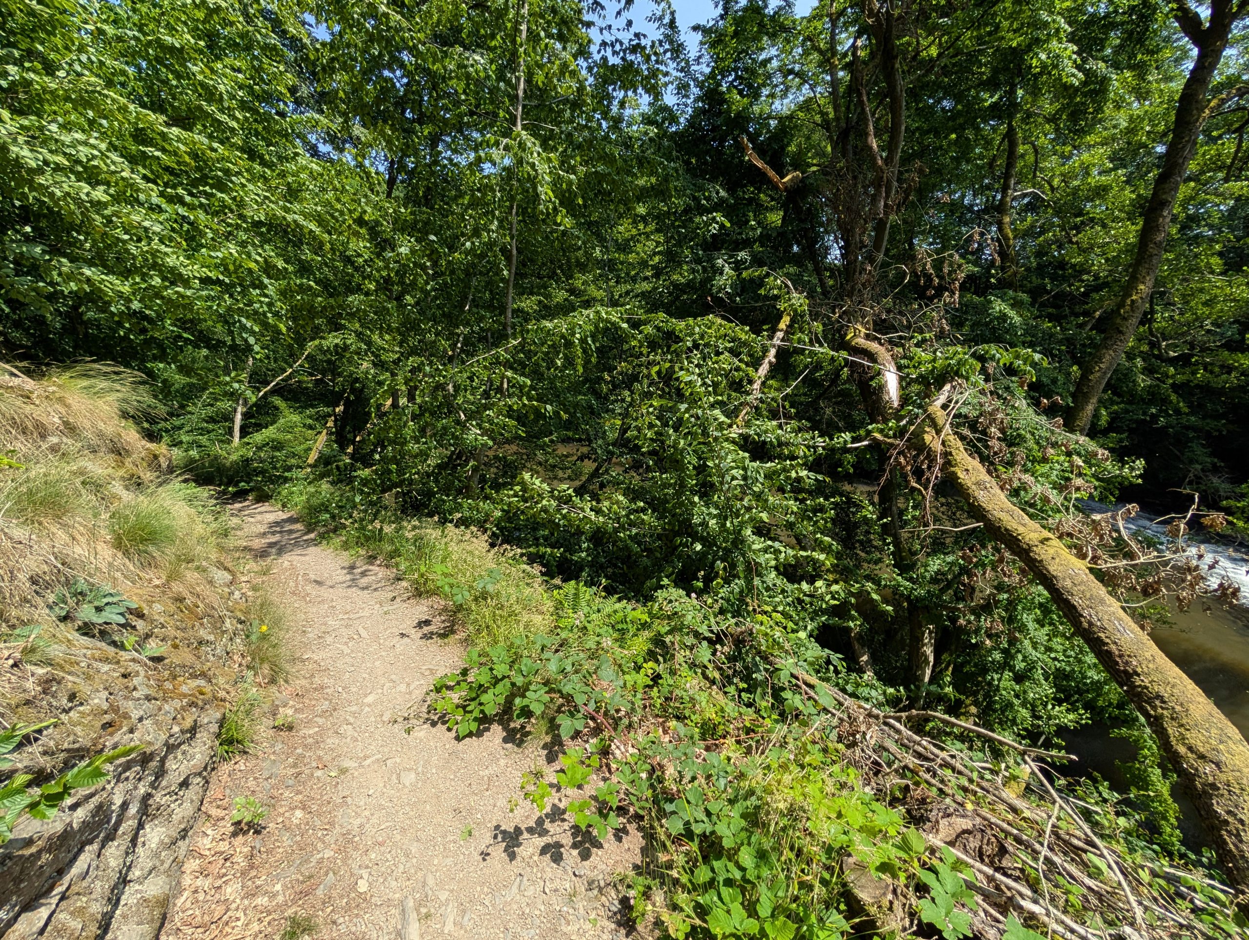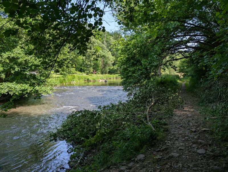 Die Laufrunde zurück ist erst teils schattig, teils sonnig an Racksen vorbei. Nach Querung der B256 geht es runter zur Nister und dann den Steig am Bachbett entlag zum ehemaligen Kloster Marienthal. Auf breiteren Wegen an Stein-Wingert vorbei mit letzer Kraft zum Wanderparkplatz bei Heimborn.