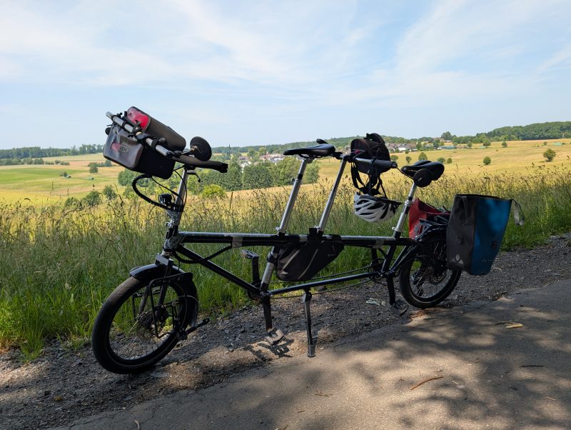 Zwei Tage später steht die Abkühlung kurz bevor. Das ist die Gelegenheit, mal wieder eine Tandem Wanderrunde auszuprobieren. Eine Strecke nah am Westerwaldsteig von Hilgenroth bis kurz vor Oberirsen. Dann über Ölsen und Birkenbeul über die Hügel mit Blick auf das Siegtal wieder zurück. Schiebe und Rollstrecken wechseln sich ab. Das Hinterrad hat lose sprechende Speichen, die Kurz vor Tourende nachgezogen werden müssen. Sonst ist noch etwas Spiel in manchen Lagern von Lenker und Sattel.