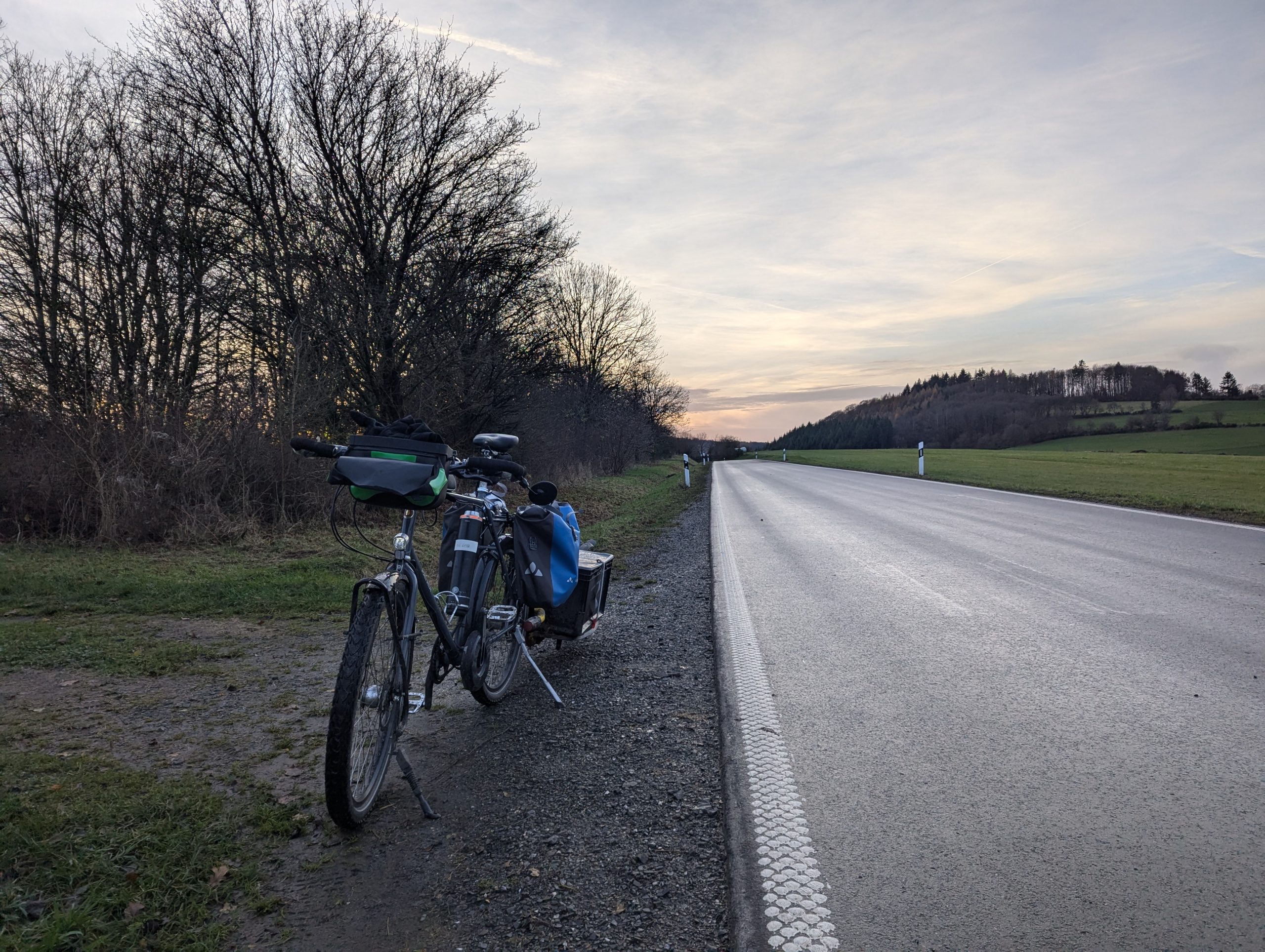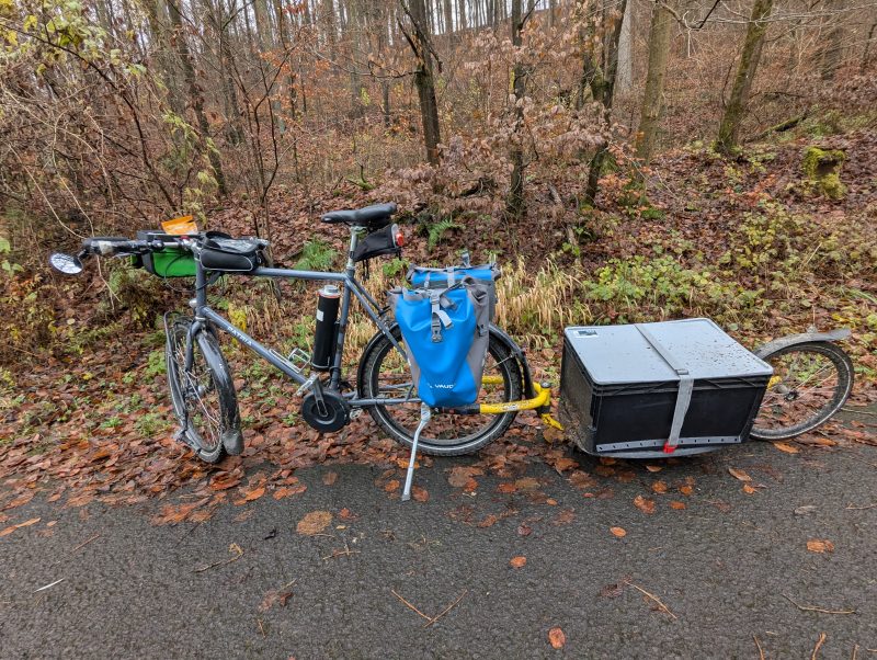 Der Anhänger war zu schwer beladen. Gewicht macht keinen Spaß und für 150 Tageskilometer ohne Schwitzen braucht man allein 9 kg Akku plus Motor. Als Trainingseinheit ok, wenn auch 50 Kilometer zu weit. Der Anhänger lief gut hinterher. Ist es kälter oder feuchter bin ich lieber nur 6-8 Stunden mit leichterem Gepäck unterwegs. Radreisen im Winter, das wird wohl nichts mehr in diesem Leben.
