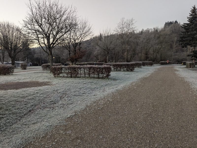 Es ist warm und ein verlängertes Wochenende und der Niederschlag der letzten Tage hat einen hohen Halmstand erzeugt. Mit Autoanfahrt sind es 8,5 Stundenbis zum Platz und für eine Rasenrunde ist es schon zu spät. Der Platz ist voll und die Kinder rudeln über die Wege. Daher erst am nächsten Morgen um 9 die Halme gekürzt, so gut es ging, es hatte leider des Nachts ordentlich getaut.