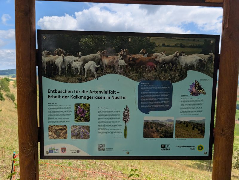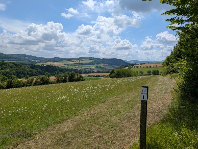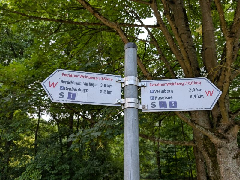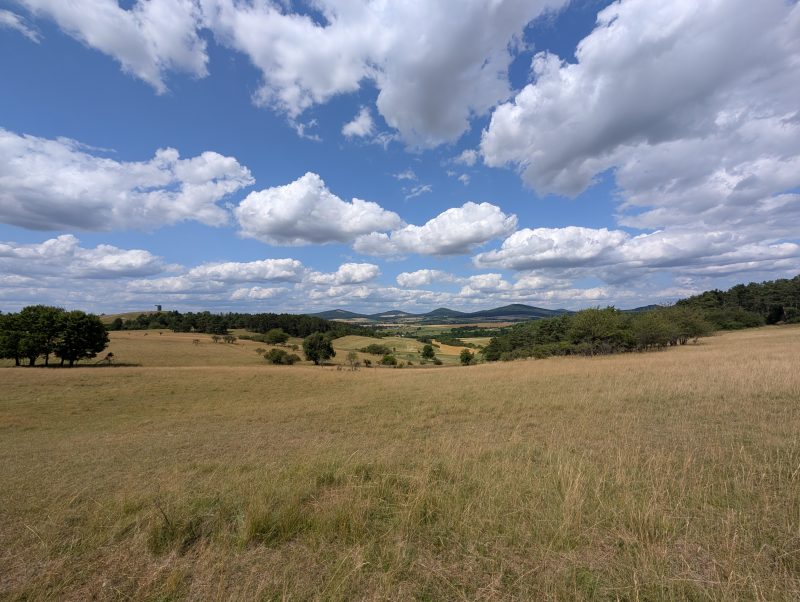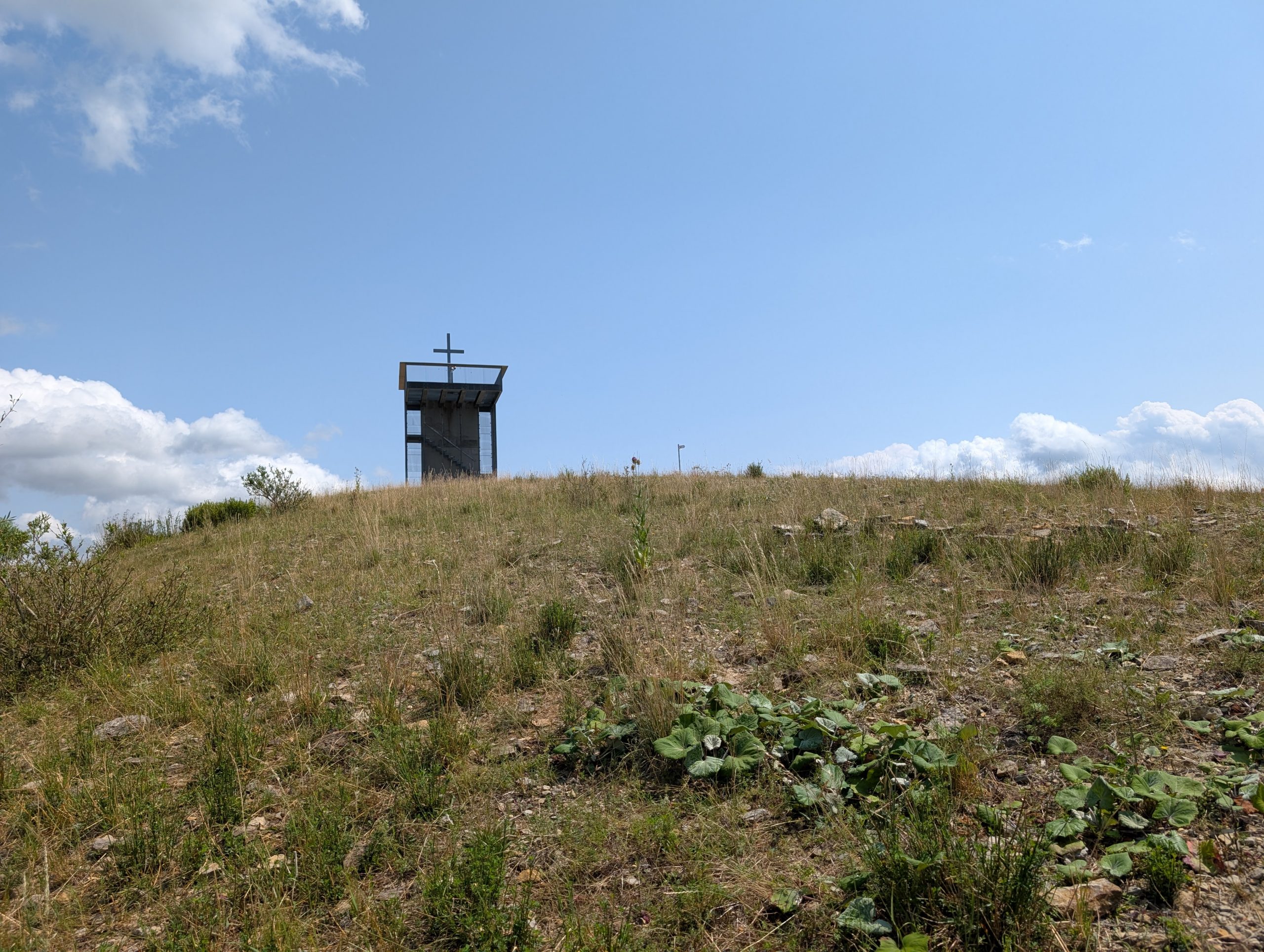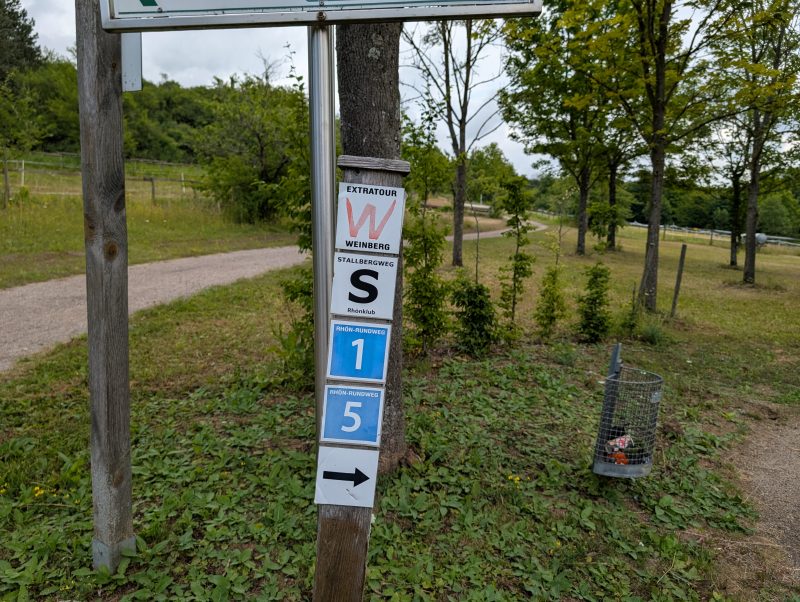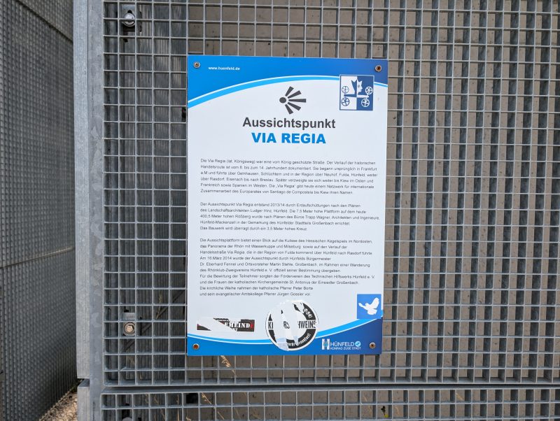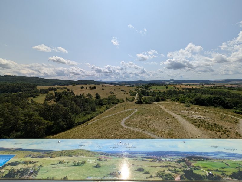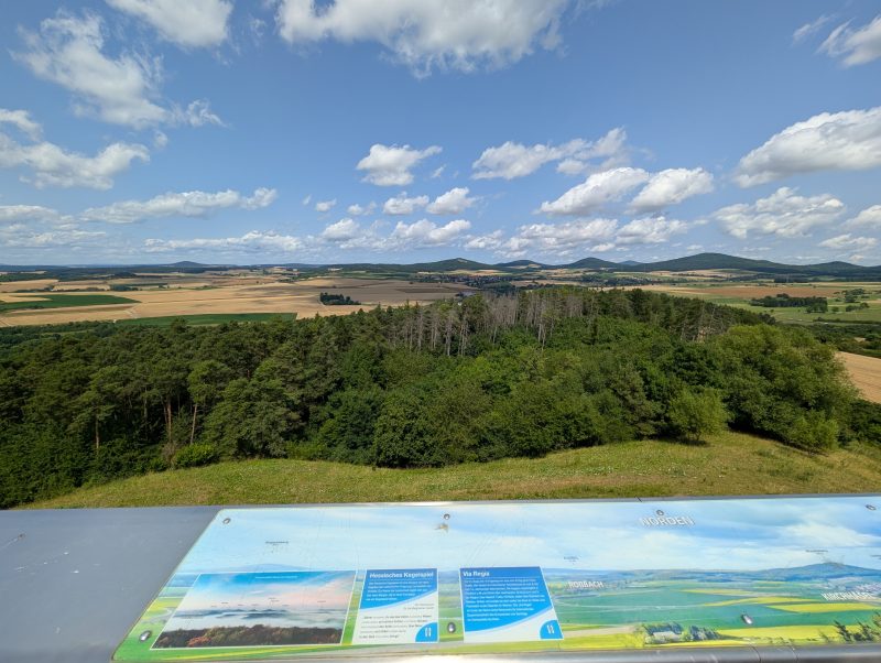 Startpunkt der Tour ist ein großer Parkplatz am Freibad und Messegelände in Hünfeld. Von hier aus folgen wir der ausgeschilderten “Extratour Weinbergroute”. Zuerst geht es den Berg hinauf zum Aussichtspunkt “Viva Regia” auf dem Roßberg. Die Aussicht von hier aus ist schon sehr beeindruckend. Weiter führt der Wanderweg in einer großen Runde um den Weinberg zum Ausblick auf die Basaltberge des Hessischen Kegelspiels und wieder zurück nach Hünfeld. Prägend für diese Runde sind auch die mediterran anmutenden Kalkrasenflächen auf den wir sogar einen Schwalbenschanz sehen konnten.