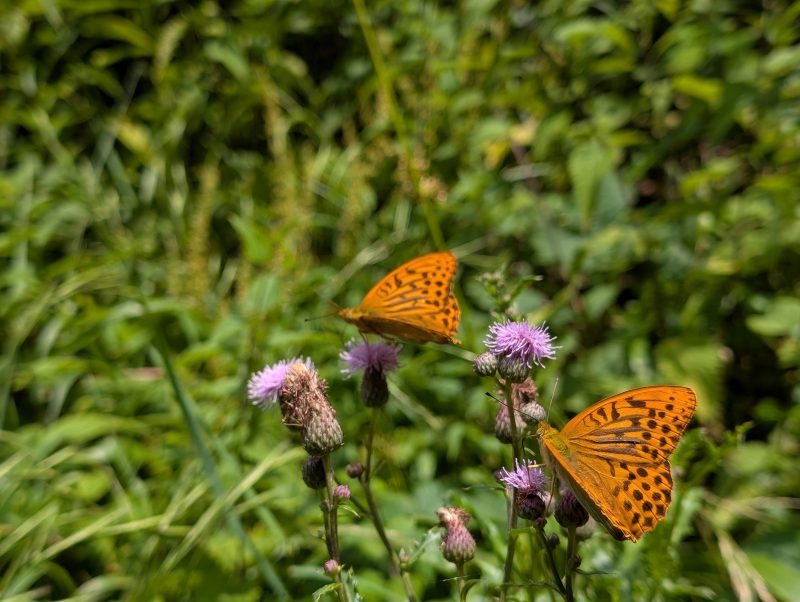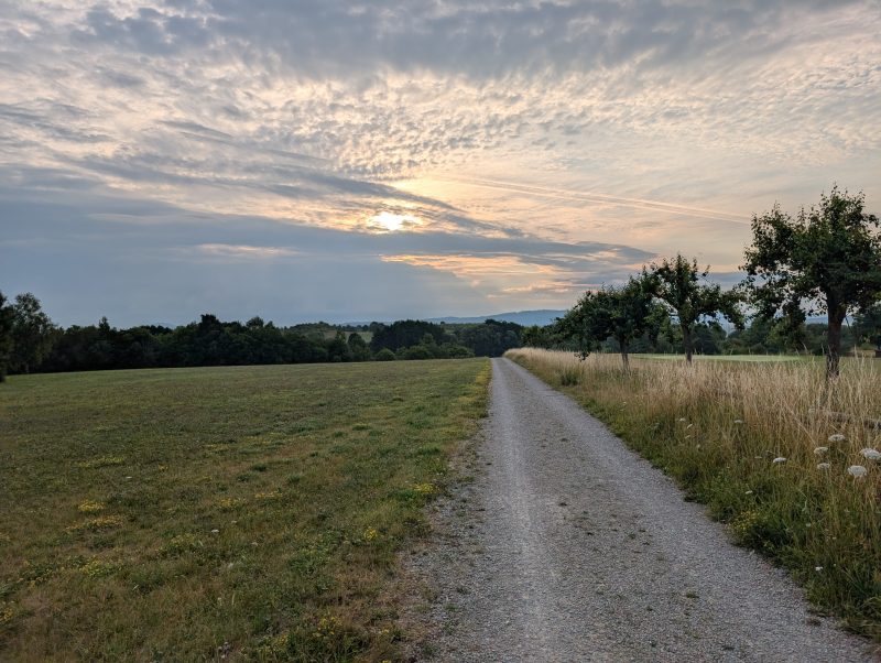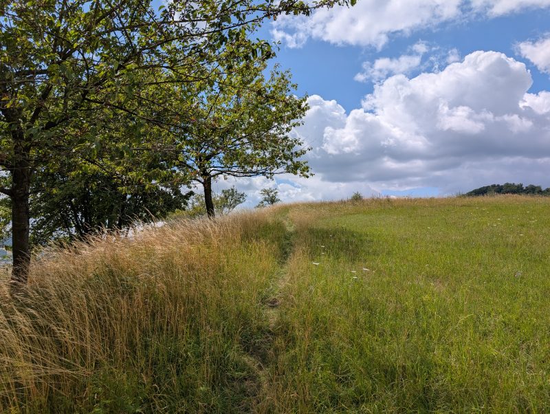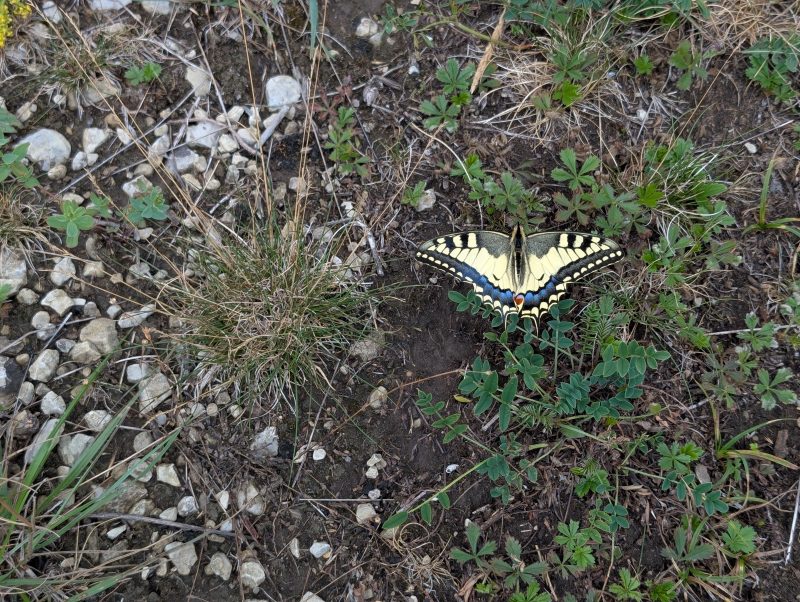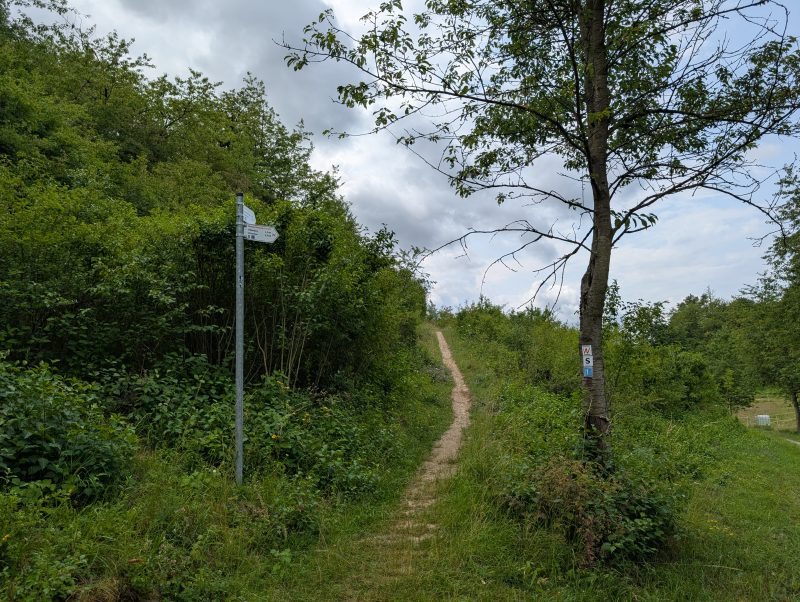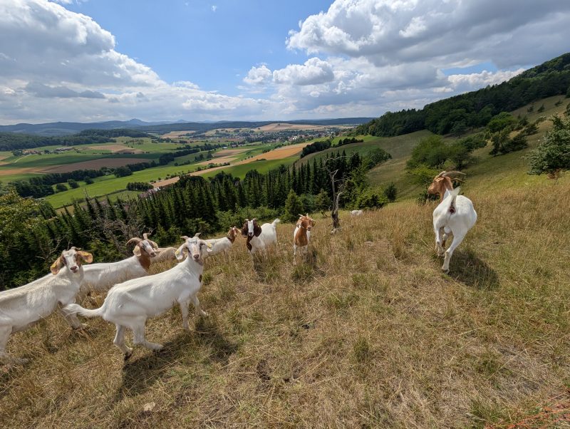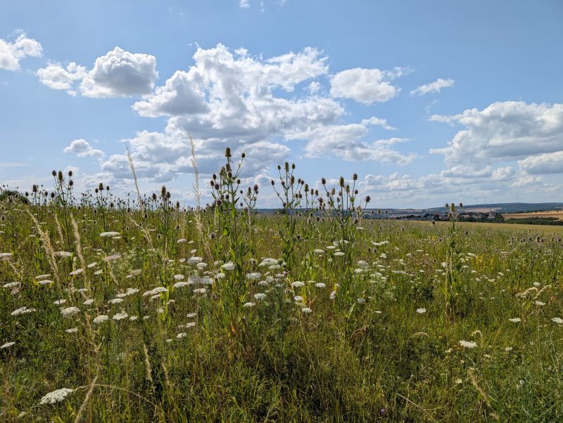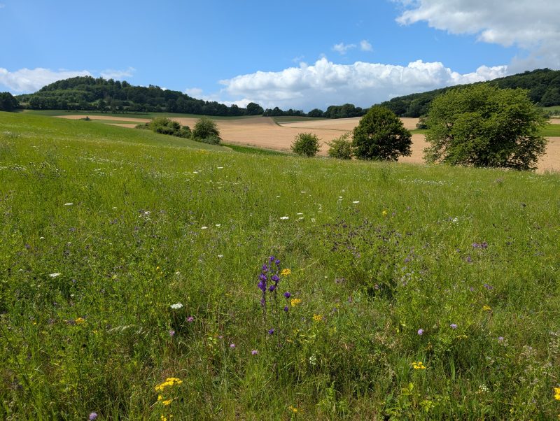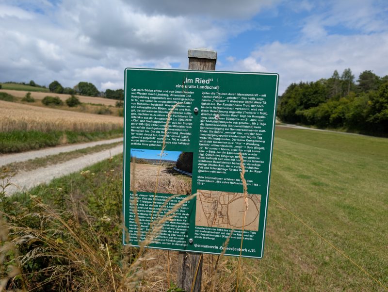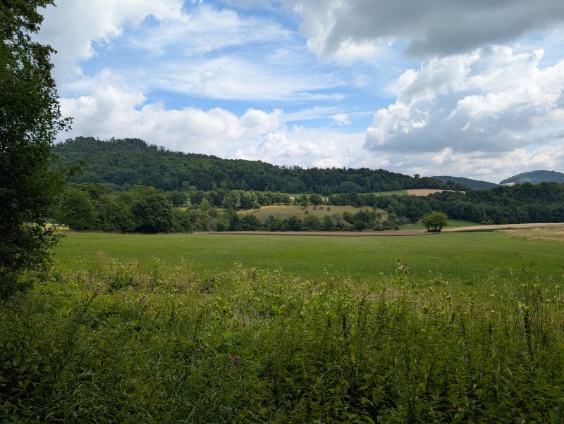 Startpunkt der Tour ist ein großer Parkplatz am Freibad und Messegelände in Hünfeld. Von hier aus folgen wir der ausgeschilderten “Extratour Weinbergroute”. Zuerst geht es den Berg hinauf zum Aussichtspunkt “Viva Regia” auf dem Roßberg. Die Aussicht von hier aus ist schon sehr beeindruckend. Weiter führt der Wanderweg in einer großen Runde um den Weinberg zum Ausblick auf die Basaltberge des Hessischen Kegelspiels und wieder zurück nach Hünfeld. Prägend für diese Runde sind auch die mediterran anmutenden Kalkrasenflächen auf den wir sogar einen Schwalbenschanz sehen konnten.