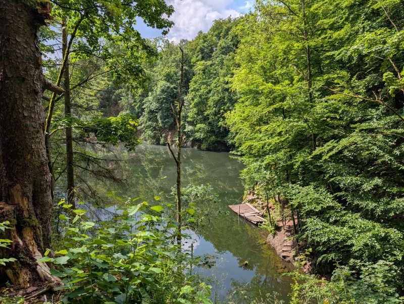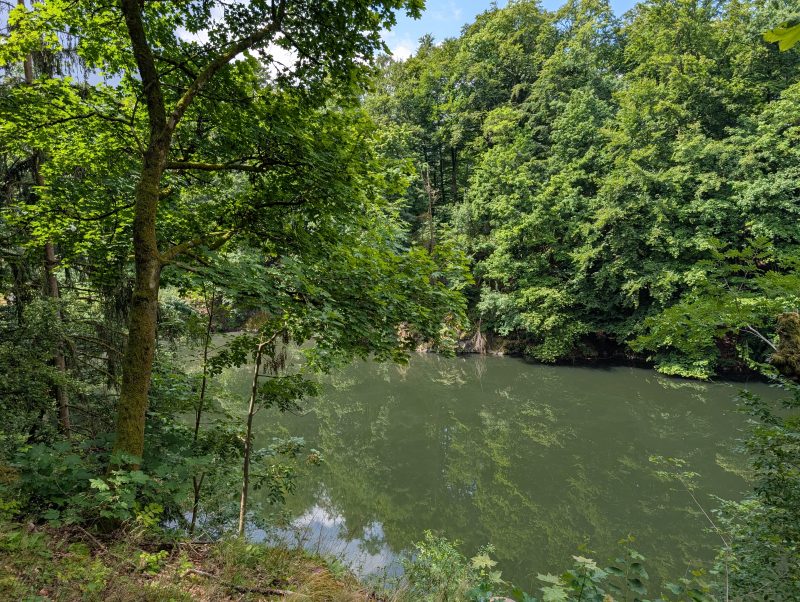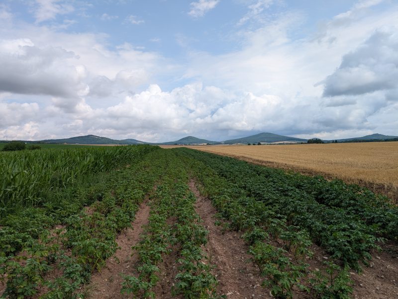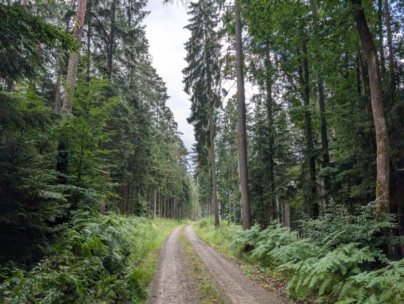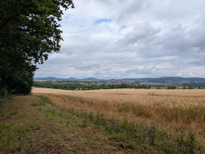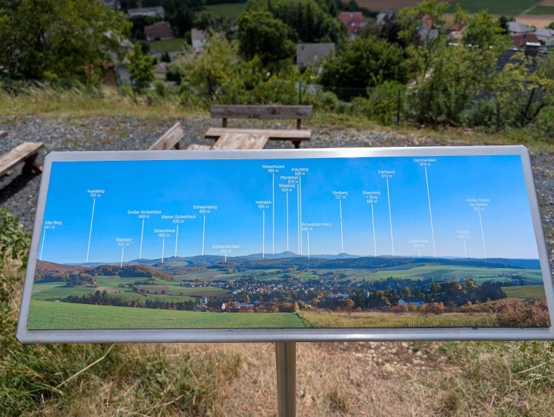 Vom Campingplatz aus wandern wir entlang der Praforst-Teiche in Richtung Oberfeld. Oberhalb von Oberfeld hat man eine gute Aussicht ins Hinterland. Dann führt uns der Weg in den Wald hinein in einer großen Runde um die Hummelskuppe herum. Ein großer Teil des Wanderweges folgt auch der Beschilderung des Rhön-Rundweges “Petersberg 10”.
