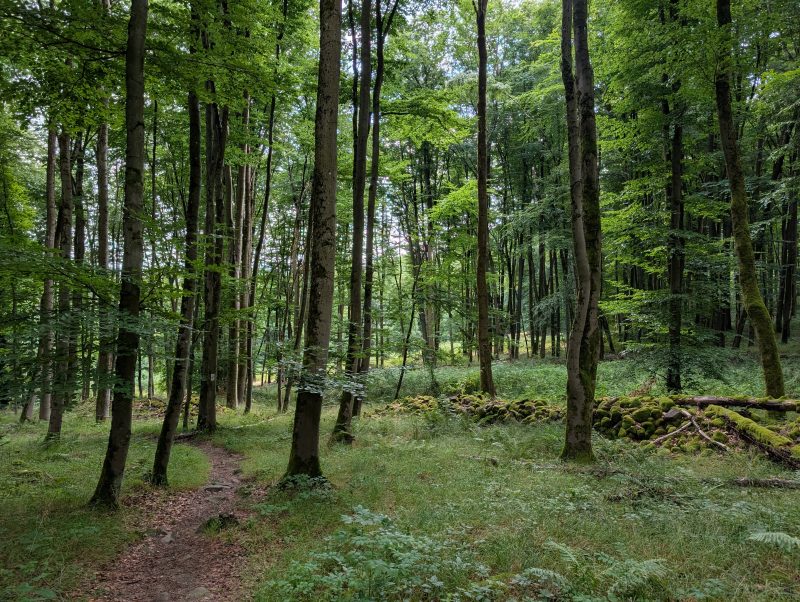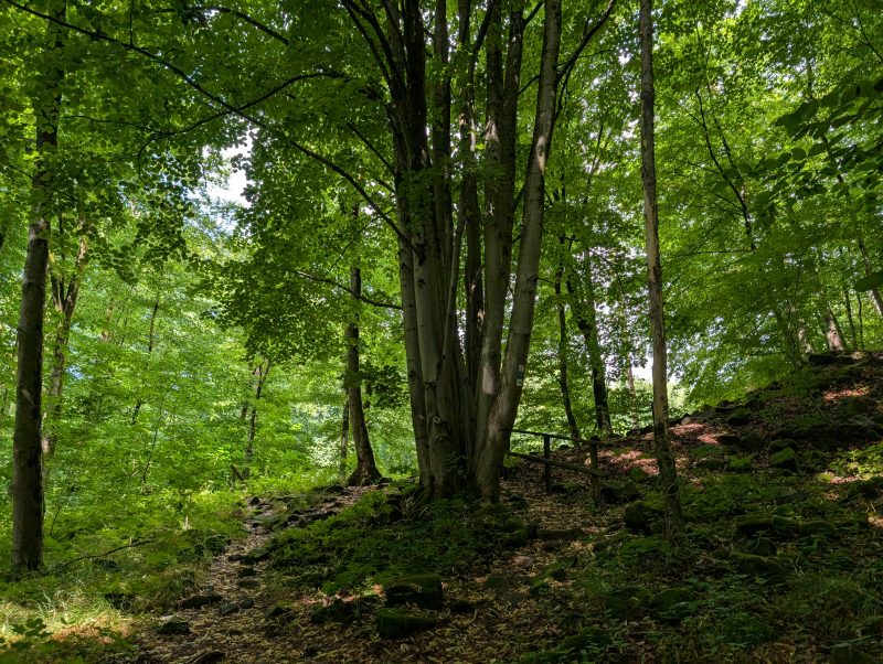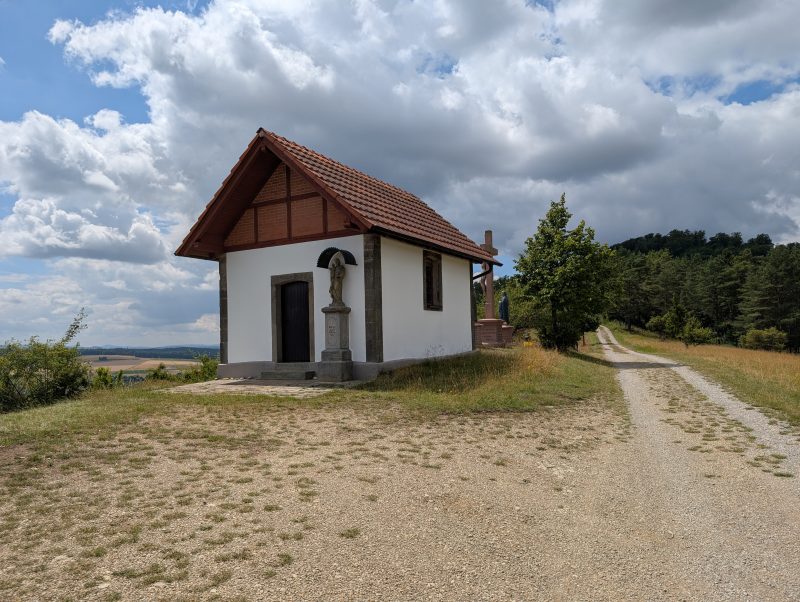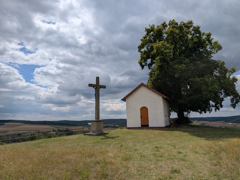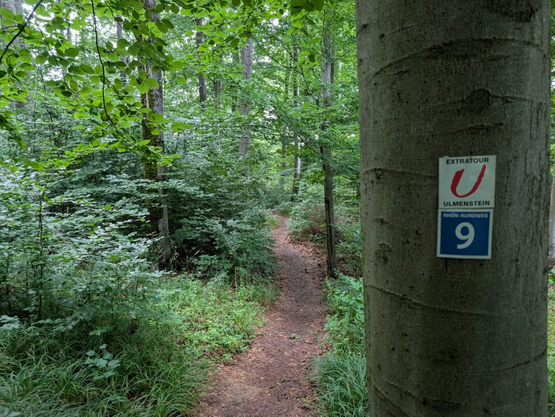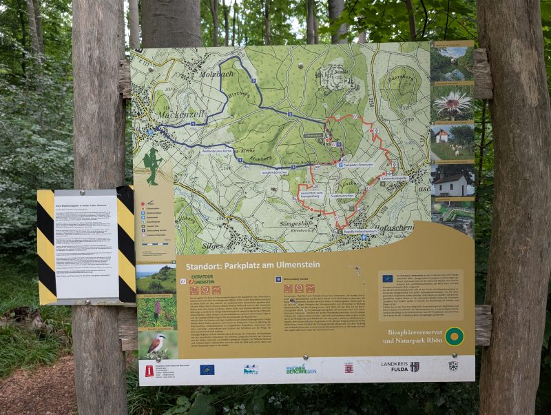 Unsere Extratour startet vom Wanderparkplatz am Ulmenstein. Dieser liegt oberhalb des Dorfes Hofaschenbach mit einer langen engen Zufahrt vom Dorf auf. Die Wanderung führt zuerst an dem Ulmensteinsee vorbei, der durch den Basaltabbau entstanden ist. Hinunter durch den Wald führt der Wege anschließend durch abwechslungsreiches Offenland, Felder, Äcker und Streuobstwiesen. Auch hier gibt es wieder mediterran anmutende Kalkrasenflächen, auf der viele Schmetterlinge einschließlich des Schwalbenschwanzes zu beobachten sind. Viele Rastplätze mit schönen Aussichten sind auf der Strecke und es geht auch vorbei an 2 Kapellen, der Laurentius-Kapelle und der Linsbergkapelle.