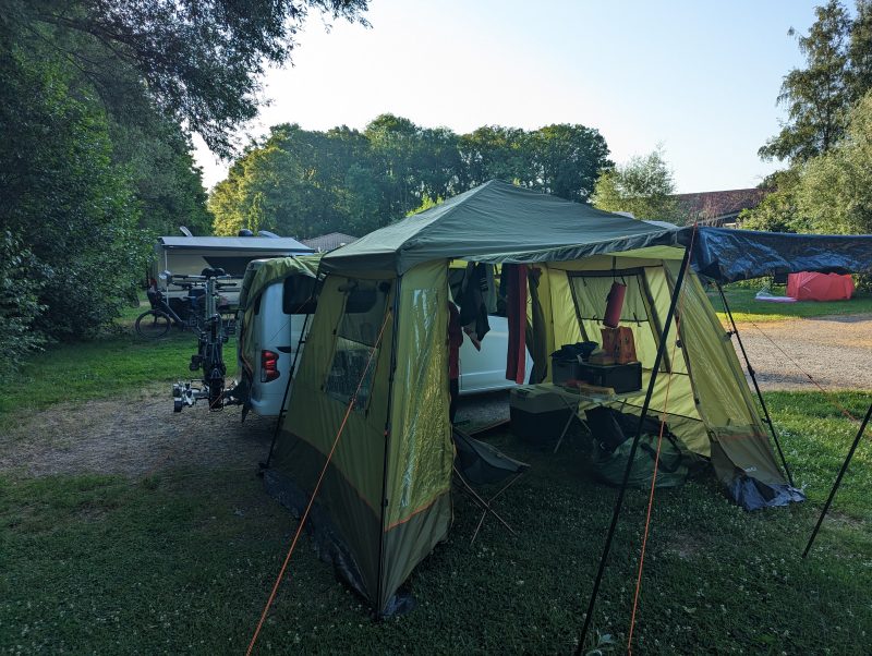 E-Auto mit Zelt geht, aber im Zelt spürt man die Umgebungsbedingungen deutlich mehr als im Van oder Wohnwagen. Schlamm, Regen, laute Nachbarn, man ist allem unmittelbarer ausgeliefert. Schlafen auf dem Luftbett war ok, aber mit dem Bett im Wohnwagen nicht vergleichbar. Taunässe am Morgen war heftig, wegen Bachnähe war die Luftfeuchtigkeit am Morgen hoch. Es hat vom Außenzelt auf das Innenzelt getropft und von da auf die Schlafstatt. Nicht so angenehm. Am kältetesten Tag mit acht Grad gab es unangenehm kalte Finger.