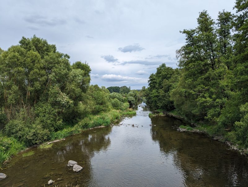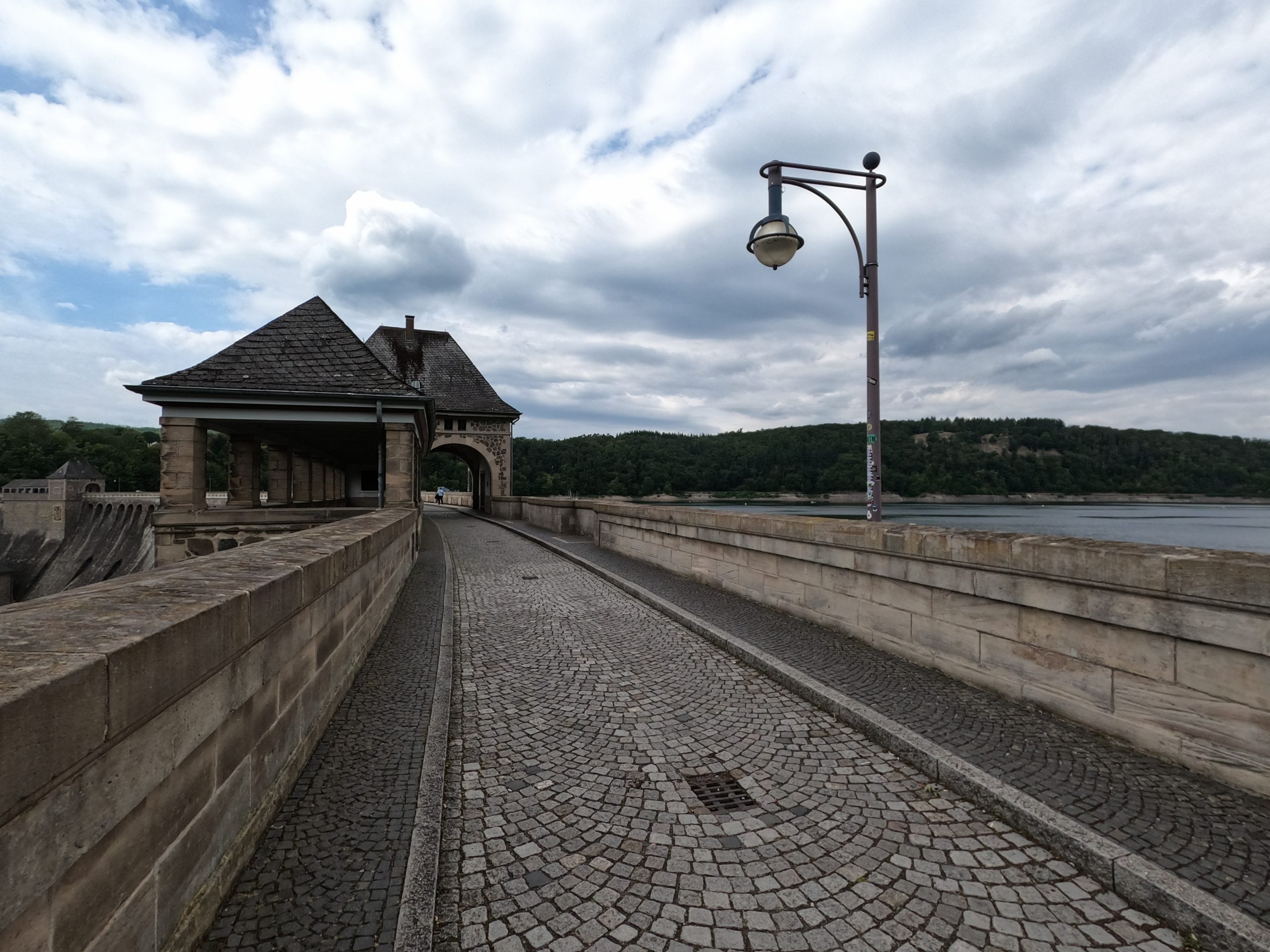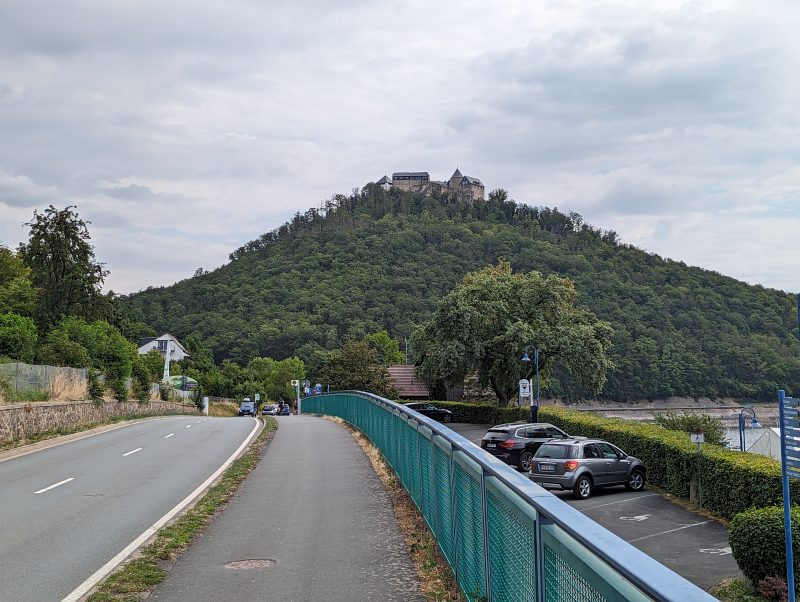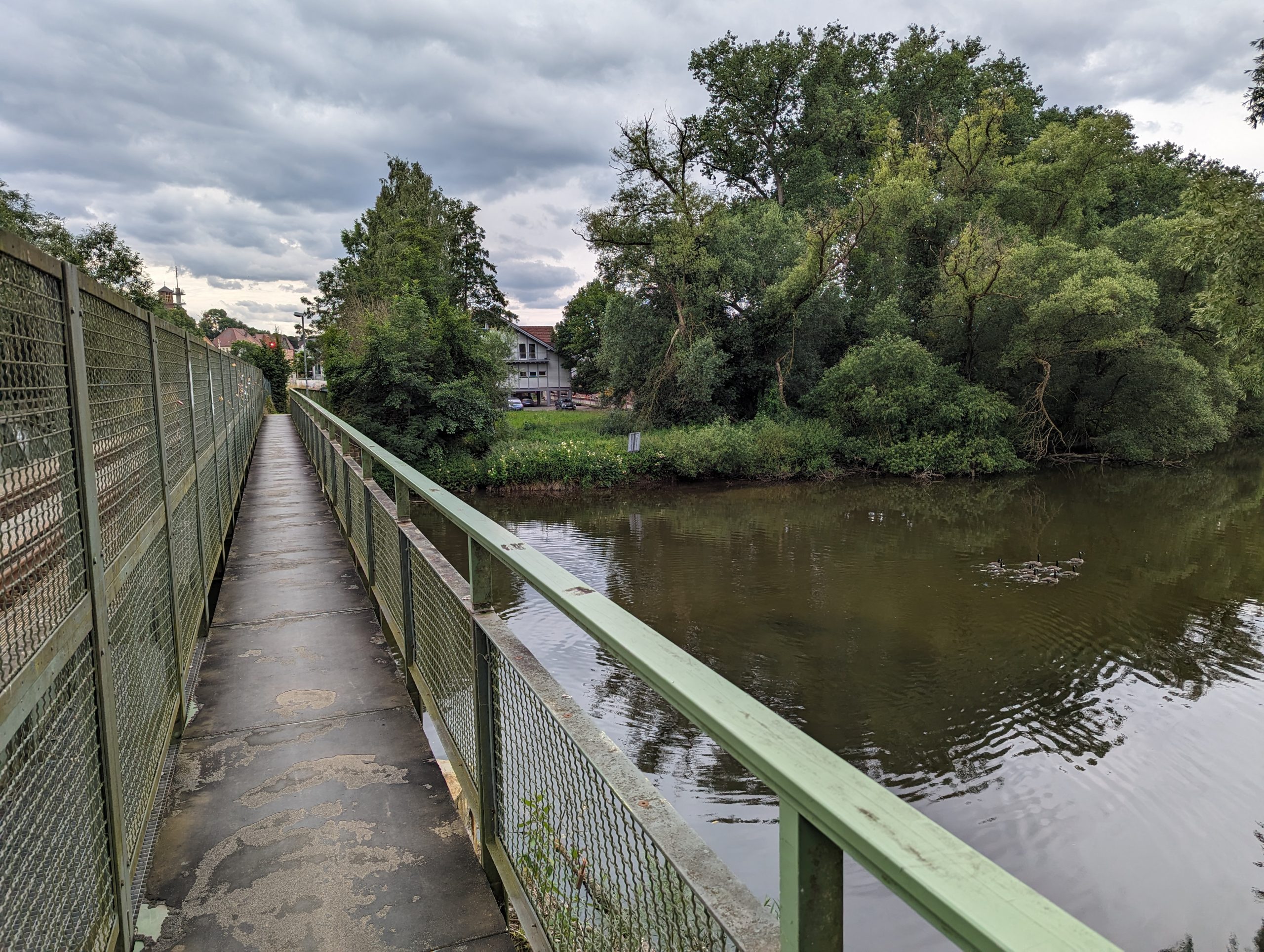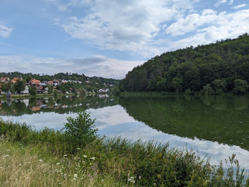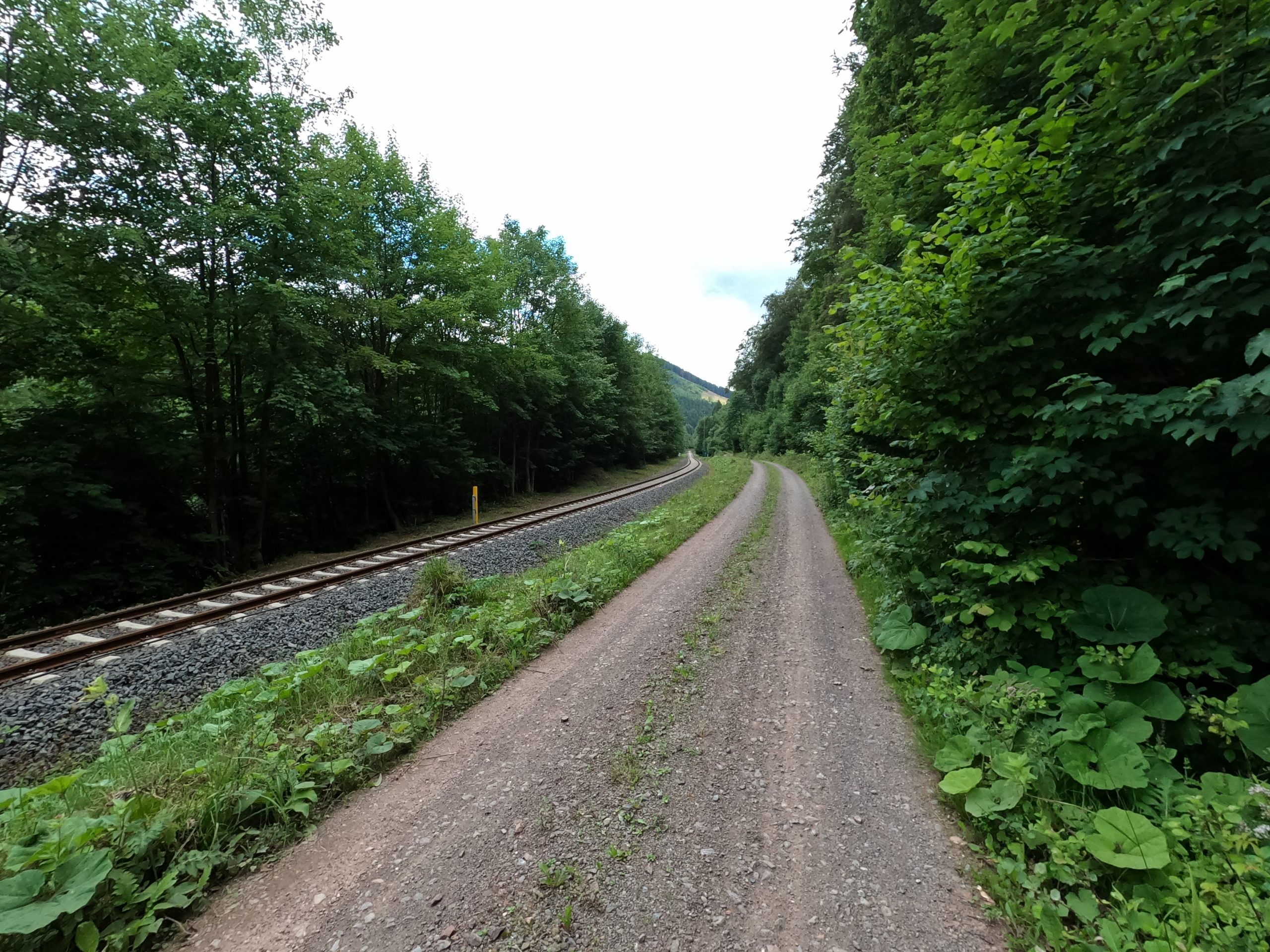 Der Radweg entlang der Eder war abwechslungsreich, mal Straße, mal Bahnlinie oder breite geteerte Weege durch die Talauen. Ruhig und schön, bis auf einen ersten heftigen aber kurzen Gewittergruß, bei dem sich der mitgeschleppte Schirm durchaus bewährt hat. Bei dem schwülwarmen Wetter war der Gedanke an eine zusätzliche Kleidungsschicht schwer zu ertragen.