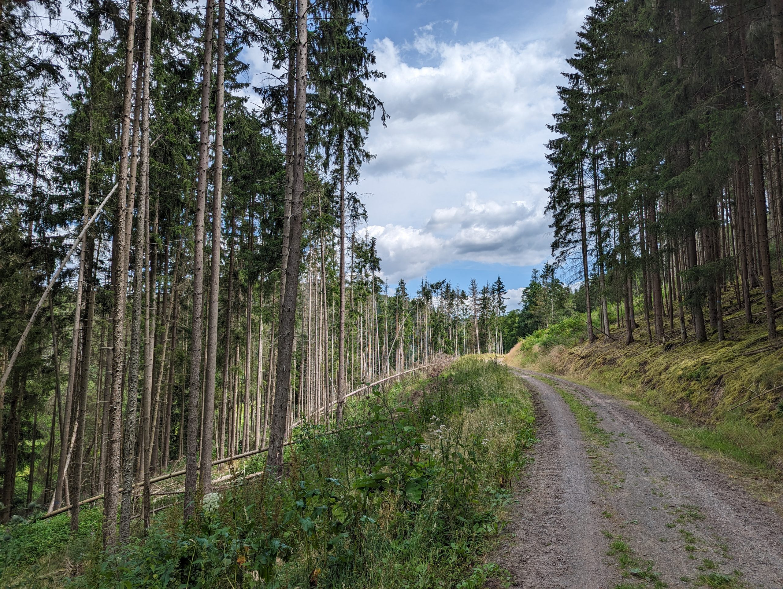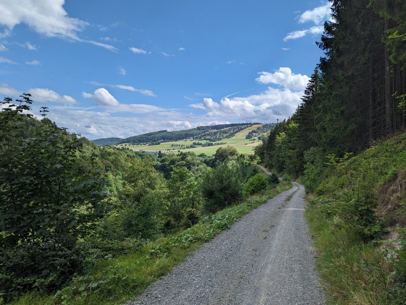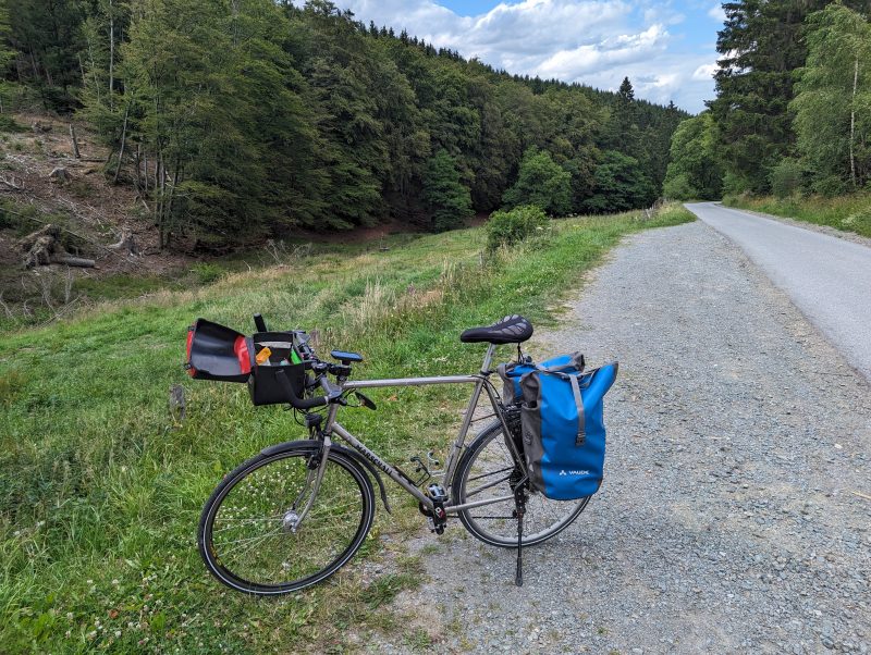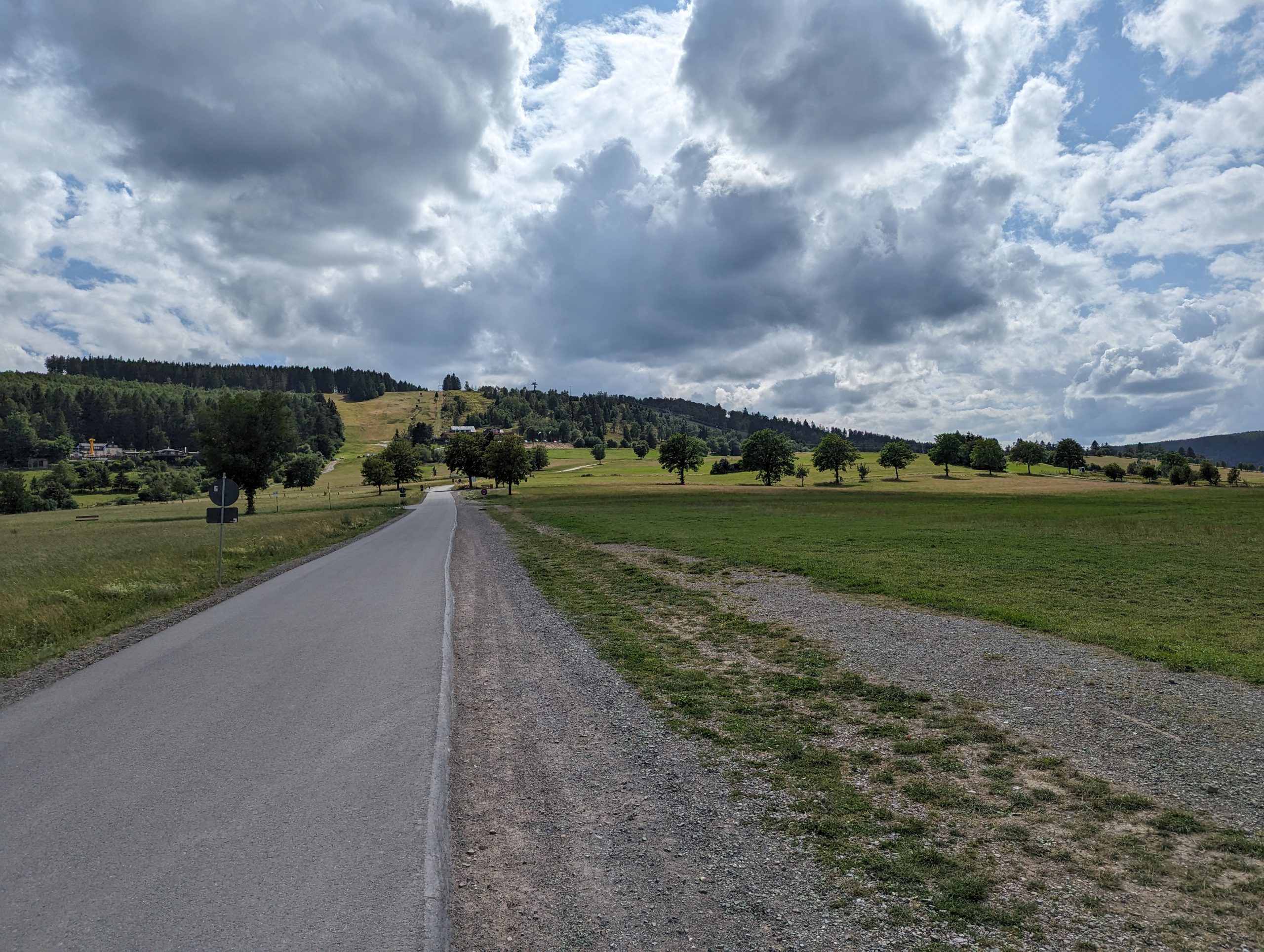 Erst mal räumen und abräumen und den Rest Müsli vertilgen. Wasser reicht noch bis hinter Winterberg. Der Anstieg, der noch kürzlich in Gegenrichtung mit dem Treckingrad als schotterig empfunden wurde, verteilte sich auf wenige Steilstücke und lange in höheren Gängen fahrbare Passagen.