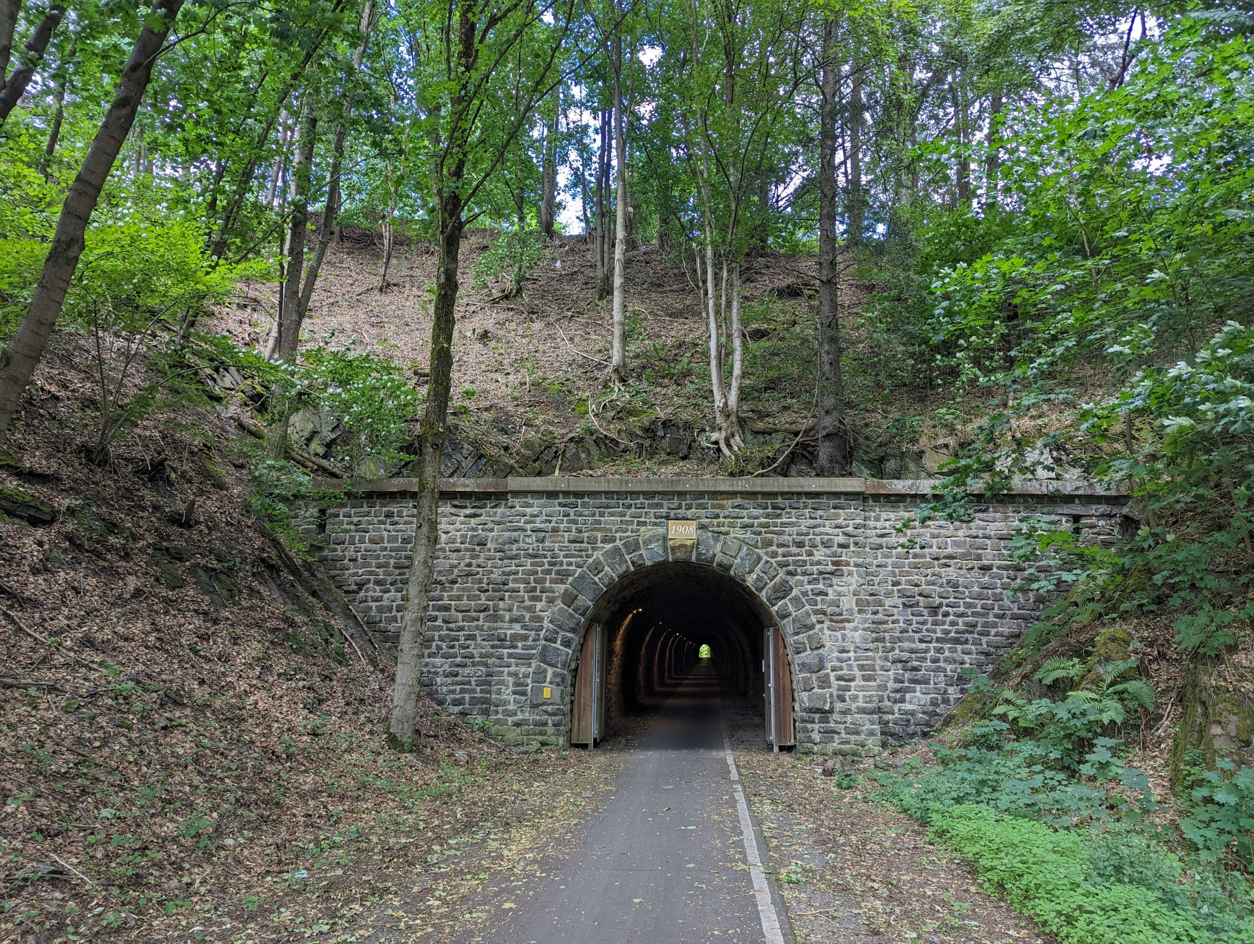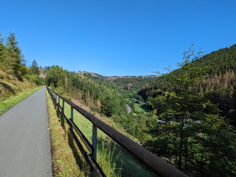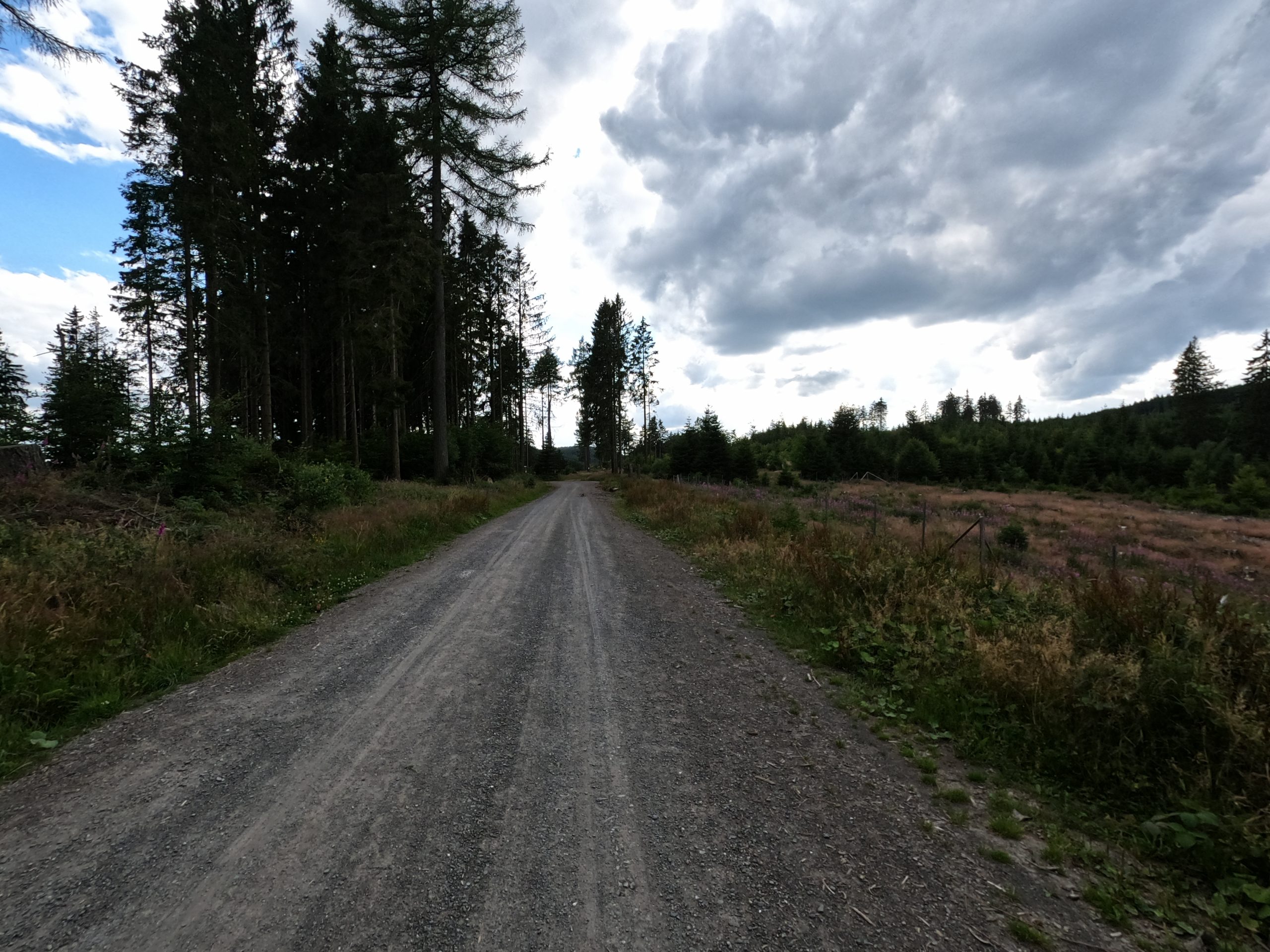 Erst mal räumen und abräumen und den Rest Müsli vertilgen. Wasser reicht noch bis hinter Winterberg. Der Anstieg, der noch kürzlich in Gegenrichtung mit dem Treckingrad als schotterig empfunden wurde, verteilte sich auf wenige Steilstücke und lange in höheren Gängen fahrbare Passagen.