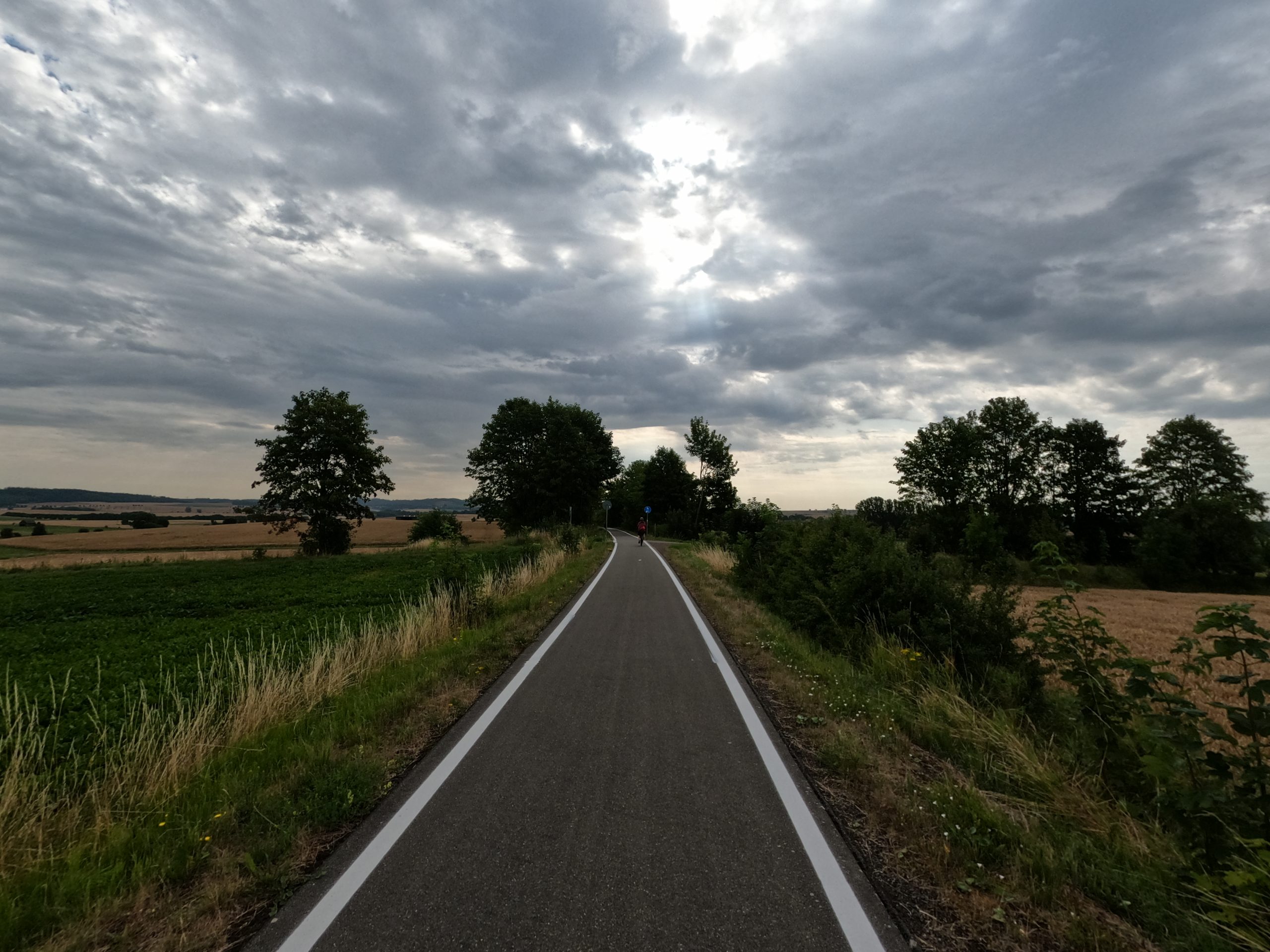 Die Gegenanstiege auf dem Radweg nach Allendorf zeigten dann aber schon die Belastung der Beine durch die bisherige Strecke und der Kopf haderte mit dem tragen von Helm und Brille. Der Rucksack mit den Wertsachen war trotzt Beschwerung mit einer 1,5 Liter Wasserflasche und der Nachtfahrstrinlampe erstaunlicherweise kein Problem.