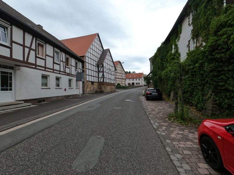Der nächste Bäcker ist in Niedenstein beim lokalen Edeka. Der Weg zieht erst schattig auf dem Bachtal hinauf, führt dann bald über die Felder nach Niedenstein. Im Ort geht es dann noch ordentlich bergauf bis oben auf dem Hügel der Lebensmittelmarkt erreicht ist.