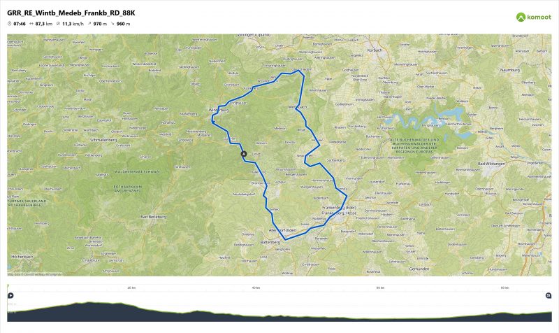 Die drei Schleifen im Kontext der Gesamttour als komoot Karte. Im Mittelteil zwischen Medebach und Korbach und zwischenFrankenberg und Kirchheim hätte man noch eine vierte Runde einfügen können. Dort ist die lila Route der GRR nicht von den Tracks der Radrunden überlagert.