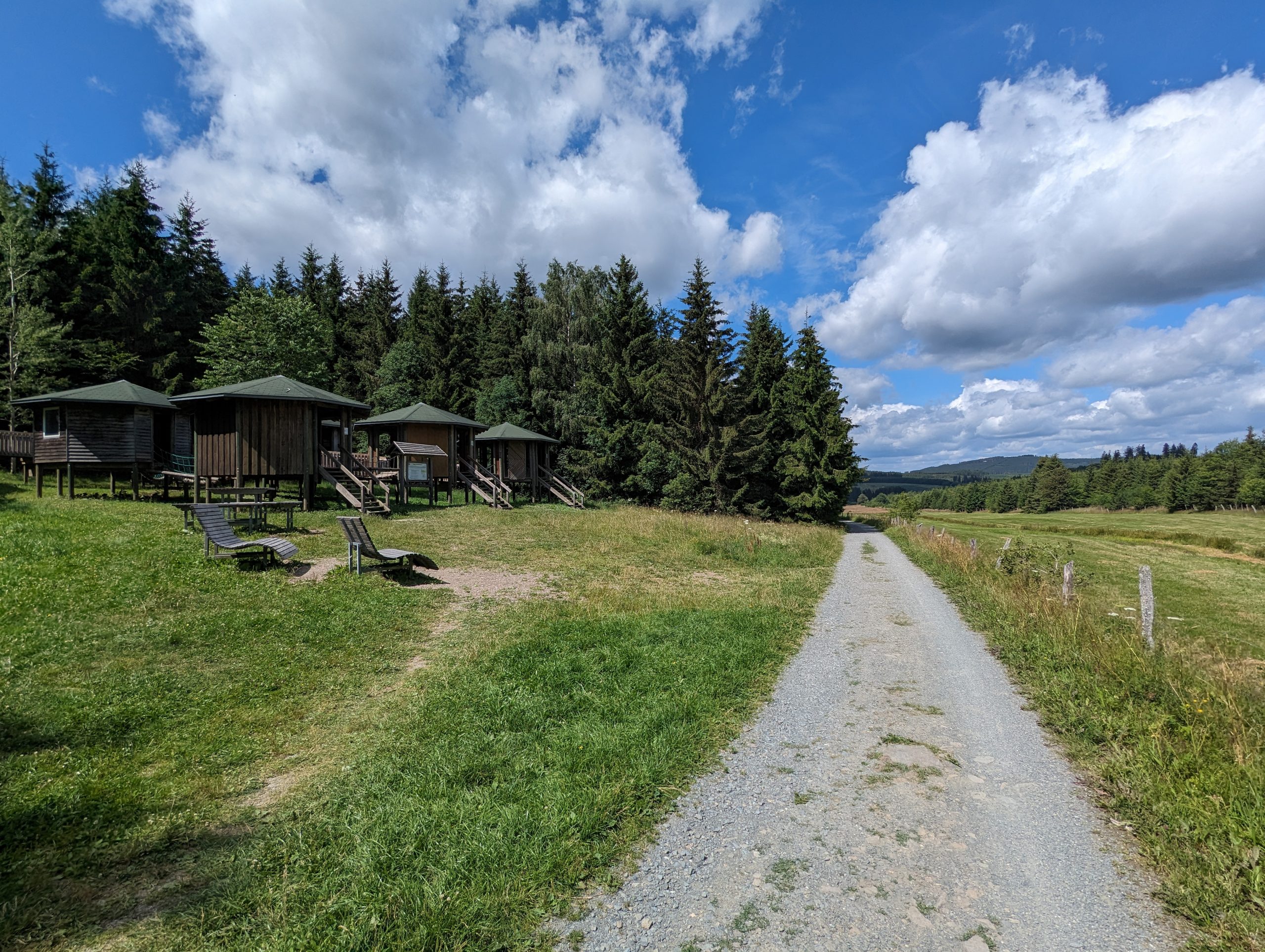 Mit Blick auf die Winterberger Skilifte zog sich dann aber der Schotterweg, bis die altbekannte Aussichtsbank mit freiem Blick nach Süden erreicht war. Die Sonne musste Zelt und Schlafsack trocknen und die Nahrungsvorräte wurden wegen der rollend erreichbaren Lebensmittellager auf der Abfahrt zur Eder ordentlich reduziert.