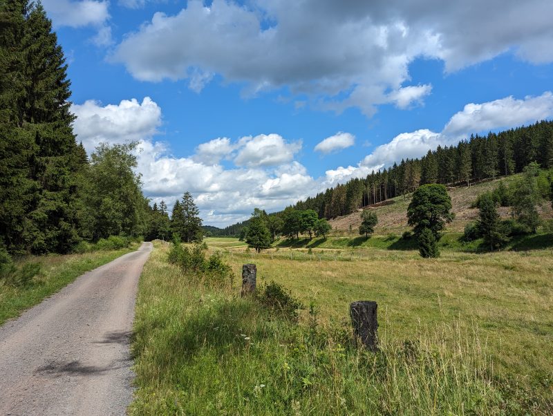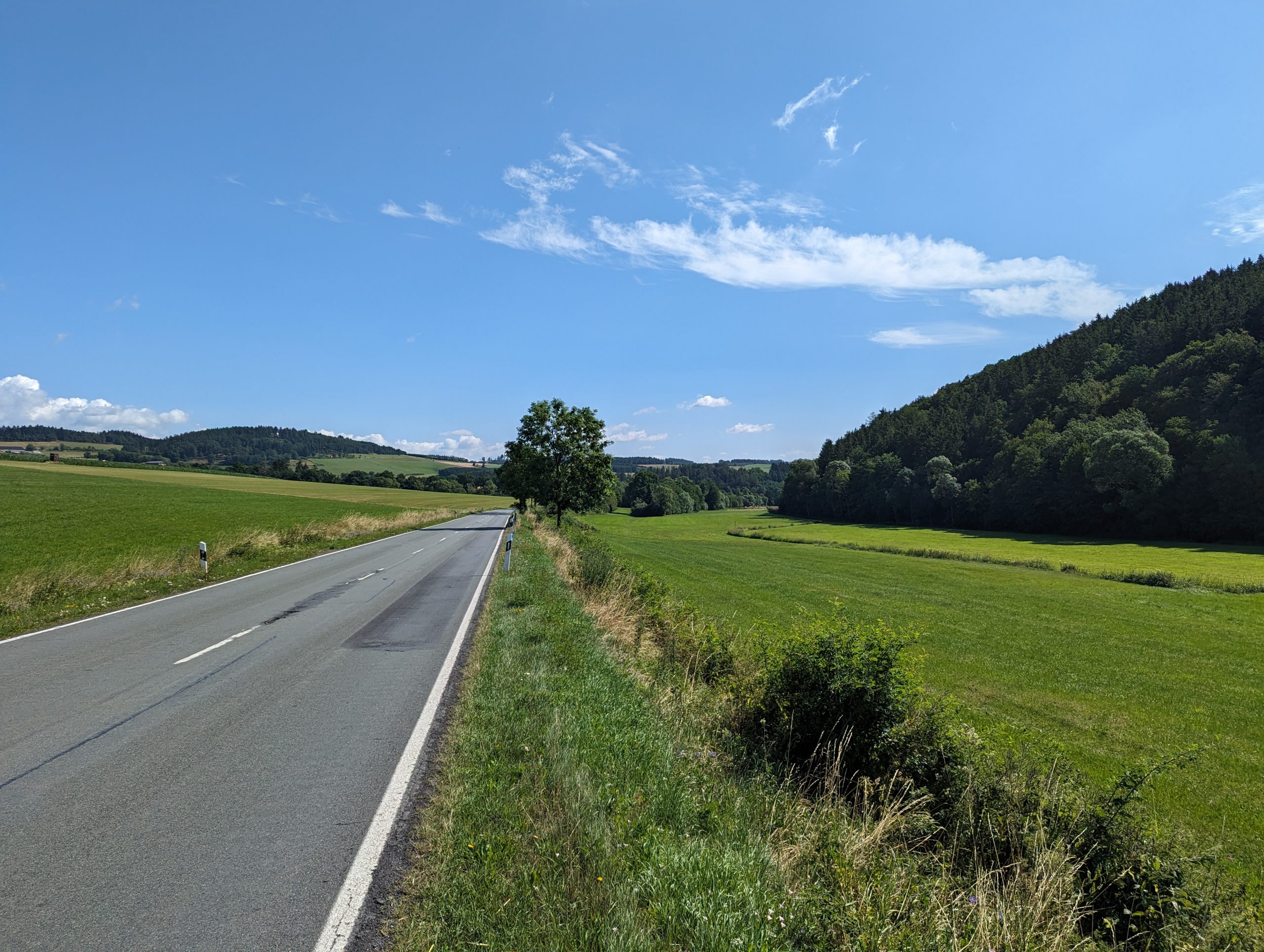 Wegen der verspäteten Abfahrt und der nach dem Regengebiet ungehindert leuchtenden Sonne wurde es sehr schnell sehr dampfig feucht. Die Sitzfläche zeigte deutliche Schleifs- und Druckspuren und Arm und Nachenmuskulatur waren nicht mehr vergnügt. Es ging zäh und langsam, wenn auch nicht steil bergauf parallel zur B253 auf einem gut ausgebauten Radweg, unterbrochen von Ortsdurchfahrten, die dafür Zugriff auf Getränke ermöglichten.