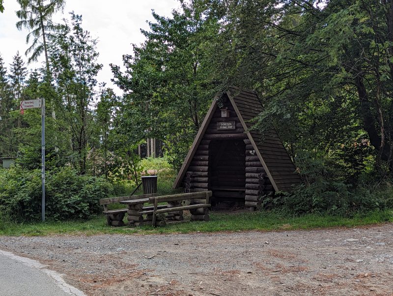 Ab Hatzfeld geht es dann mit dem hessischen Radferrnweg R8 über den Höhenzug des Lahn-Dill Berglandes. Eine kleine Straße führt parallel zum Anstieg des bekannten hessischen Skigebiet “Sackpfeife” bis auf 540 Meter. An der Passhöhe zwei Bänke und eine versteckte vergammelte Schutzhütte. Es ist erst Nachmittag, aber der Wetterbericht verspricht Regen in der Nacht und die Schutzhütte Schutz davor. Auf der weiteren Strecke Richtung Dillenburg wird es nicht so einfach sein, eine geschützte einsame Unterkunft zu finden.