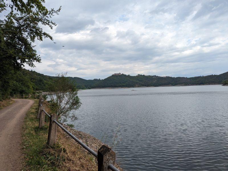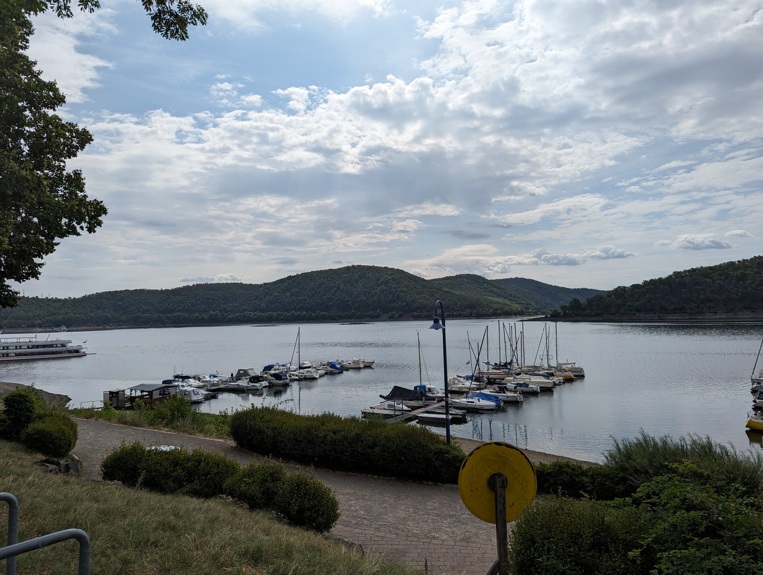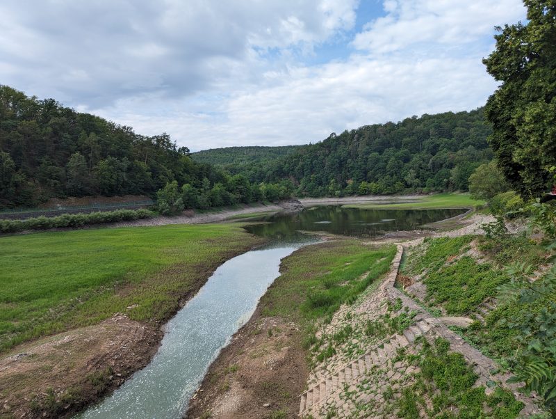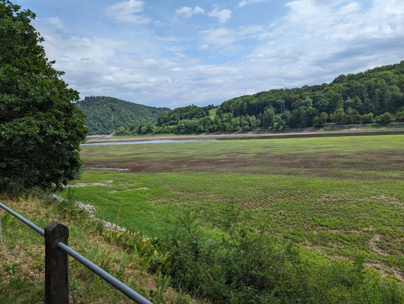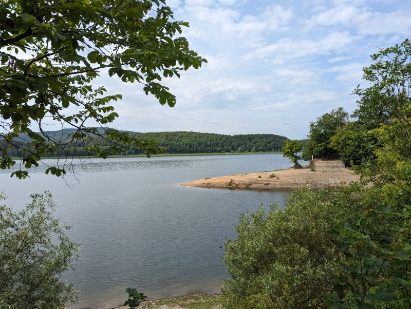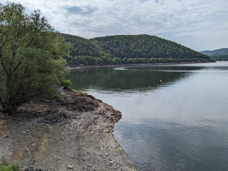Bei Korbach auf dem GRR nach Osten abgebogen geht es wieder auf einer alten Bahnstrecke zügig bis hinter Sachsenhausen. Dem Reiherbach folgt dann ein Weg hinab ins Edertal nach Nieder-Werbe, wo ein erster Zipfel des Edersees zu sehen ist. Der Wasserstand ist niedrig, was auf der ganzen Runde an den vielen Seezungen eine triste Stimmung hinterlässt.