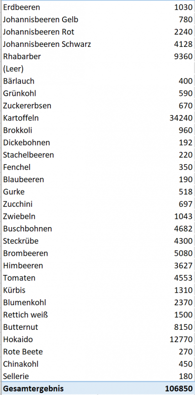 Das Gartenjahr 2024 war ein Jahr mit der größten Gemüseernte, die es jemals in Kunidorf gegeben hat. Trotz der relativ feuchten Witterung und der unglaublichen Schneckeninvasion war die Ernte überreich. Bis in den Dezember hinein konnte im Garten Gemüse geerntet werden. Erst in der letzten Woche des Jahres 2024 gab es Nachttemperaturen bis -6°C. Spannend wird es nun sein, welche Pflanzen diese Frostperiode überstanden haben. Hier ein Überblick zur Obst- und Gemüseernte im Jahr 2024. Alle Werte in Grammangaben. Nicht berücksichtig sind dabei diejenigen Gemüsearten, bei denen immer nur einzelne Blätter geerntet werden. Z.B. Grünkohl, Palmkohl, Mangold, Salat und auch Gewürzpflanzen.