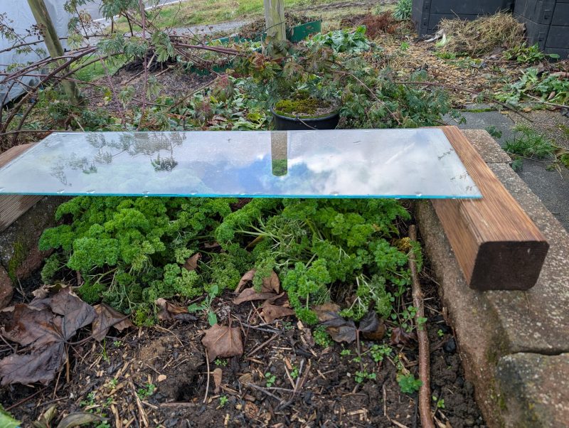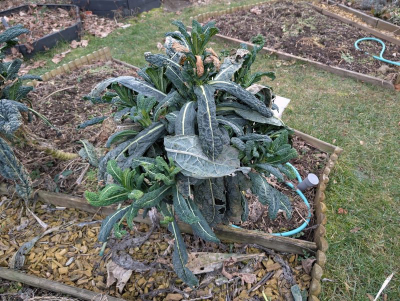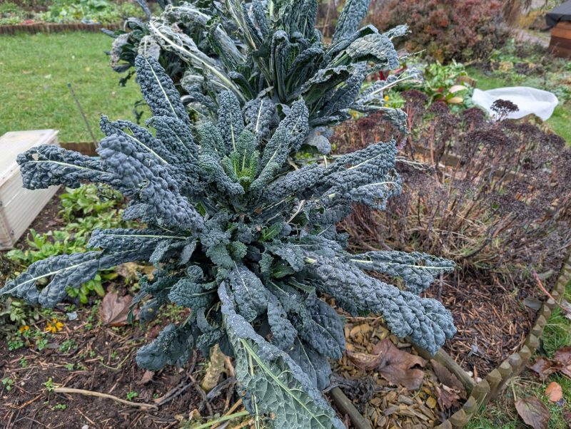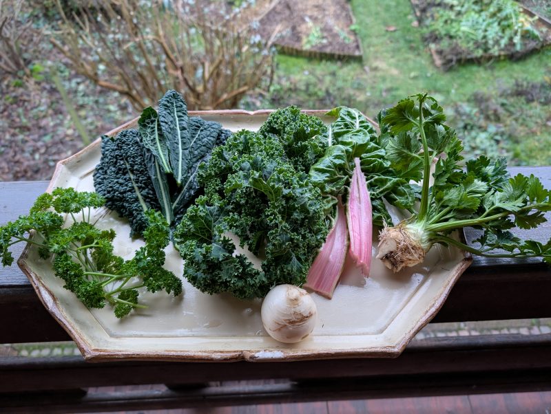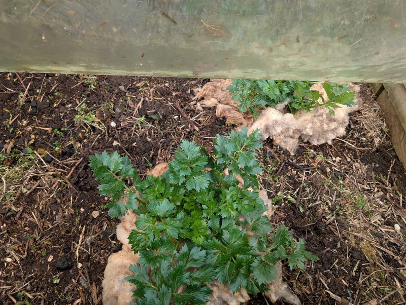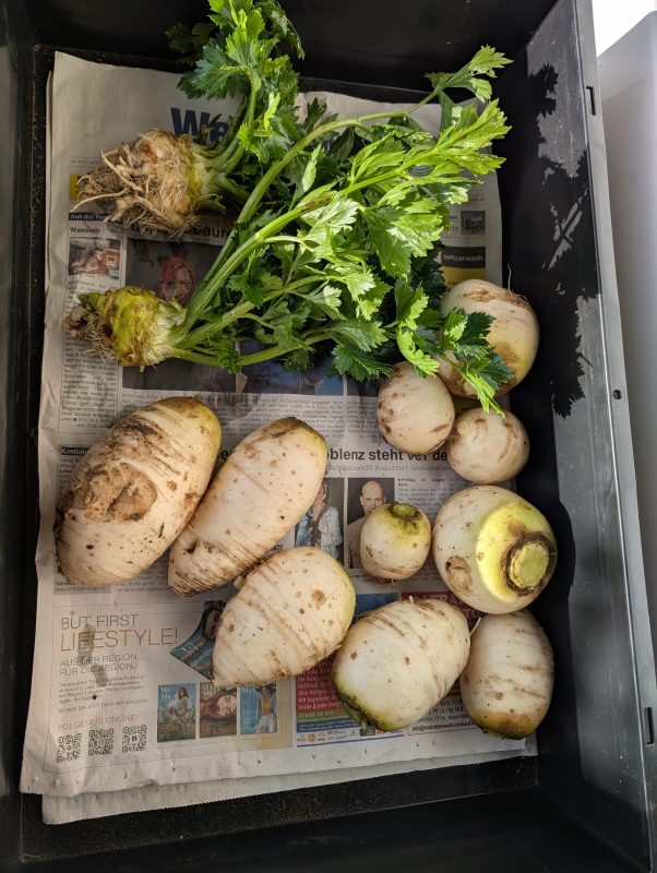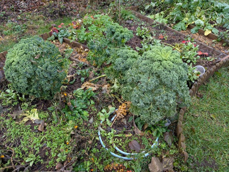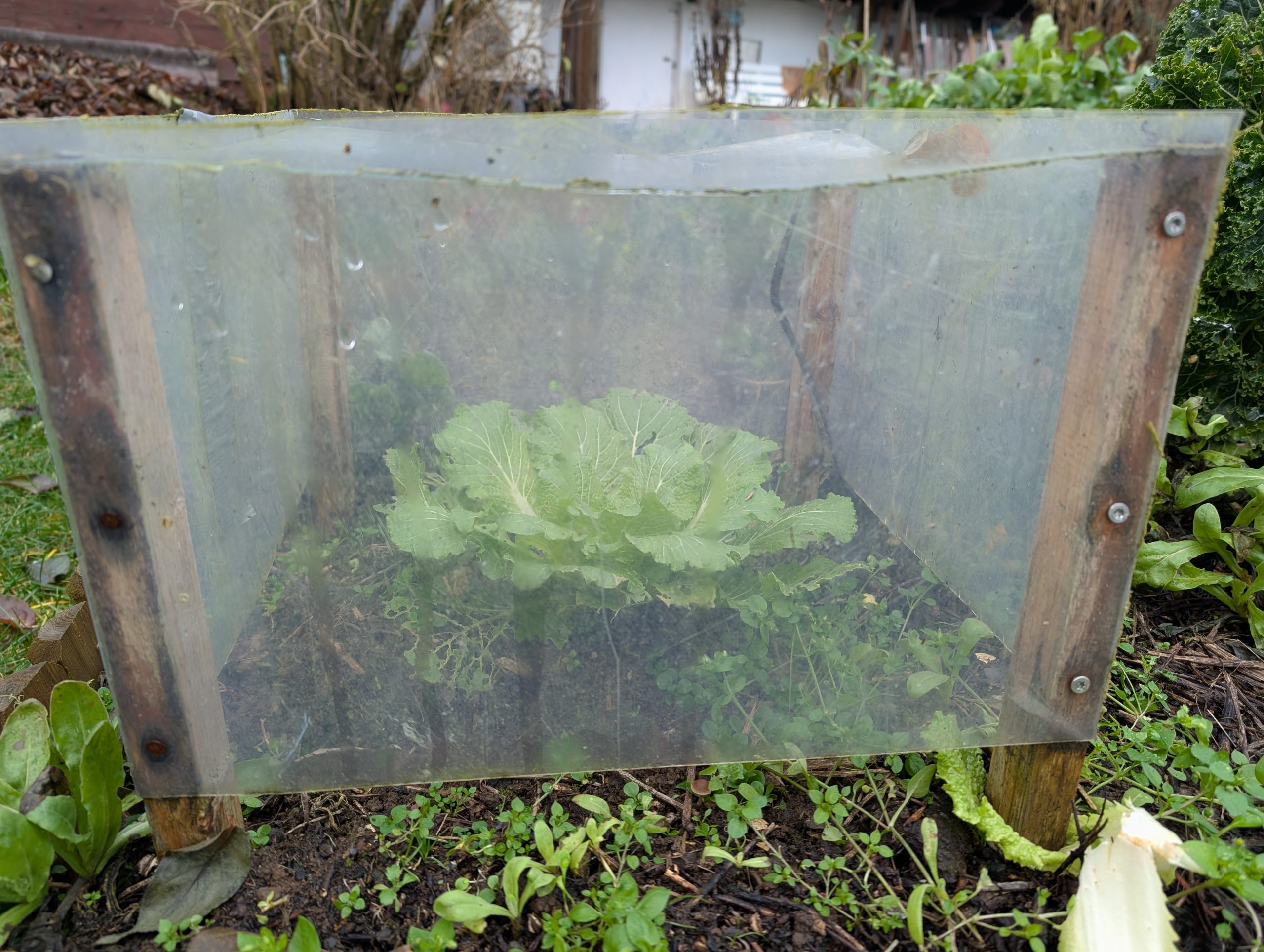 Aktuell gibt es noch folgende Gemüsesorten im Garten: Palmkohl, Grünkohl, Mangold, Sellerie und Weißer Rettich. Auch Petersilie ist noch vorhanden. Zum Teil wurden die Pflanzen aber auch mit einem Kälteschutz versehen, soweit das möglich war.