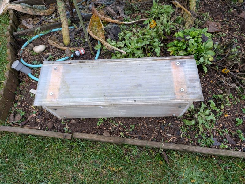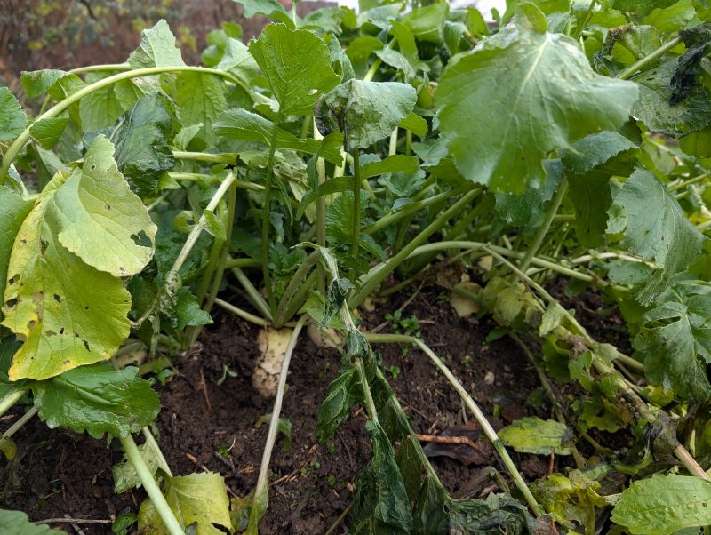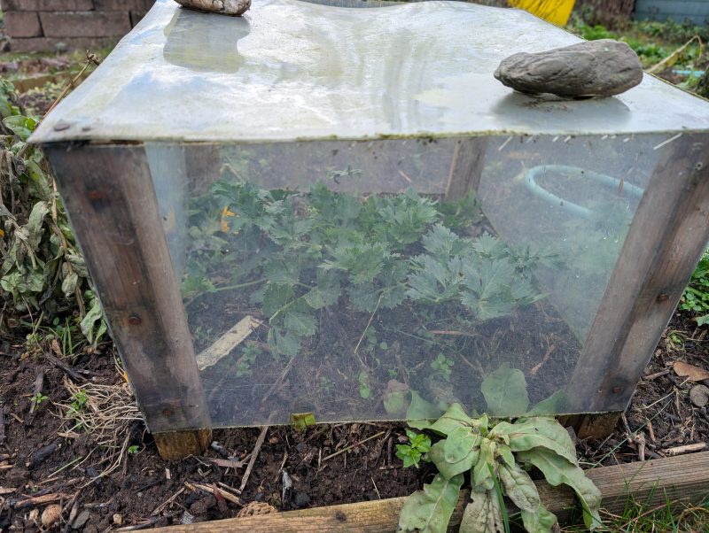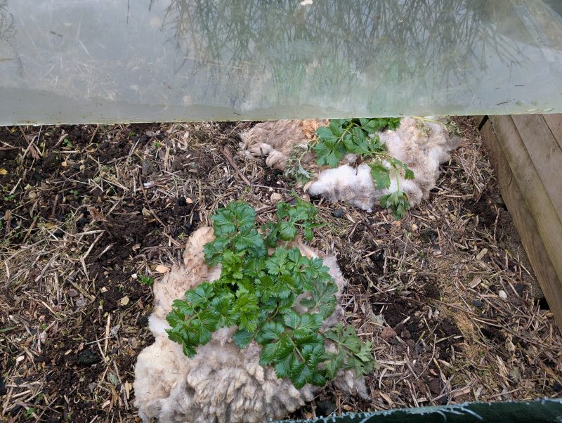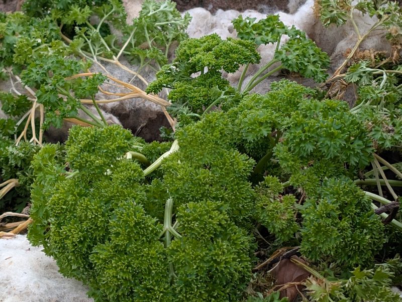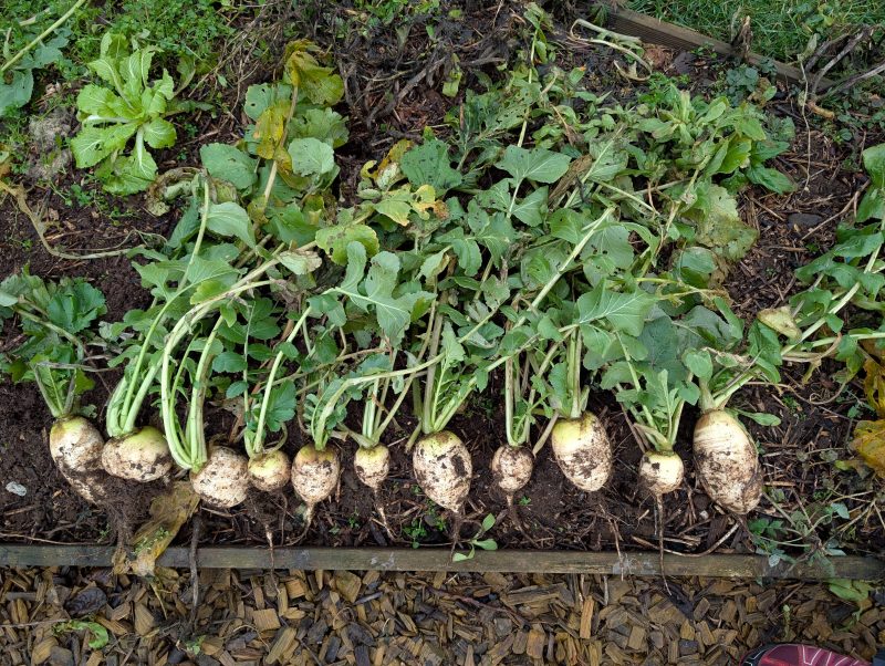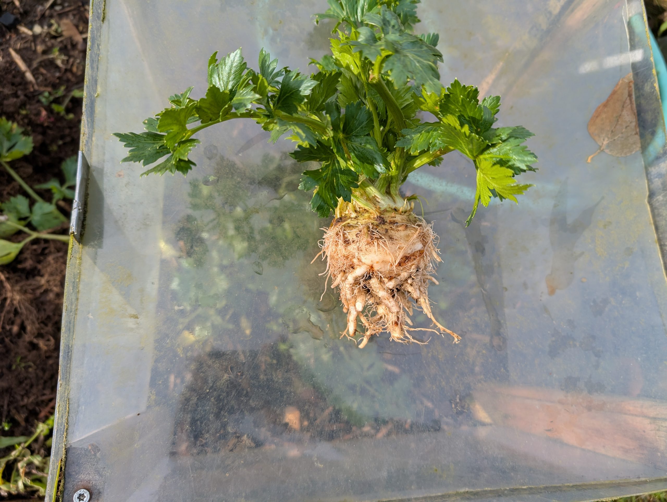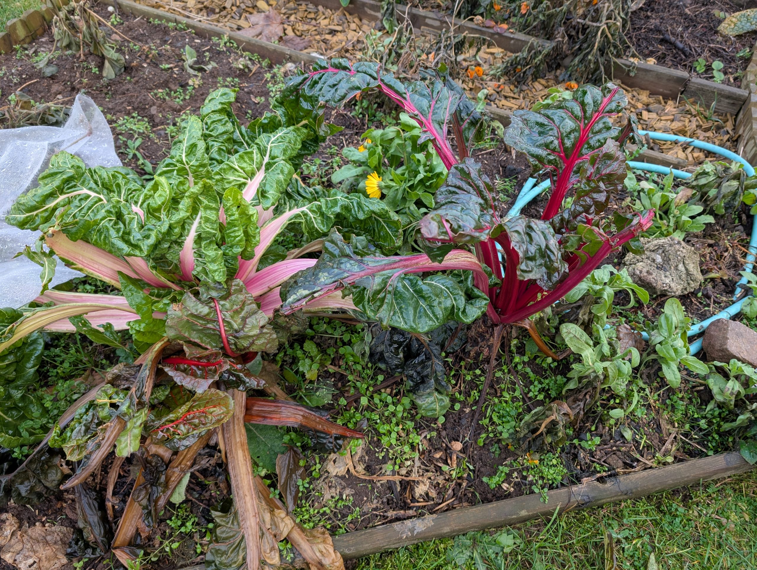 Aktuell gibt es noch folgende Gemüsesorten im Garten: Palmkohl, Grünkohl, Mangold, Sellerie und Weißer Rettich. Auch Petersilie ist noch vorhanden. Zum Teil wurden die Pflanzen aber auch mit einem Kälteschutz versehen, soweit das möglich war.