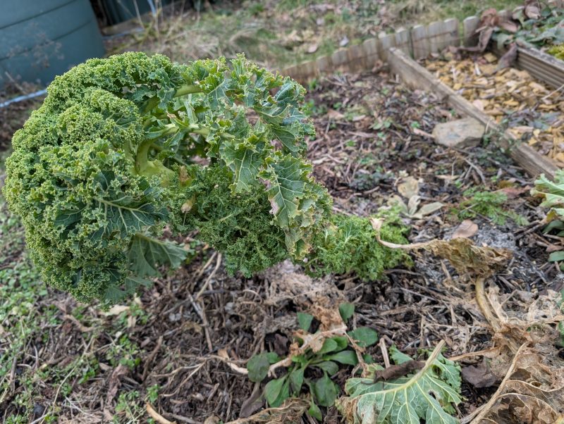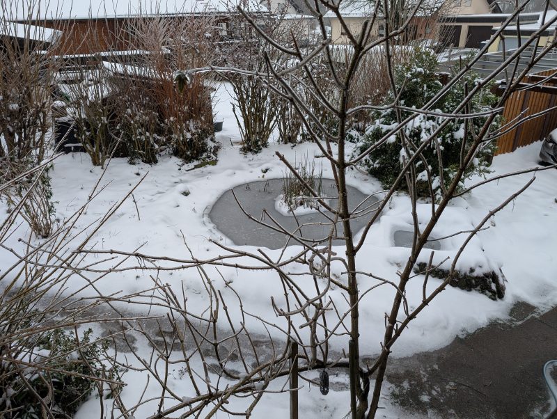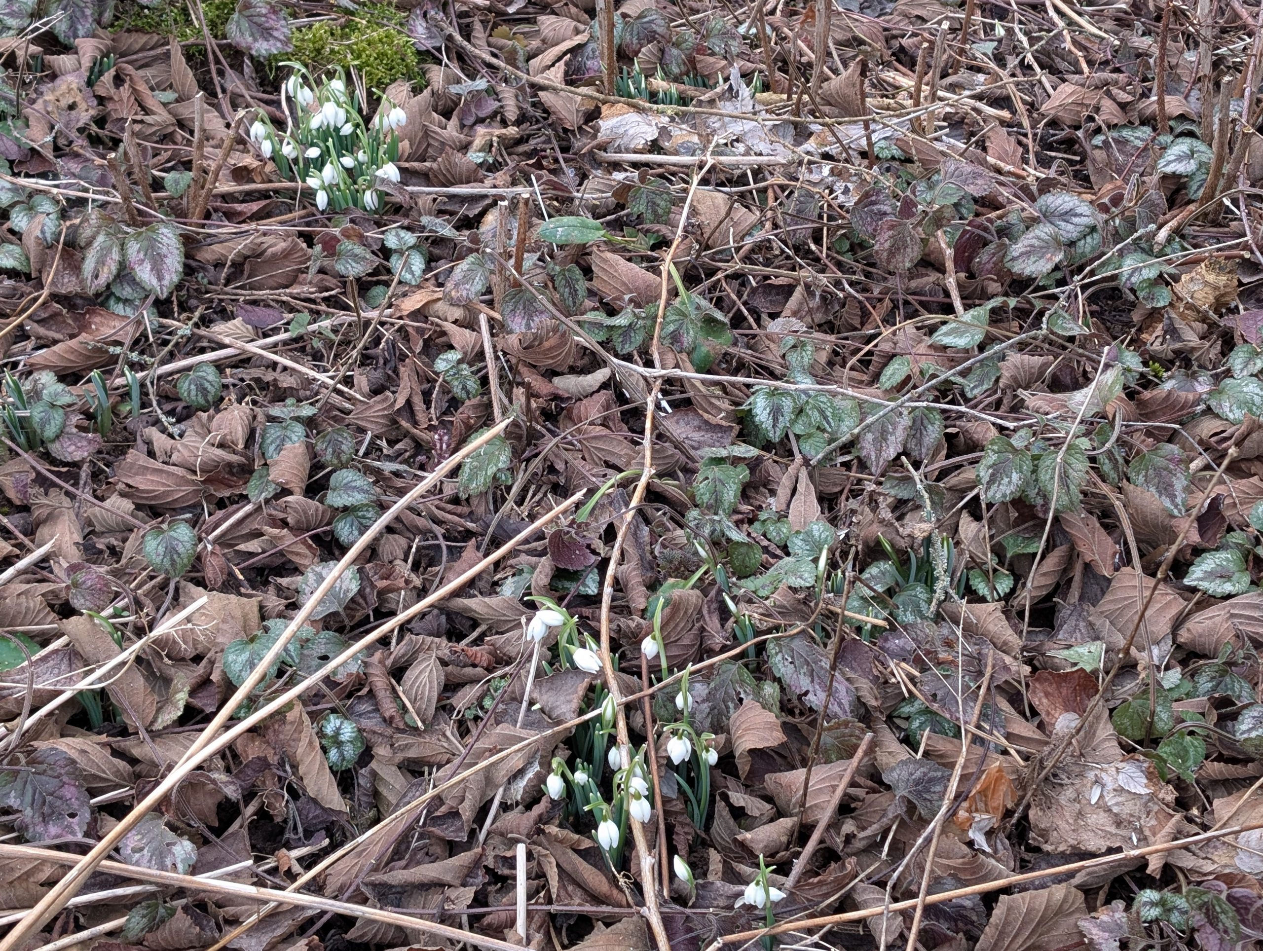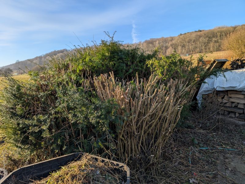Anfang Februar gab es etwas wärmere Tage und weitere Heckensträucher konnten zurückgeschnitten werden. Aus den riesigen Bergen der abgeschnittenen Äste können die dickeren Äste als Anmachholz genutzt werden. Die dünneren Zweige werden gehäckselt und kommen dann als Mulchmaterial wieder auf die Beete. Auch die riesige Kornelkirsche wurde im unteren Bereich etwas ausgedünnt. Nach oben hin darf sie weiter wachsen. Sie dient vor allem den Spatzen und Meisen als Strauch, der sie aufgrund der sehr verzweigten Struktur gegen Angriffe von Greifvögeln (Sperber) schützt. Langsam müssen die Beete von Unkraut gereinigt werden, Palmkohl und Grünkohl dürfen weiter stehen bleiben. Nur der Mangold ist verfroren. Die zwei verbliebenen Selleriepflanzen und die Petersilie haben unter der Glasabdeckung im Hochbeet Schnee und Eis überstanden. Neben den Schneeglöckchen zeigen sich auch die ersten Feldsalatpflänzchen. In den nächsten Wochen können sie bestimmt weiter wachsen und dann beerntet werden.