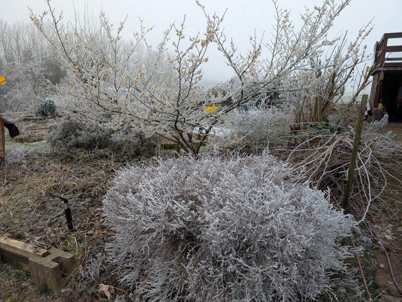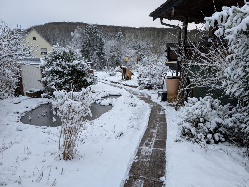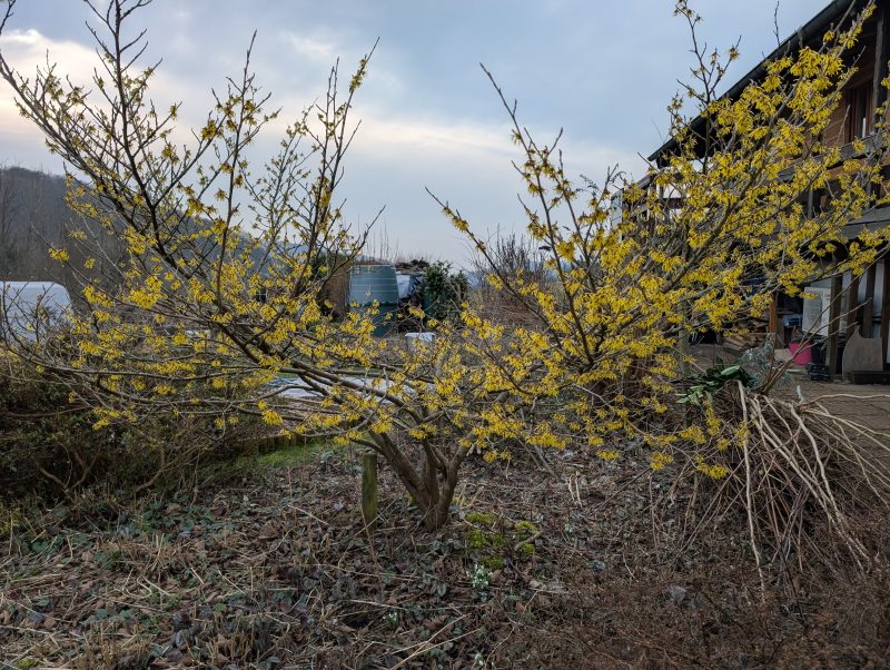In der ersten Januarwoche gab es noch einmal ein paar Tage, an dem der Garten frostfrei war. Diese Zeit konnte genutzt werden, um alle Rettiche “Münchner Bier” zu ernten und auch 2 kleine Sellerieknollen. Die Ernte wurde im Keller eingelagert und konnte dann nach und nach verzehrt und verarbeitet werden. Danach wurde es wieder kalt und für längere Zeit lag auch Schnee auf den Beeten. Ende Januar begann die Zaubernuss zu blühen und an frostfreien Tagen wurde wie jedes Jahr mit dem Rückschnitt der Heckensträucher begonnen. Alle Gemüsepflanzen, die noch in den Beeten stehen (Palmkohl, Grünkohl, Sellerie, und die Petersilie), haben die Fröste relativ gut überstanden.
