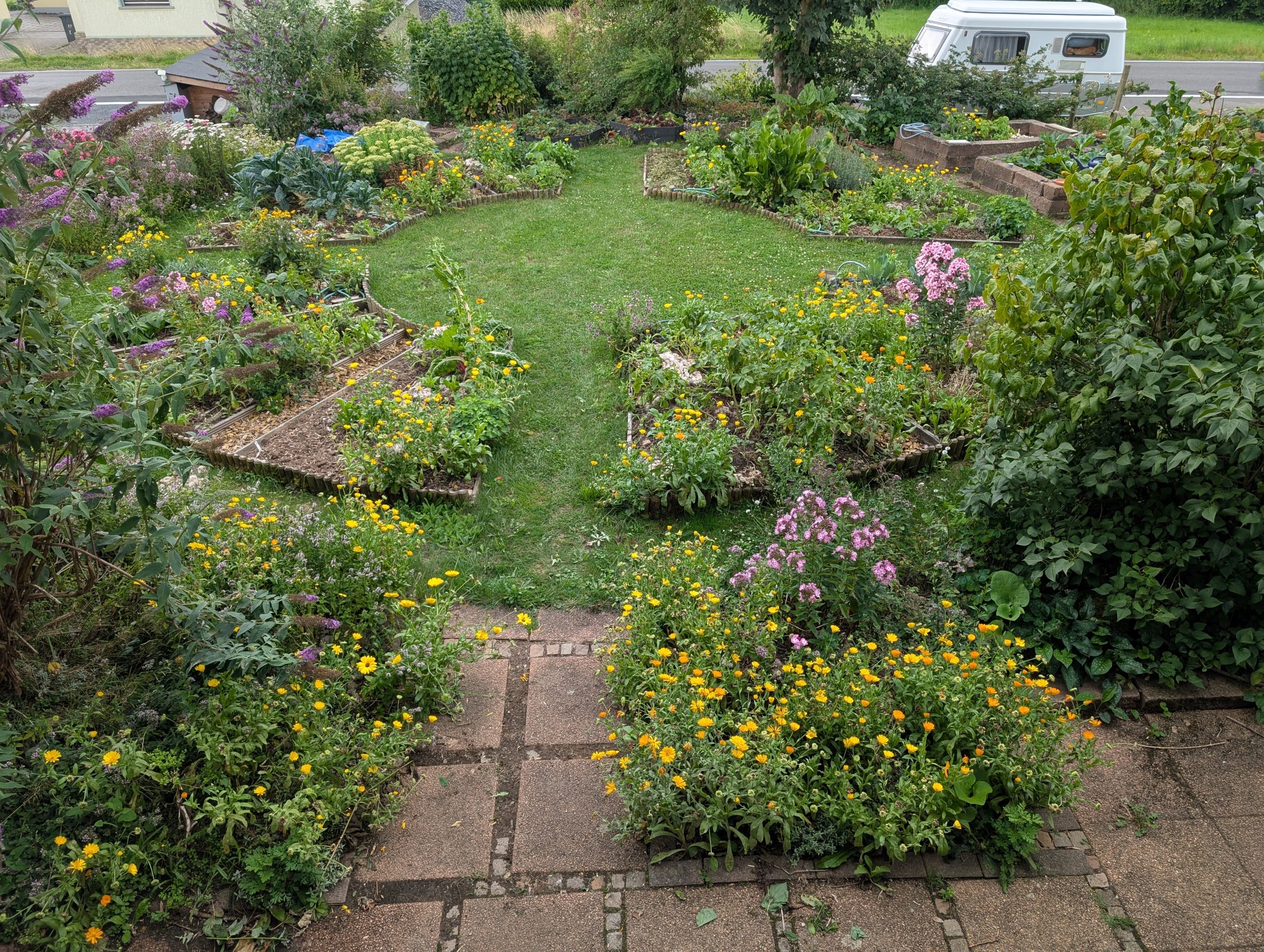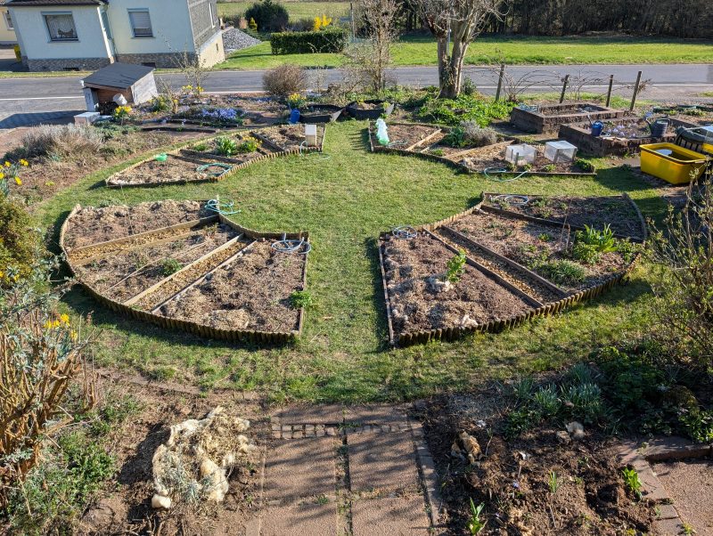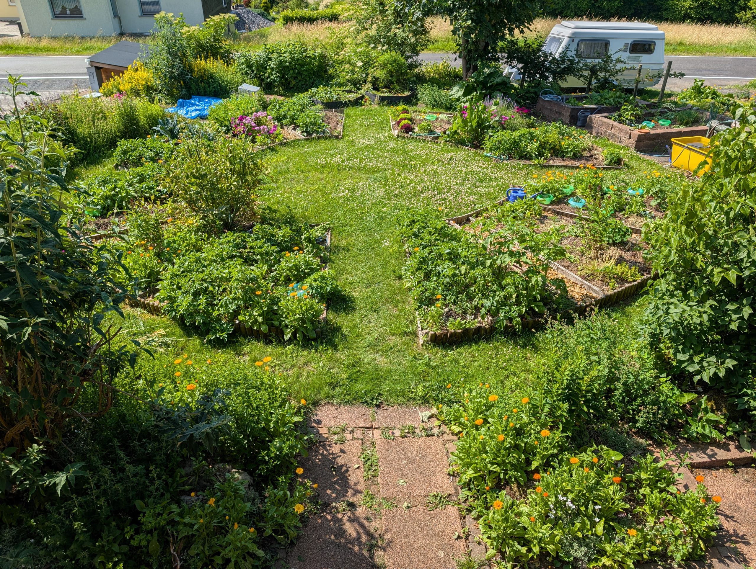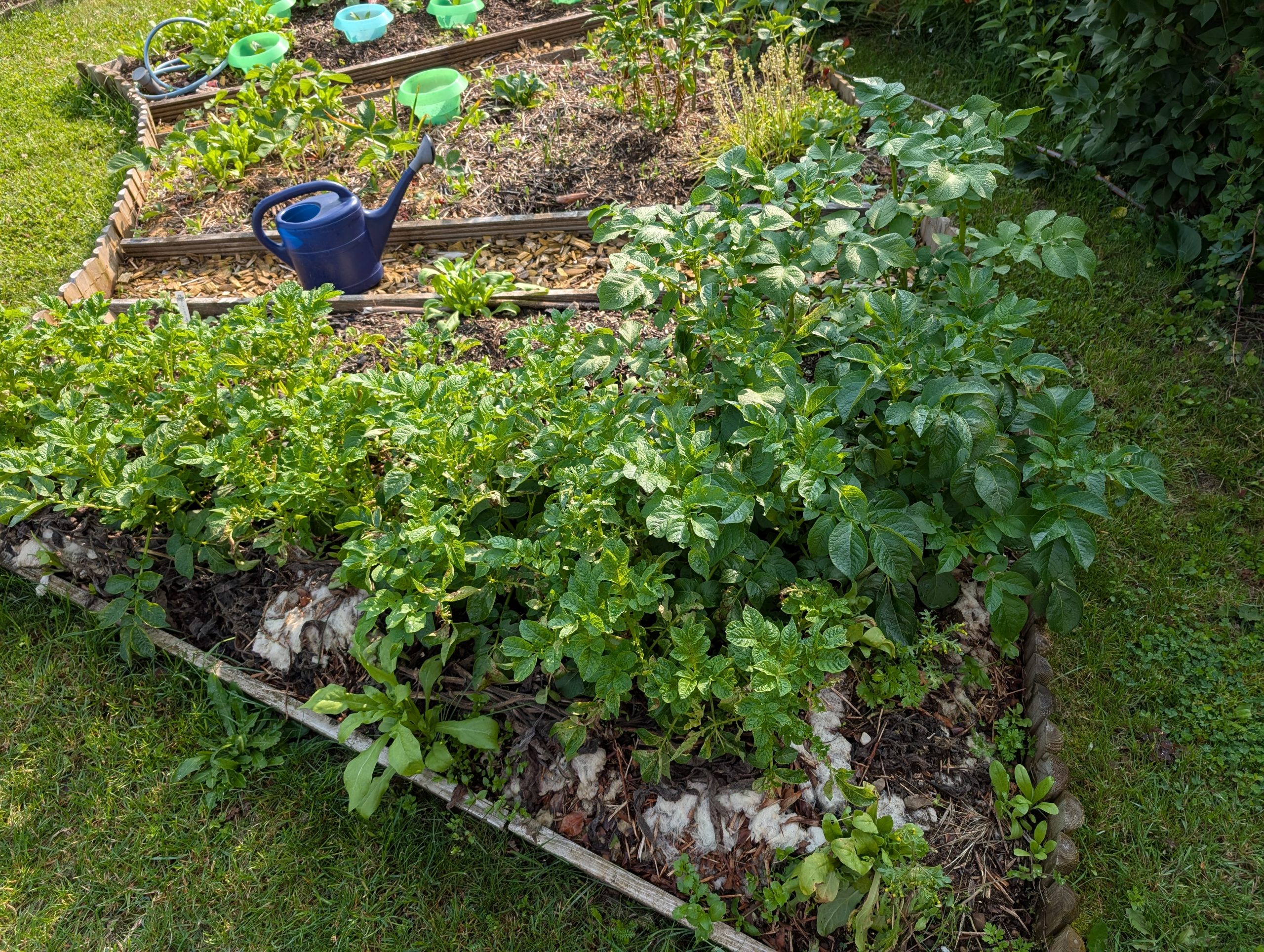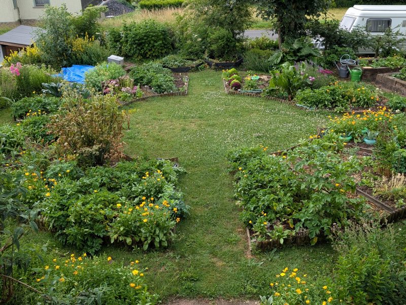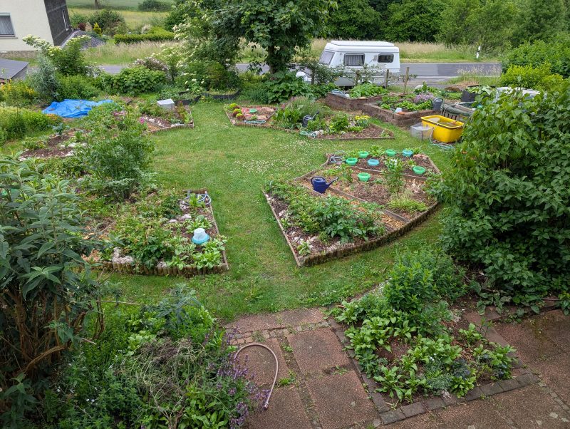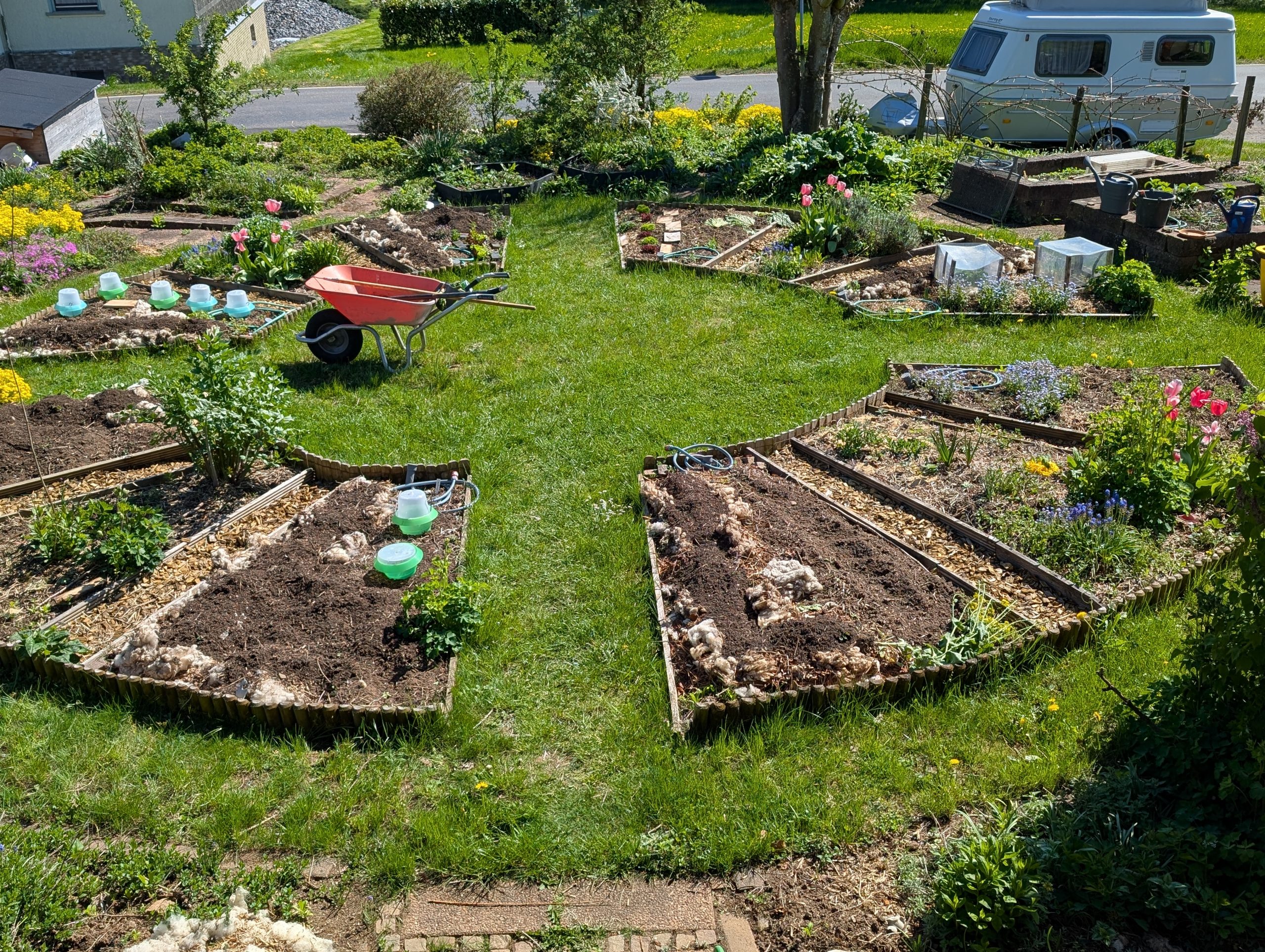 Nach einem wie immer gefühlten langen Winter startet das Jahr zuerst mit einer längeren trockenen Periode, die aber von allen bis dahin eingesetzten Jungpflanzen (gekeimte Kartoffeln, Palmkohl, Mangold, Pflücksalat, Mairübchen und Stielmus) gut überstanden werden. Ende Mai gibt es dann noch einmal eine kalte Frostnacht, die den schon weit ausgetriebenen Kartoffelpflanzen stark zusetzt. Viele Blätter sind erfroren und man kann die ersten Tage danach nicht sagen, ob die Kartoffelpflanzen diese Frostschäden überstehen werden. Sie erholte sie sich aber etwas und auch der intensive Regen half bestimmt bei der Regeneration. Anfang Juni werden einige Jungpflanzen (Sellerie, Blumenkohl und Spitzkohl) erworben und in die freien Beetflächen eingesetzt. Die Samen von Kürbis, Gurke, Zuchchini und Buschbohnen kommen auch erst Anfang Juni in die Erde, da im Mai Kunigunde und Kunibert mit dem Wohnwagen unterwegs waren. Die folgende Bilderfolge soll einmal einen Überblick über die sich wandelnden Beetgestaltung bieten. Spannend, wie sich das Bild des Gartens im Jahr immer wieder verändert.