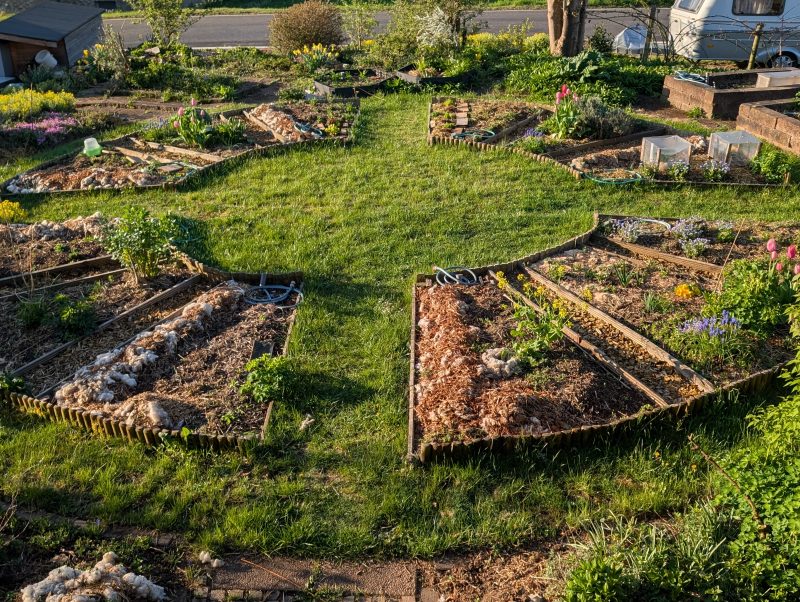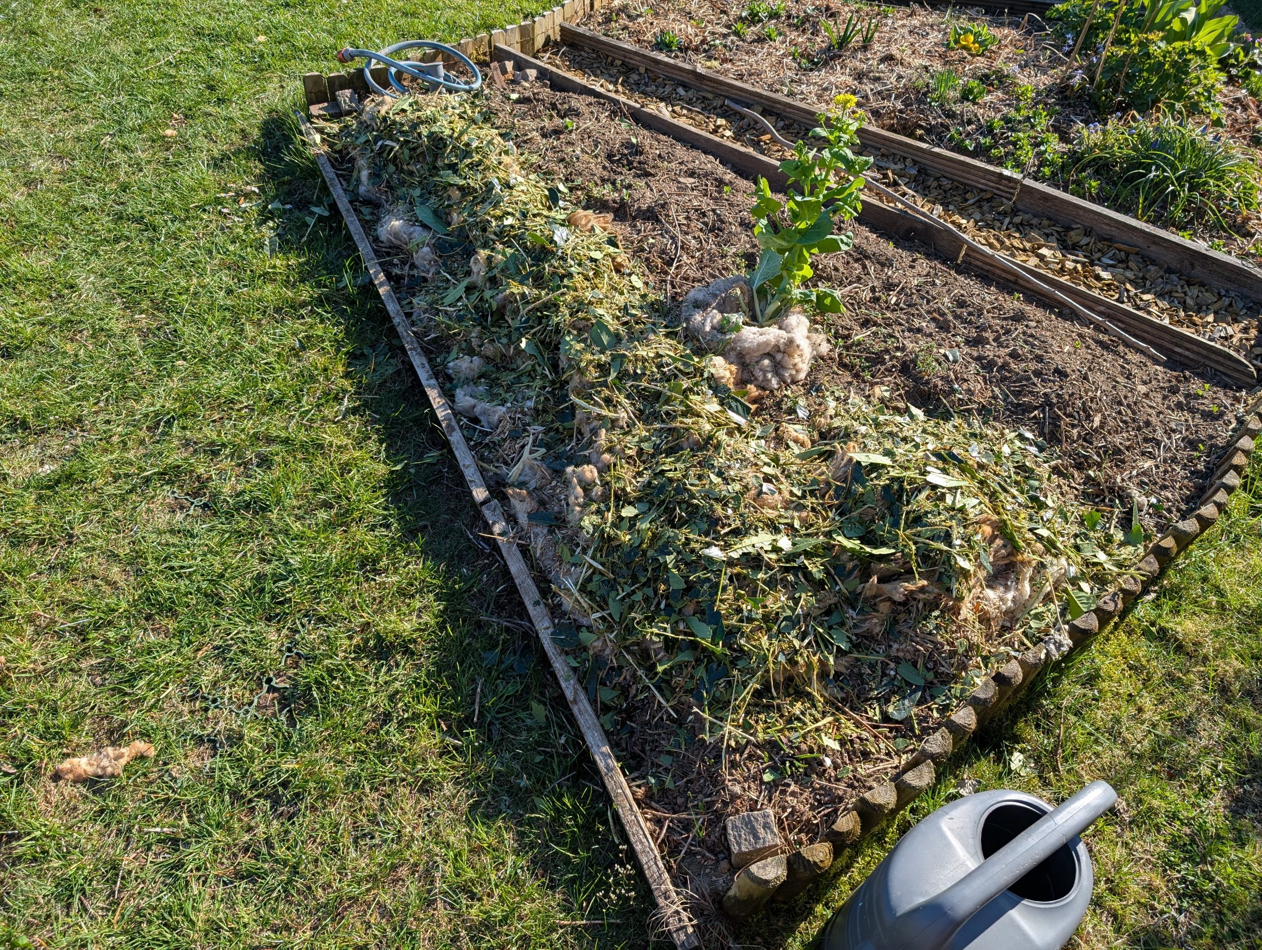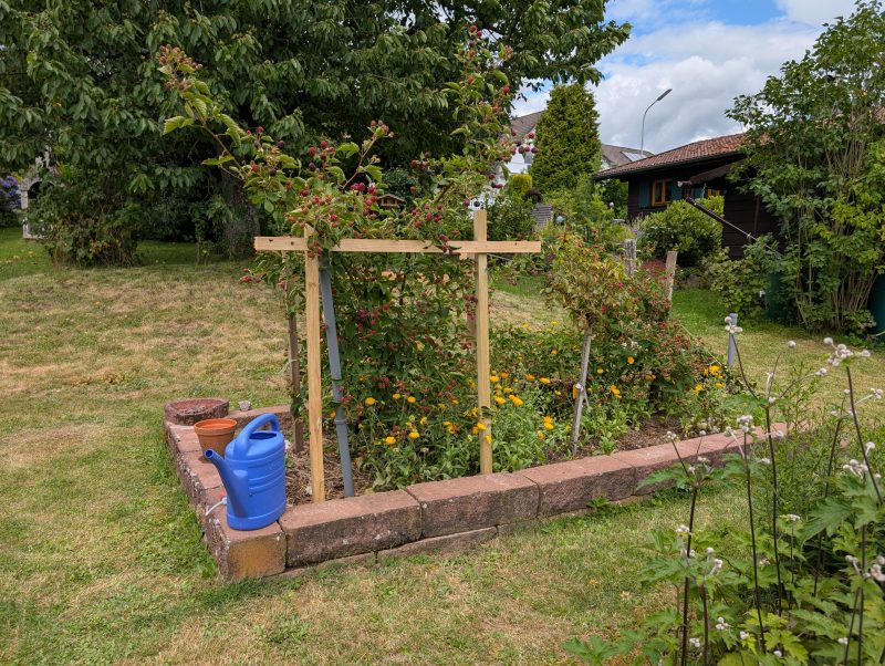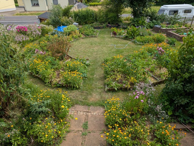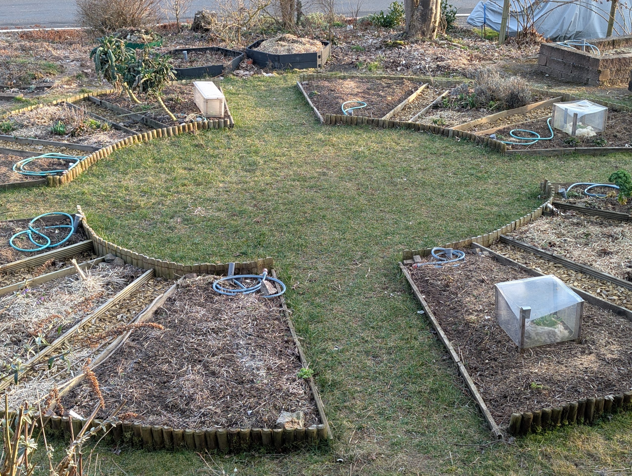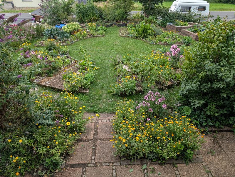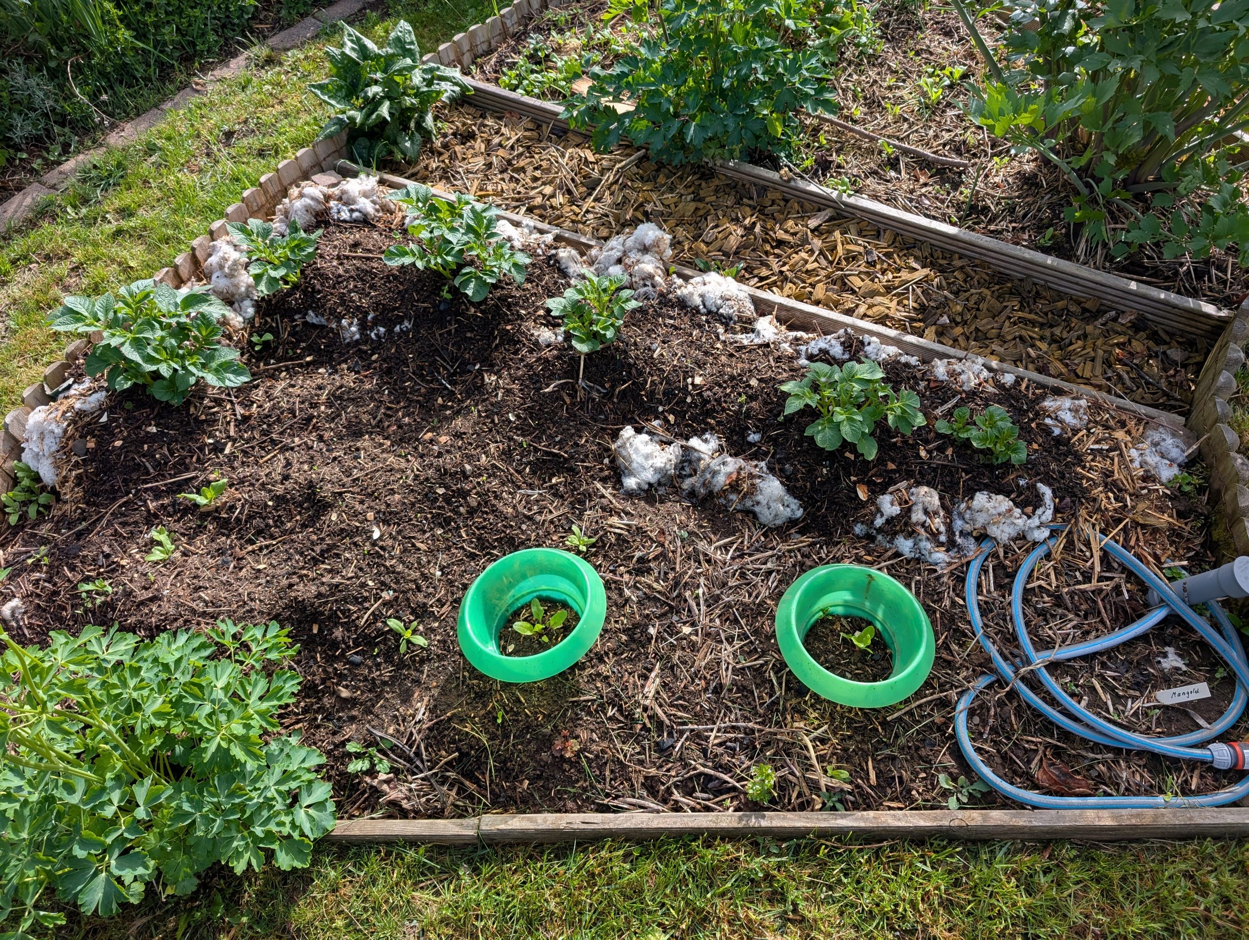 Nach einem wie immer gefühlten langen Winter startet das Jahr zuerst mit einer längeren trockenen Periode, die aber von allen bis dahin eingesetzten Jungpflanzen (gekeimte Kartoffeln, Palmkohl, Mangold, Pflücksalat, Mairübchen und Stielmus) gut überstanden werden. Ende Mai gibt es dann noch einmal eine kalte Frostnacht, die den schon weit ausgetriebenen Kartoffelpflanzen stark zusetzt. Viele Blätter sind erfroren und man kann die ersten Tage danach nicht sagen, ob die Kartoffelpflanzen diese Frostschäden überstehen werden. Sie erholte sie sich aber etwas und auch der intensive Regen half bestimmt bei der Regeneration. Anfang Juni werden einige Jungpflanzen (Sellerie, Blumenkohl und Spitzkohl) erworben und in die freien Beetflächen eingesetzt. Die Samen von Kürbis, Gurke, Zuchchini und Buschbohnen kommen auch erst Anfang Juni in die Erde, da im Mai Kunigunde und Kunibert mit dem Wohnwagen unterwegs waren. Die folgende Bilderfolge soll einmal einen Überblick über die sich wandelnden Beetgestaltung bieten. Spannend, wie sich das Bild des Gartens im Jahr immer wieder verändert.
