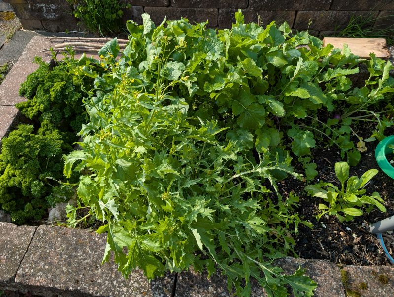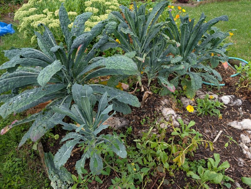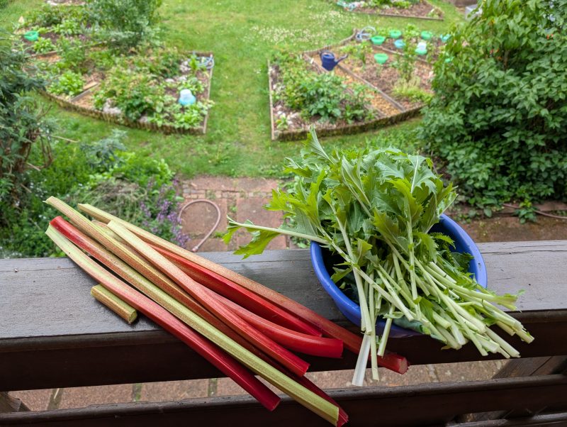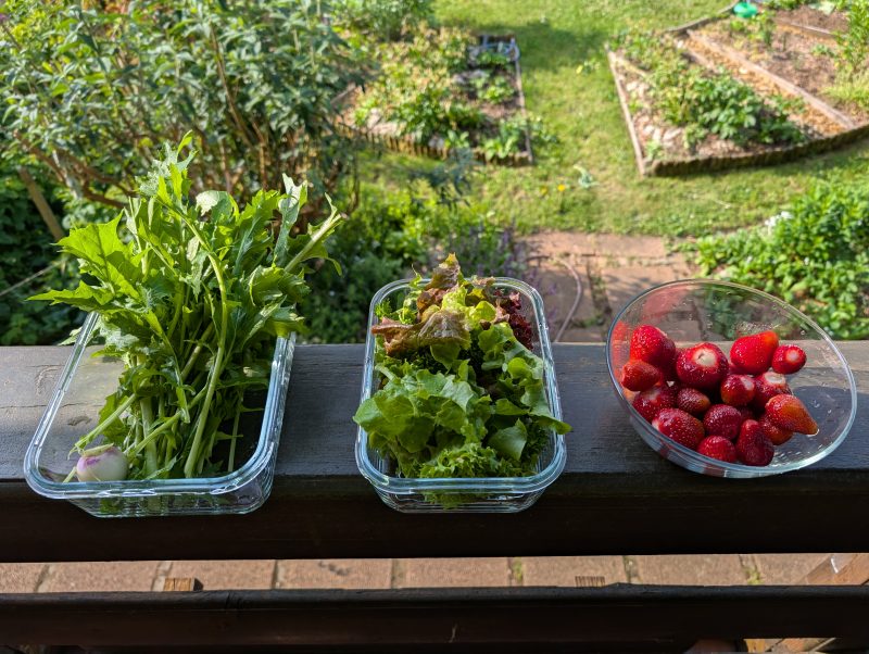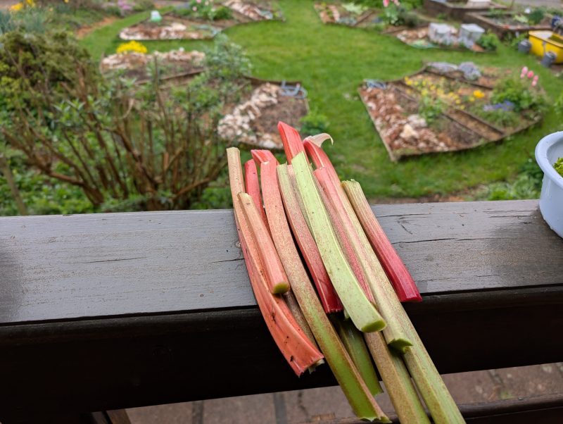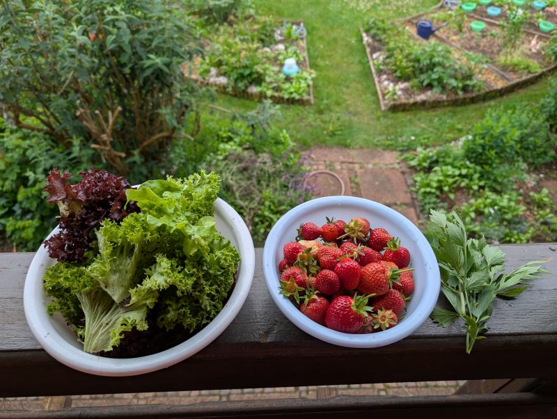Im Januar und Februar konnten an frostfreien Tagen immer noch Blätter vom Palmkohl und Grünkohl geerntet werden. Ab März startet die erste neue Ernte im Garten mit Bärlauch, Schnittlauch, Petersilie und Feldsalat. Ab Mitte April werden die ersten Rhabarberstangen verarbeitet und die Liebstöckelblätter kann zum Würzen der Gerichte verwendet werden. Selbstgezogener Pflücksalat und 6 gekaufte Salatpflanzen sind ebenfalls erntereif. Ende Mai kommen dann die Erdbeeren, Mairübchen und zum ersten Mal auch Stielmus hinzu. Es gibt für Kunigunde nichts schöneres, als zum Ernten durch den Garten zu gehen.