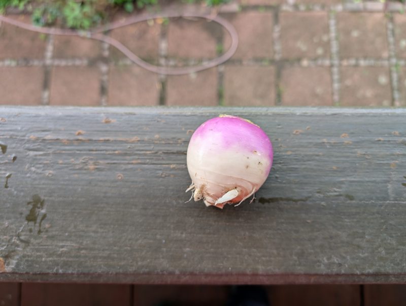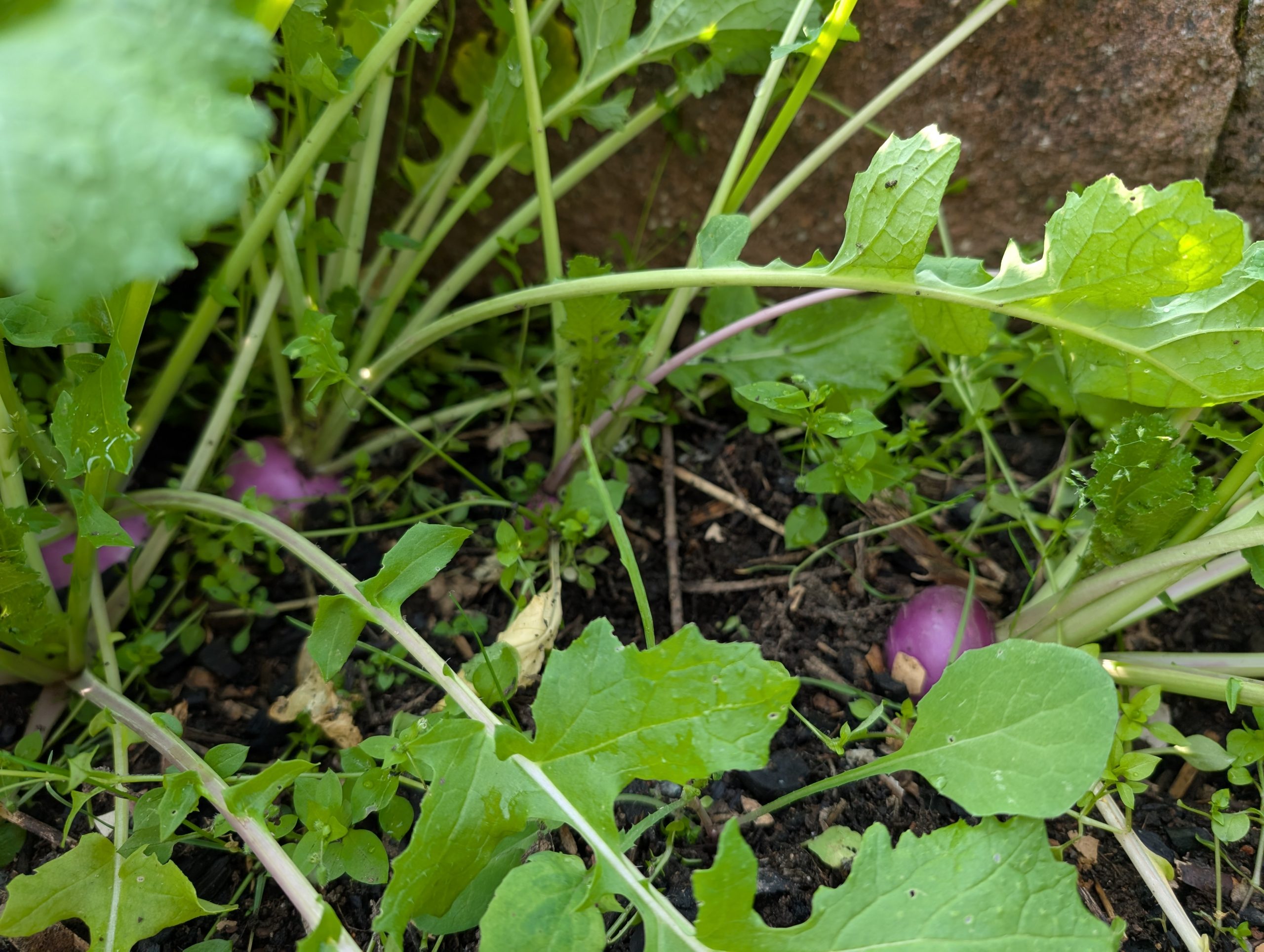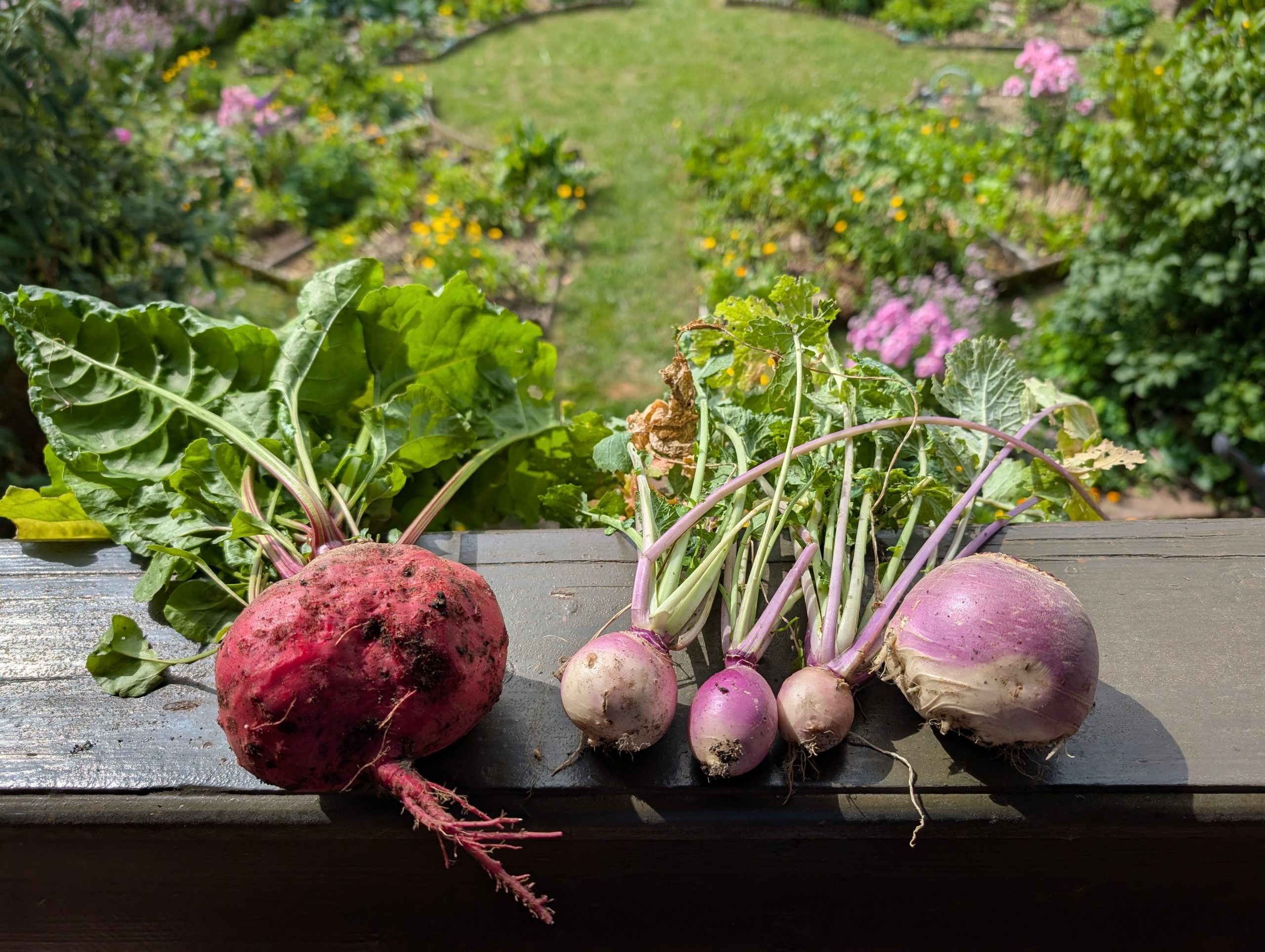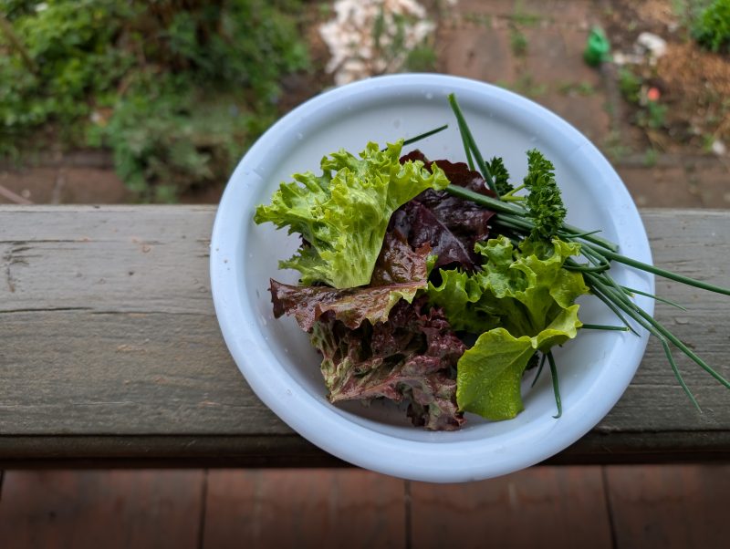 Im Januar und Februar konnten an frostfreien Tagen immer noch Blätter vom Palmkohl und Grünkohl geerntet werden. Ab März startet die erste neue Ernte im Garten mit Bärlauch, Schnittlauch, Petersilie und Feldsalat. Ab Mitte April werden die ersten Rhabarberstangen verarbeitet und die Liebstöckelblätter kann zum Würzen der Gerichte verwendet werden. Selbstgezogener Pflücksalat und 6 gekaufte Salatpflanzen sind ebenfalls erntereif. Ende Mai kommen dann die Erdbeeren, Mairübchen und zum ersten Mal auch Stielmus hinzu. Es gibt für Kunigunde nichts schöneres, als zum Ernten durch den Garten zu gehen.