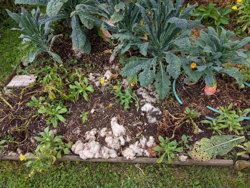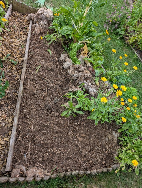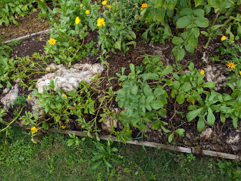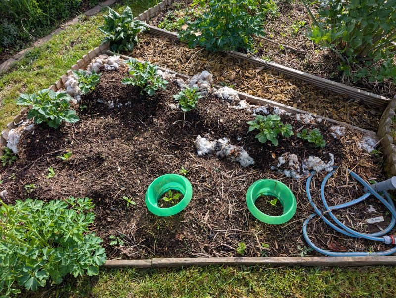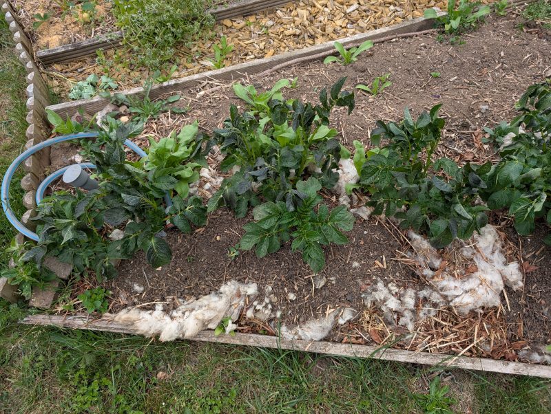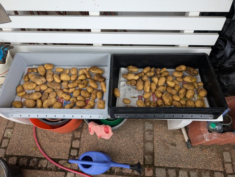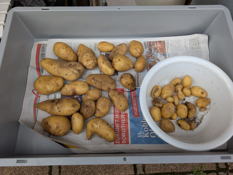 Nach der beeindruckenden Ernte des Jahres 2024 soll wieder ein großer Teil der Beete mit Kartoffeln bepflanzt werden. Schon Ende Februar wird die Pflanzkartoffel “Sieglinde” eingekauft und im Haus vorgekeimt. Da die Keimung sehr rasch voranschreitet, mussen die Kartoffeln schon relativ früh eingeplanzt werden. Als Kälteschutz wird großflächig Schafswolle eingesetzt. Dazu noch eine dicke Lage frischer Komposterde und Häckselgut. Da es aber kaum Nachtfröste gibt, wachsen die Kartoffelpflanzen schnell und kräftig. Leider gibt es dann am 24. Mai doch noch einmal eine kalte Frostnacht und ein großer Teil der Blätter schein erfroren zu sein. Was nun? Zum Glück können sich die Pflanzen etwas erholen und nachwachsen. Anfang Juli sehen die Kartoffeln aber nicht mehr gut aus. Sie blühen auch nicht und scheinen langsam abzusterben. Also wird bei einer Kartoffel einmal nachgesehen. Unter einer Pflanze befinden sich aber doch einige Kartoffeln, allerdings auch sehr viele kleine Exemplare. Ende Juli werden dann auch die ersten Reihen abgeerntet, da das Kraut fast vollständig verwelkt ist. Ganz so schlecht sieht die Ernte nun doch nicht aus. Bis Ende August sind es 24 kg Kartoffeln, die im Keller eingelagert werden. Nur 6 Pflanzen stehen noch verteilt in den Beeten.