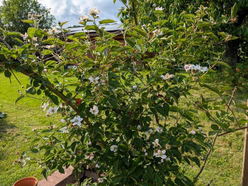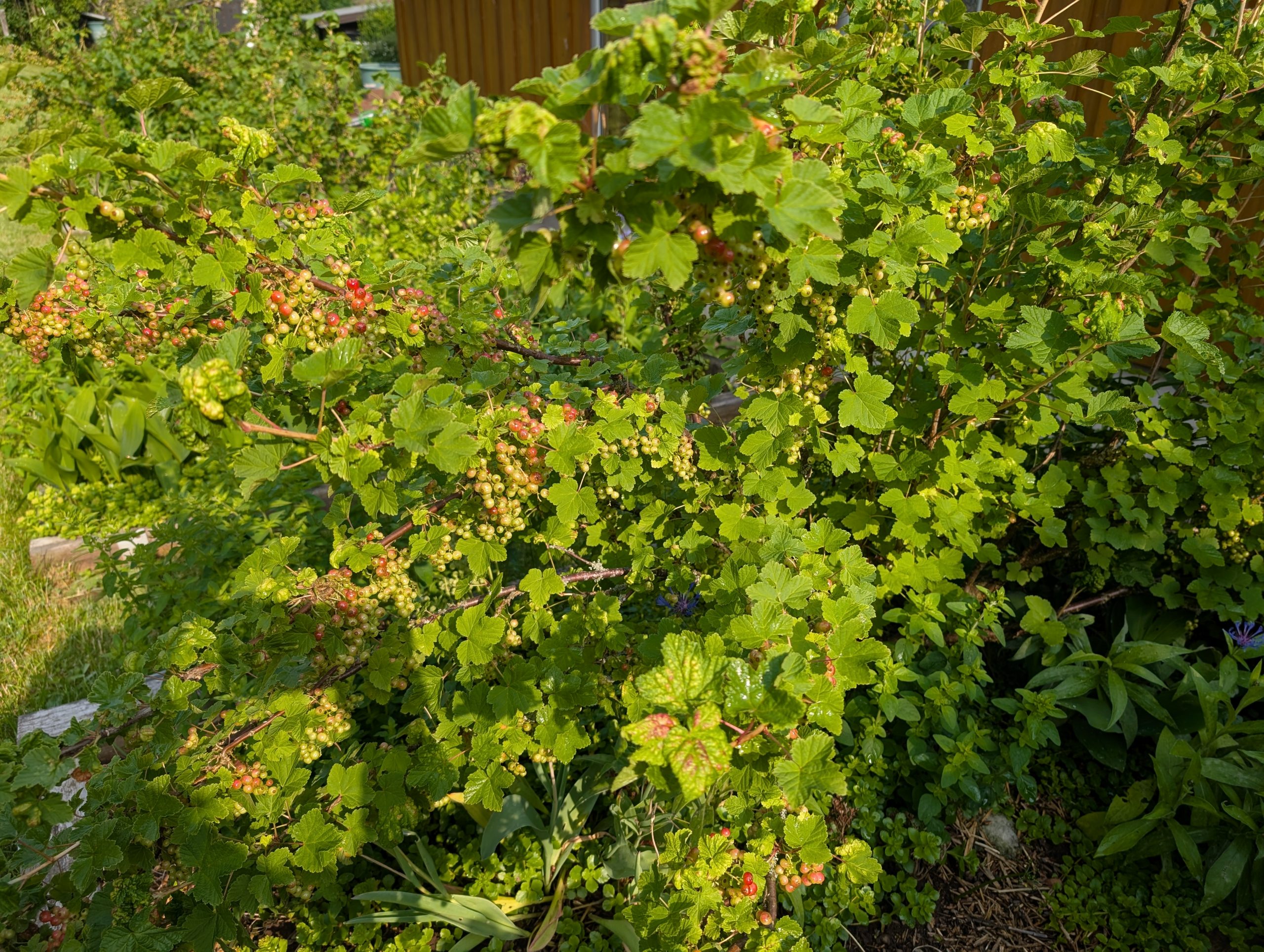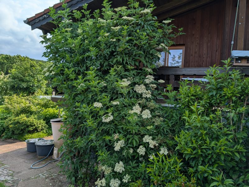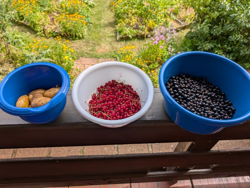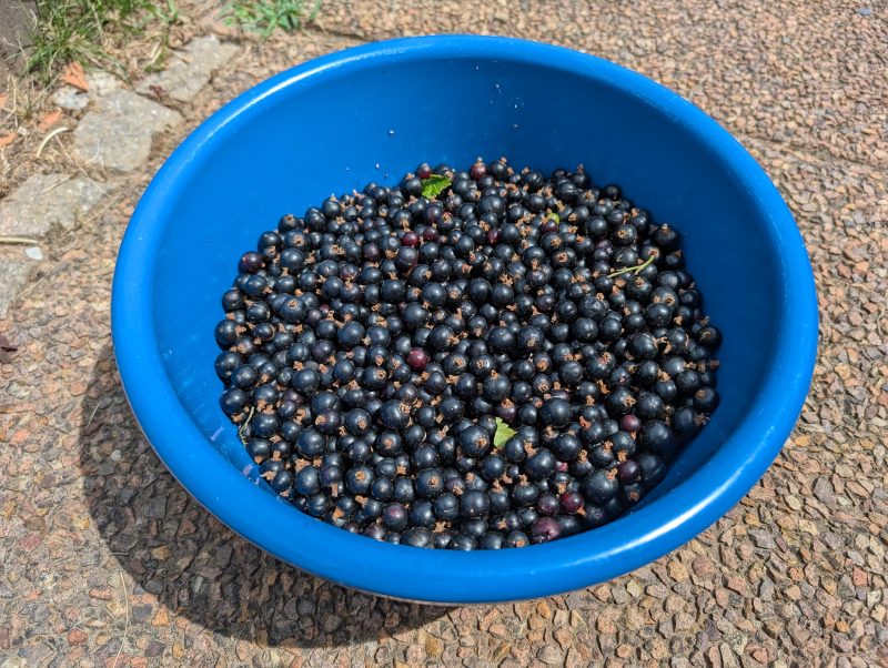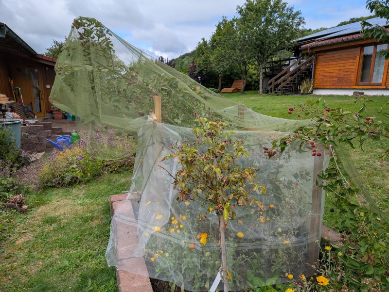 Die Obst- und Beerenernte scheint ebenfalls erfolgreich zu werden. Alle Johannisbeersträucher hängen übervoll mit Beeren. Bei der schwarzen Johannisbeere lagen die Äste zum Teil schon auf dem Boden. Die Holunderblüte wist ebenfalls beachtlich und eine Brombeere blühte schon Anfang Juni in voller Blüte. Somit wird es eine reiche Obsternte geben. Ende Juni und Anfang Juli werden dann nach und nach rote, gelbe (900 Gramm) und schwarze Johannisbeeren (4280 Gramm) geernten. Dabei werden wie jedes Jahr rote und gelbe Früchte in kleinen Portionsbeutel für Müsli oder Quark eingefroren. Die schwarzen Johannisbeeren kommen zwar zuerst auch in die Tiefkühltruhe, werden dann bei heißem Wetter und viel Sonnenschein entsaftet. Der Saft ist über Jahre haltbar und kann nach Bedarf zur Marmelade oder Sirup verarbeitet werden. Vor allem die Wespen machen sich dann über die ersten reifen Brombeeren her. Beim Pflücken muss man extrem vorsichtig sein. Viele Früchte sind von den Wespen angebissen und die Brombeegalmilbe hat leider auch einige Früchte befallen. Somit wird beschlossen, die Brombeere mit Insektenschutznetze zu verhüllen. So bleiben noch genug Früchte für Kunibert und Kunigunde übrig.