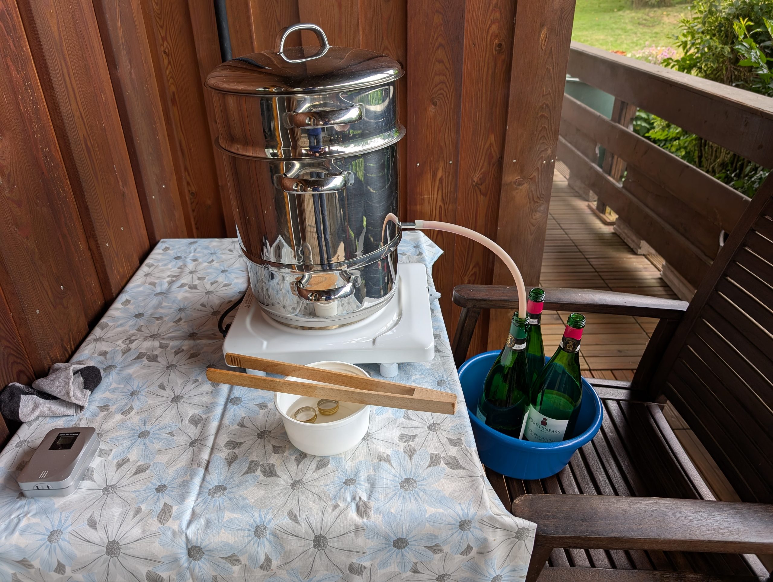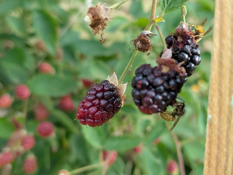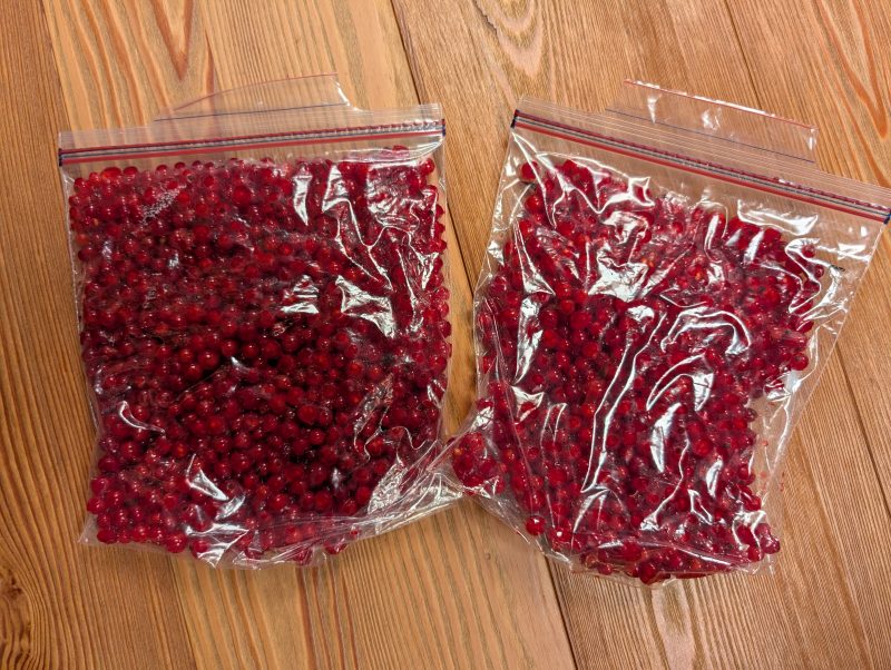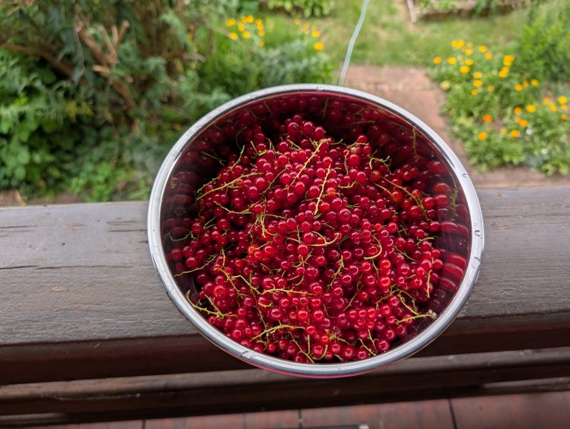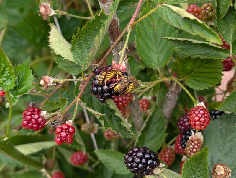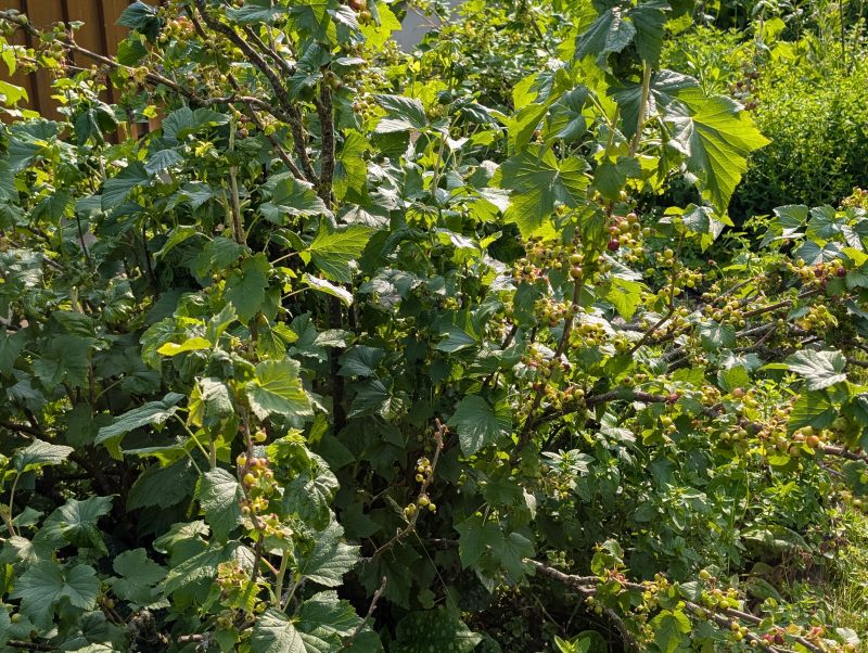 Die Obst- und Beerenernte scheint ebenfalls erfolgreich zu werden. Alle Johannisbeersträucher hängen übervoll mit Beeren. Bei der schwarzen Johannisbeere lagen die Äste zum Teil schon auf dem Boden. Die Holunderblüte wist ebenfalls beachtlich und eine Brombeere blühte schon Anfang Juni in voller Blüte. Somit wird es eine reiche Obsternte geben. Ende Juni und Anfang Juli werden dann nach und nach rote, gelbe (900 Gramm) und schwarze Johannisbeeren (4280 Gramm) geernten. Dabei werden wie jedes Jahr rote und gelbe Früchte in kleinen Portionsbeutel für Müsli oder Quark eingefroren. Die schwarzen Johannisbeeren kommen zwar zuerst auch in die Tiefkühltruhe, werden dann bei heißem Wetter und viel Sonnenschein entsaftet. Der Saft ist über Jahre haltbar und kann nach Bedarf zur Marmelade oder Sirup verarbeitet werden. Vor allem die Wespen machen sich dann über die ersten reifen Brombeeren her. Beim Pflücken muss man extrem vorsichtig sein. Viele Früchte sind von den Wespen angebissen und die Brombeegalmilbe hat leider auch einige Früchte befallen. Somit wird beschlossen, die Brombeere mit Insektenschutznetze zu verhüllen. So bleiben noch genug Früchte für Kunibert und Kunigunde übrig.