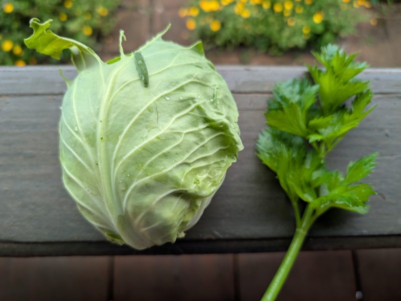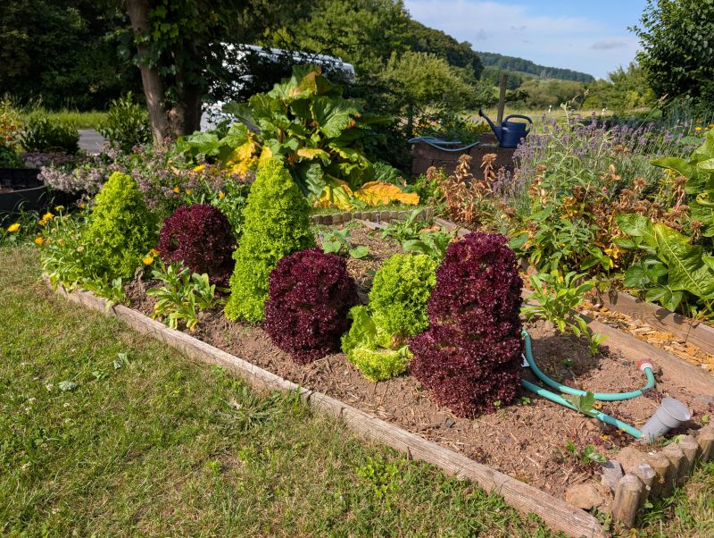 Im Juli wachsen endlich die Zuchhini-, Kürbispflanzen und eine Gurke. In diesem Jahr insgesamt sehr spät, aber die ersten Samen wollten nicht aufgehen. Auch bei den Buschbohnen musste mehrmals nachgesäht werden. Dafür haben die Tomatenpflanzen alle gut angesetzt und damit die Früchte auch ausreifen, werden die neuen Blütenstände ab Ende Juli schon entfernt. Richtig gut entwickelt hat sich mal wieder der Palmkohl. Die Pflanzen sind sehr kräftig und die Blätter können ganz vielseitig verwendet werden in der Küche. Anfang April wurden 6 Salatjungpflanzen gekauft. Diese Pflanzen konnte bis Ende Juli regelmäßig beerntet werden, wirklich unglaublich ertragreich. Die Blumenkohlpflanzen werden aber von den Kohlweißlingen geliebt. So müssen im August die Kohlpflanzen mit einem Insektenschutznetz abgedeckt werden.