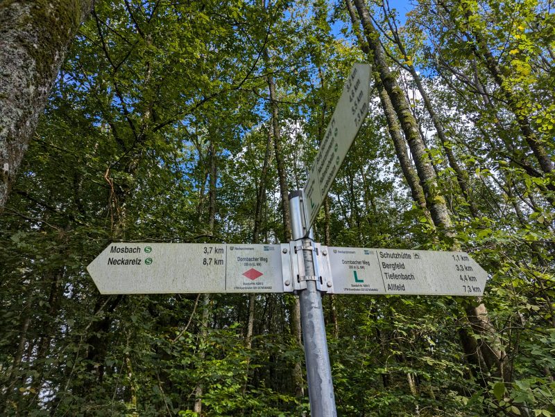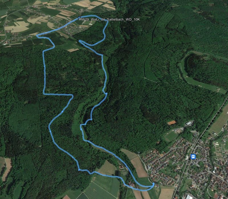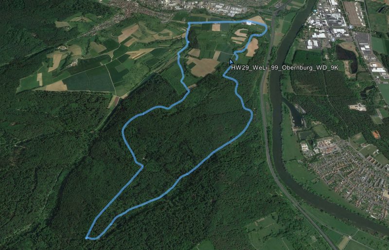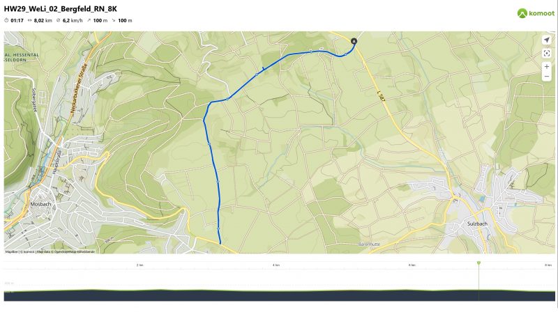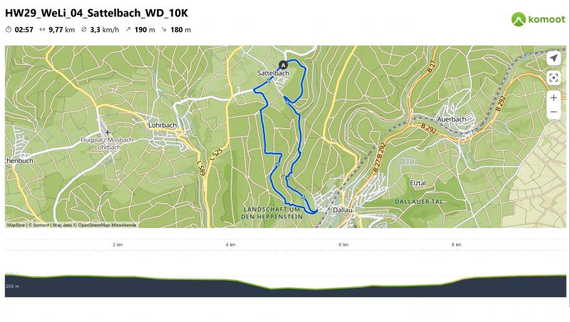 Bei diesem Teilstück handelt es sich nicht um eine Schleife sondern um einen Hin- und Rückweg, den wir aufgrund seiner geringen Höhenmeter auch joggend zurückgelegt haben. Allerdings haben wir die Etappe auch etwas verkürzt. Gestartet sind wir von einem Parkplatz auf der L587 hinter Dallau. Von dort ging es mit Wanderweg D2 in Richtung Mosbach bis wir auf der Westliche Limesweg hinzu kam. Dieser zweigte dann in Richtung Bergfeld ab.