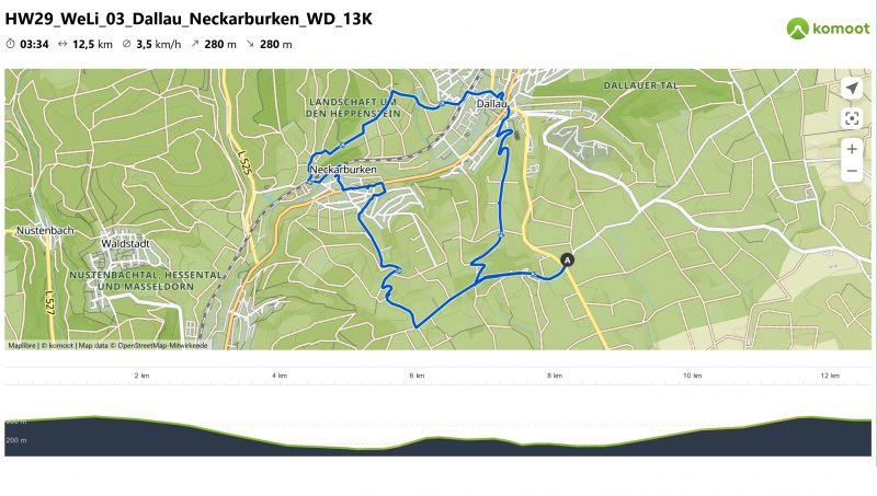Unser Startpunkt ist ein Parkplatz an der L587 zwischen Dallau und Sulzbach. Von dort aus wandern wir in Richtung Mosbach über die Höhe, bis wir auf unseren Limesweg stoßen. Mit ihm geht es dann hinunter in Richtung Neckarburken. Dabei kommen wir zuerst an einem Kalkofen vorbei. In Neckarburken angekommen befinden sich an der L27 zwei römische Ausgrabungen. Der Westliche Limesweg führt uns außerdem an das Römermuseum in Neckarburken vorbei. Nach Überquerung der Elz wandern wir den Berg hinauf. Für eine schöne Rast mit Aussichtsbank und tollen Fernblick verlassen wir dann den Limesweg und wandern am Hang entlang bis oberhalb Dallau. Entlang der Mühle geht es hinunter nach Dallau, am Schloss Dallau vorbei. Der Baulandweg (Blaues Dreieck) bringt uns dann auf der anderen Hangseite wieder hinauf, bis wir auf unseren Zuweg zum Parkplatz stoßen.