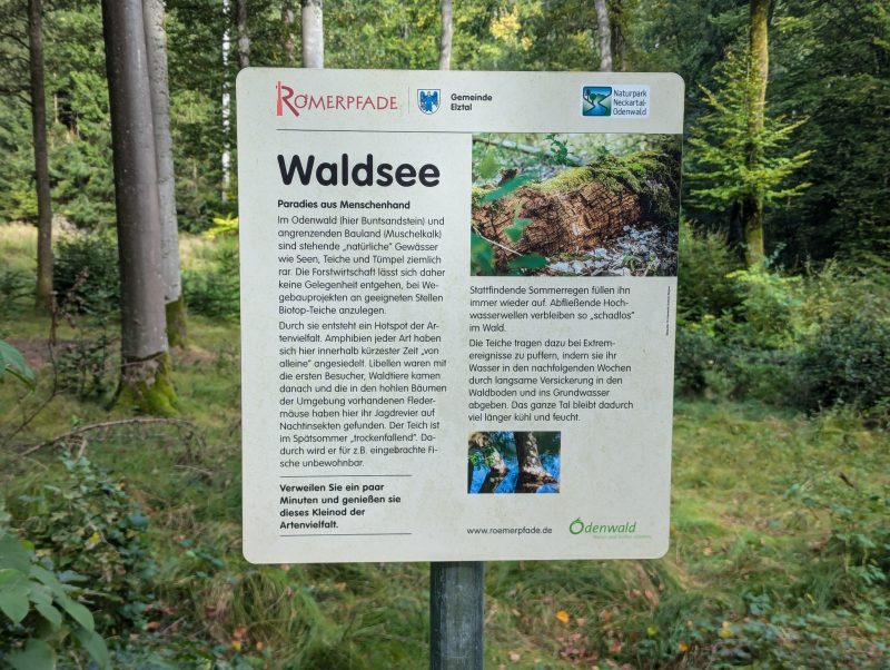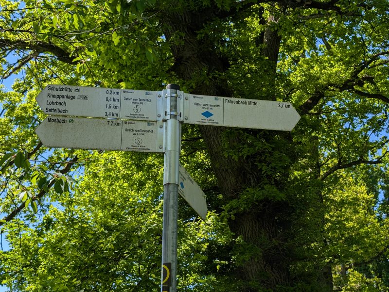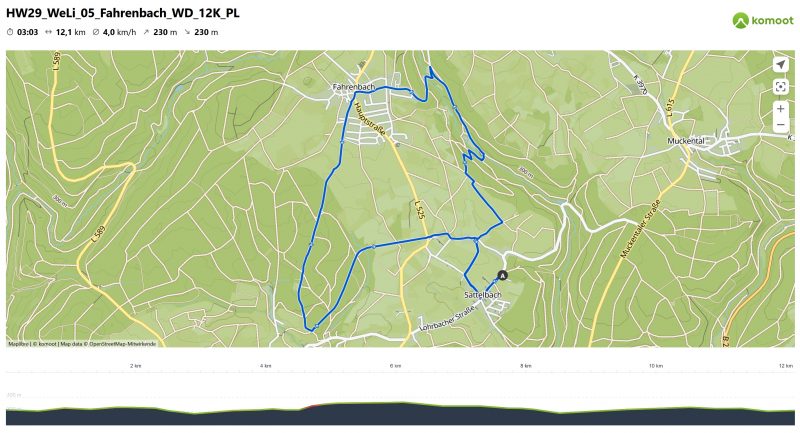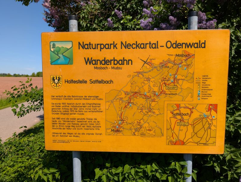 Wir starten wieder am Friedhofsparkplatz in Sattelbach. Im Dorf treffen wir auf unseren Limesweg, der uns ins Trienzbachtal führt. Im “Trienzgrund” verlassen wir den Westlichen Limesweg und wandern mit dem HW36 bis zur Ortsmitte von Fahrenbach. Dort stoßen wir auf den Main-Neckar-Weg HW33, der uns in Richtung Lohrbach führt bis zur Wanderbahn. Es ist eine ehemalige Bahnstrecke, die von Mosbach nach Mudau führte. Mit ihr geht es dann wieder zurück in Richtung Sattelbach.