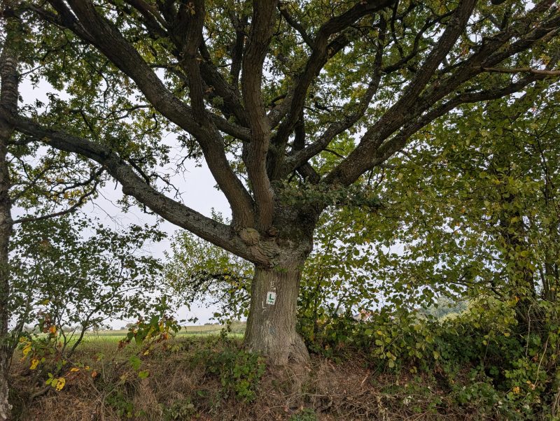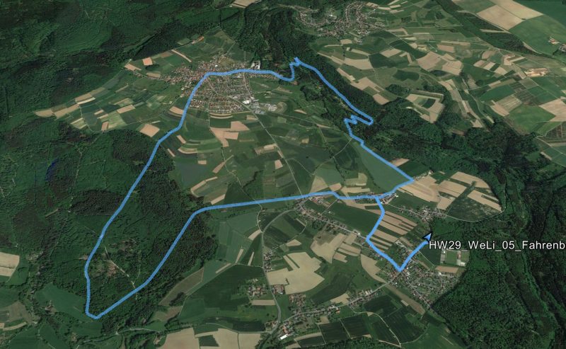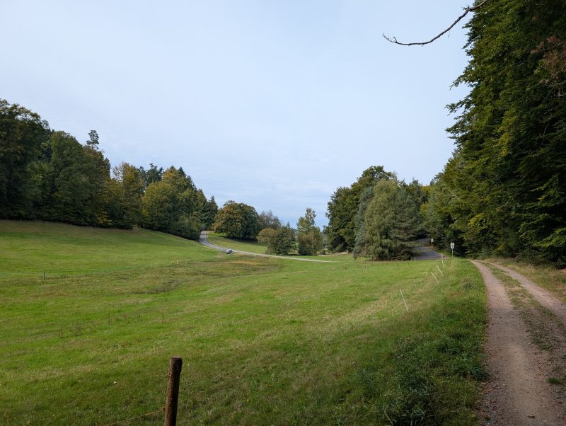 Die erste Radstrecke führte zunächst steil bergan bis an den Rand einer Hochfläche neben dem Ensenberg. Das Rad wurde nicht nahe der Mitte der Strecke zwischen den beiden Parkplätzen abgestellt, weil danach eine längere baumlose landwirtschaftlich genutzte Fläche ohne Radanschlussmöglichkeit zu sehen war.