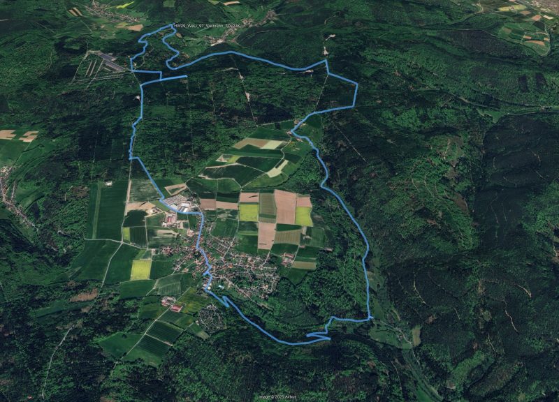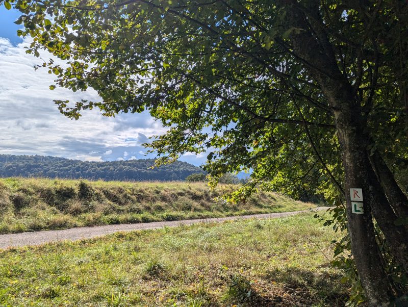 Auf der anderen Talseite schlängeln sich die Wanderwege zwischen Truppenübungsgeländen und Hügelkuppen dahin. Für ein paar Kilometer müssen auch Landstraßen begangen werden. Die Routenplanung mit Outdooractive hat lokale Rund und vorhandene Fernwanderwege genutzt, die zwei auf Google Maps verifizierte Parkplätze miteinander verbinden.