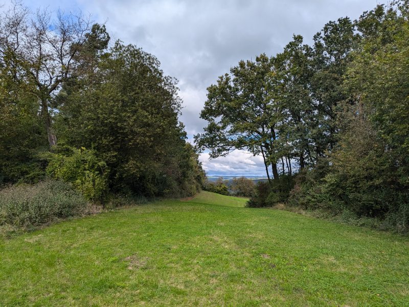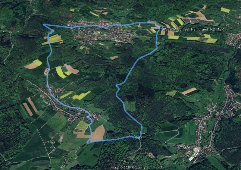 Die Wanderstrecke hält sich an den Hügeln oberhalb der Radstrecke und wechselt zwischen landwirtschaftlich und forstwirtschaftlich genutzten Flächen. Sehr aussichts- und abwechslungsreich.
