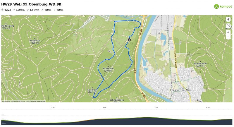 Vom Wanderparkplatz oberhalb von Obernburg geht es zuerst mit dem Limesweg hinunter nach Obernburg. Dort verlassen wir vorerst wieder unseren Limesweg, wandern entlang des Mömlinger Bachtals und durch eine große Streuobstwiese wieder hinauf in den Wald bis zum Waldhaus Oberburg. Dort treffen wir wieder auf unseren Liemesweg. Ihm folgen wir noch ein Stück bis wir dann wieder über den Maintalweg zurück zum Parkplatz kommen. Auf diesem Streckenabschnitt folgen wir dann dem östlichen Limesweg.