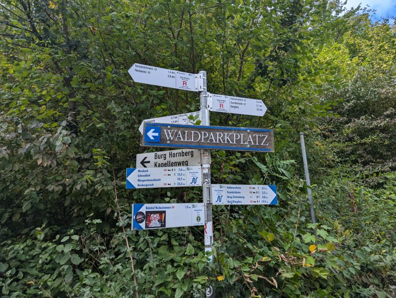 Übernachtet wurde auf öffentlichen Parkplätzen im Dorf oder im Wald auf oder nahe der Strecke. Das Auto hat die Wanderstrecke einmal, das Rad auf dem Hinweg gern auch abseits der Eselsweg Streckenführung einmal und die Wanderschuhe den Rückweg auf dem Wanderweg einmal bewältigt.