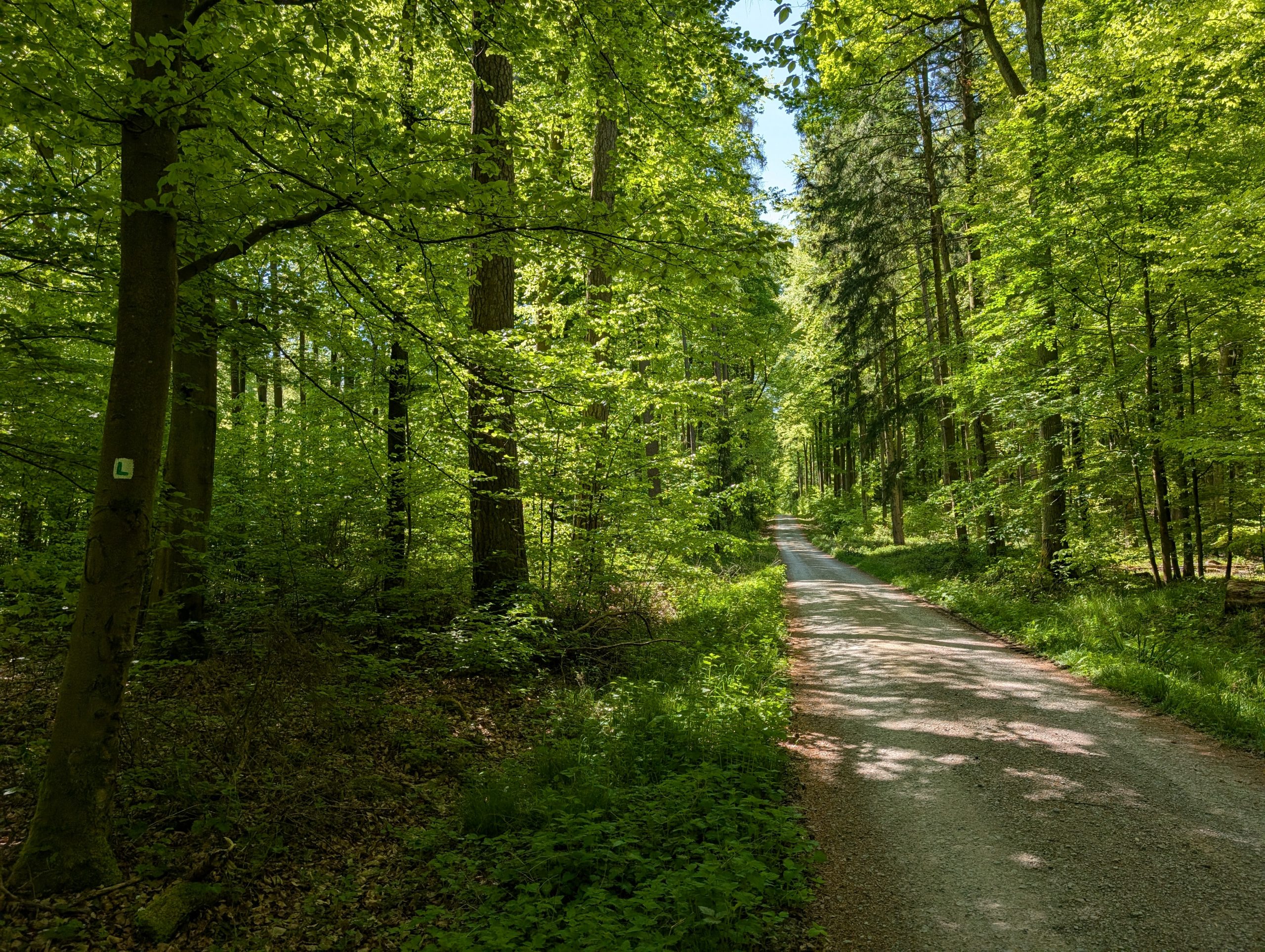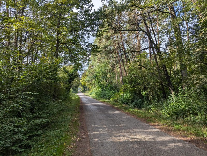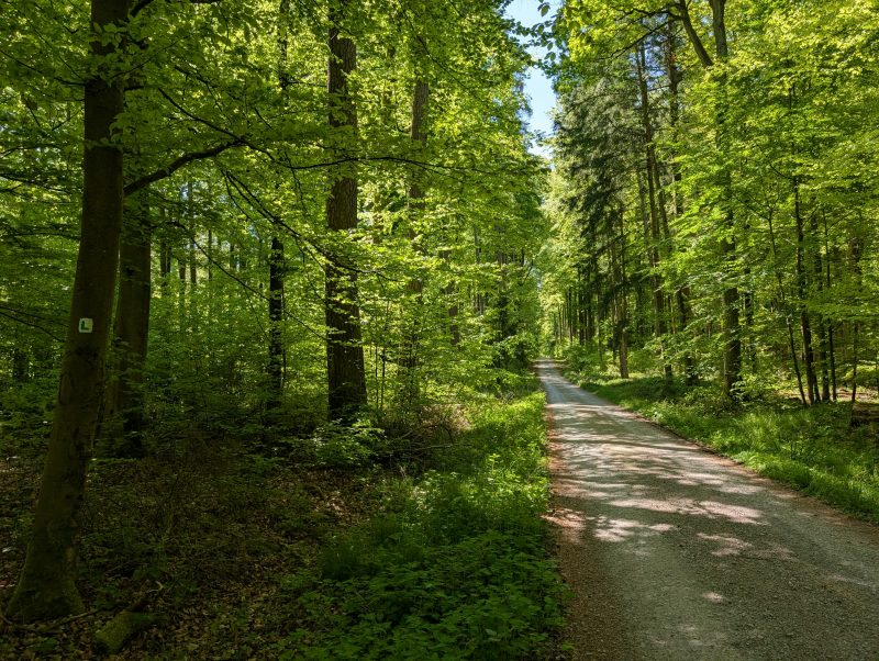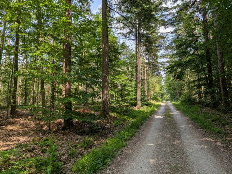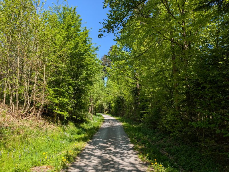Der Radweg hat heute wieder ordentliche 450 Höhenmeter und schlängelt sich eher breit und schotterig durch den Forst.