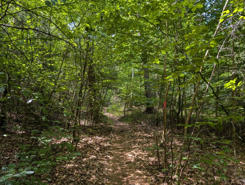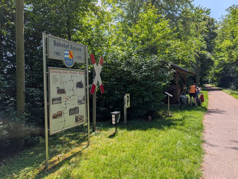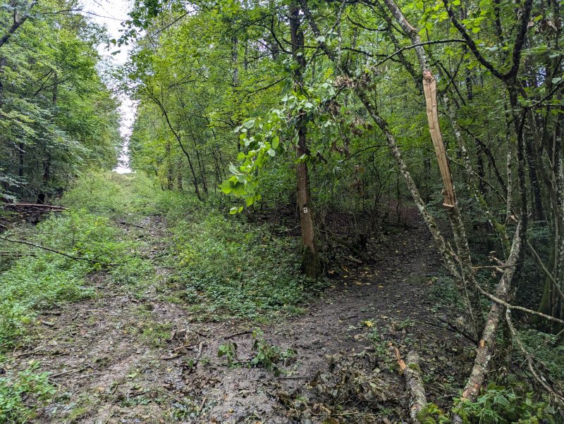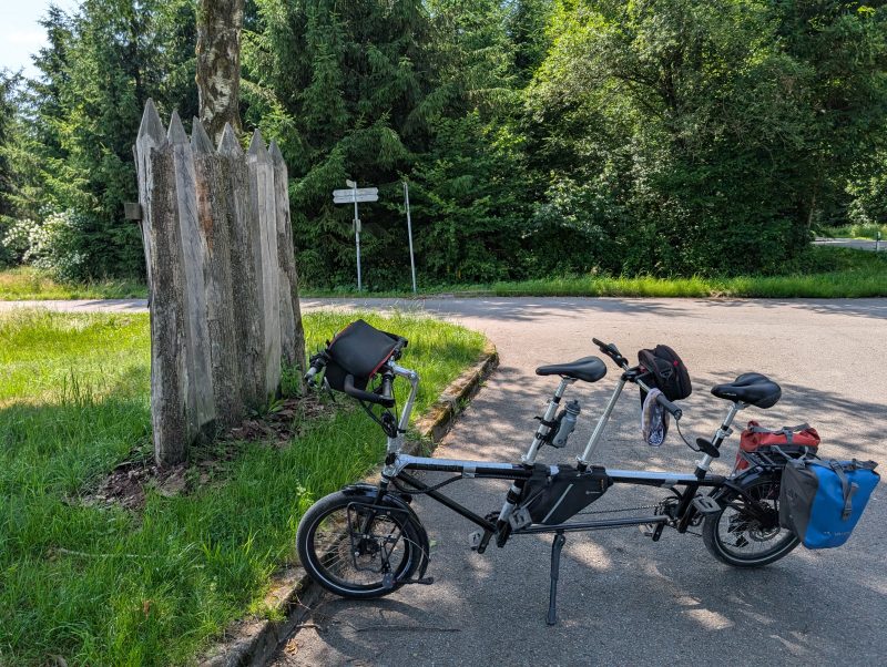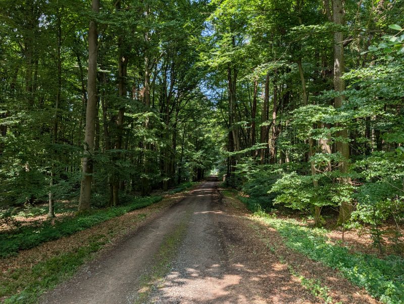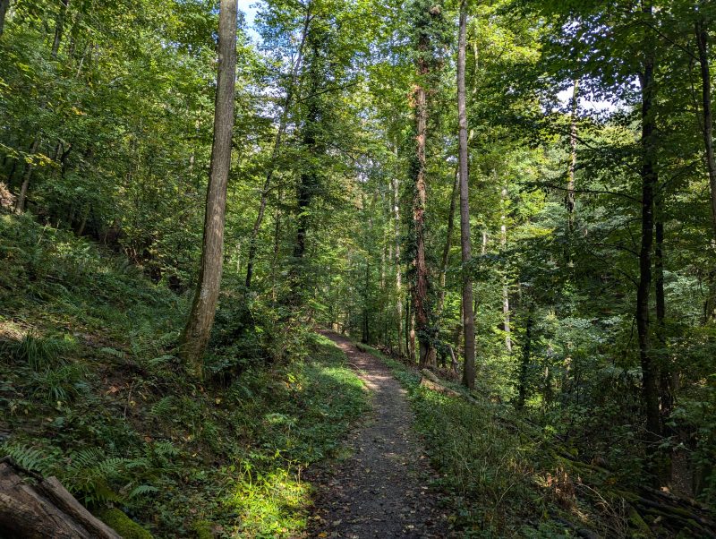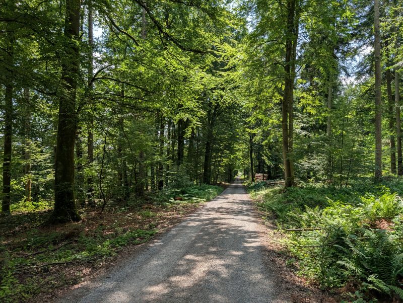 Der Radweg hat heute wieder ordentliche 450 Höhenmeter und schlängelt sich eher breit und schotterig durch den Forst.