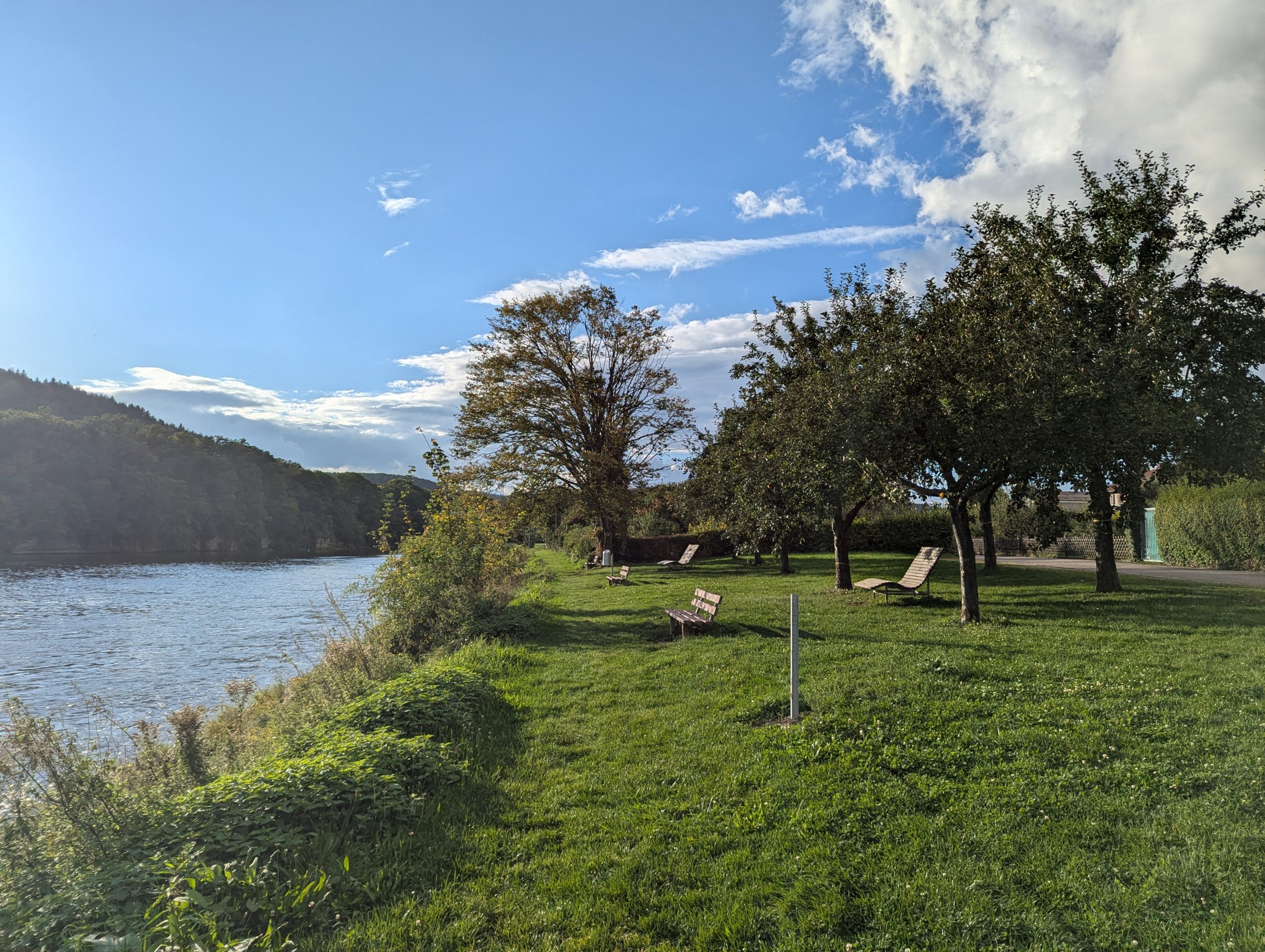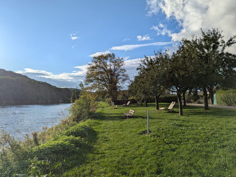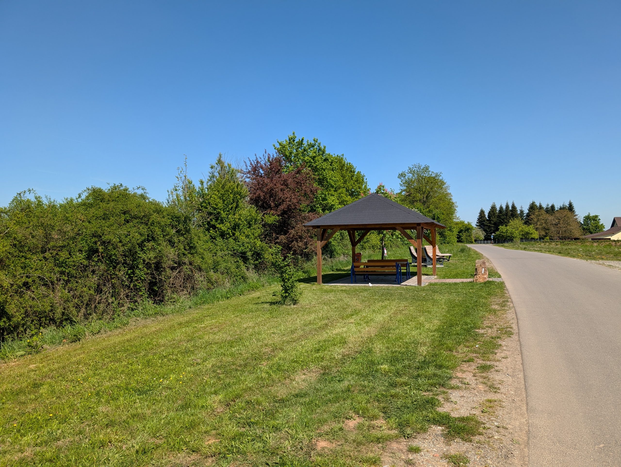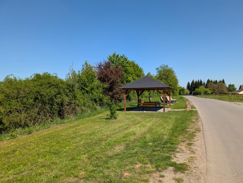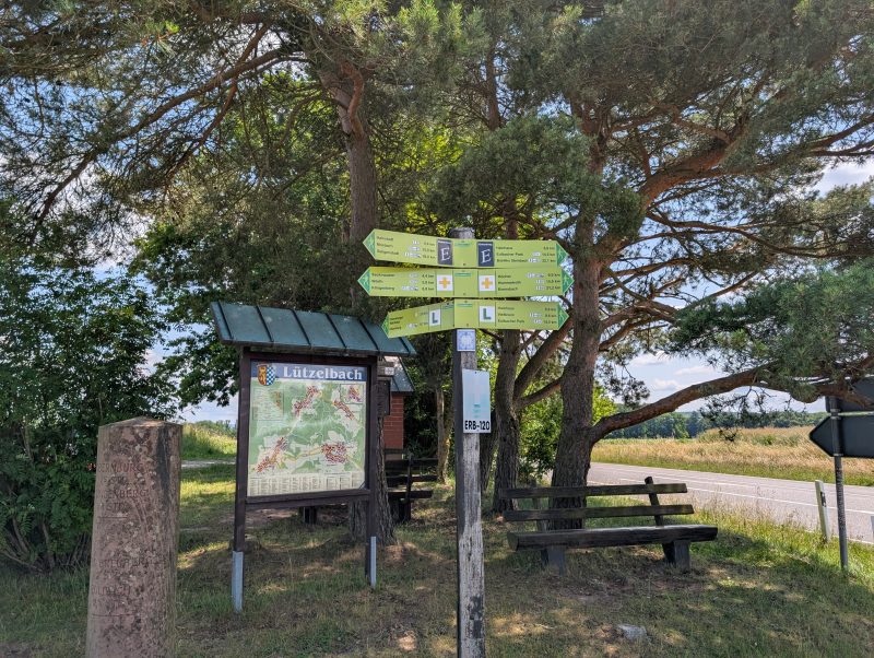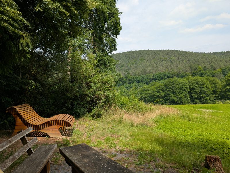 Am Ende der Strecke liegt ein Campingplatz, der als Übernachtungsort auch in Frage käme, aber die Rezeption ist nicht besetzt und so bleibt es beim Parkplatz am Friedhof bei Hutten, in dessen Büschen auch mein Rad einen Anbindeplatz findet. Es gibt viele lokale Rundwanderwege und auch ein paar zertifizierte mit hoher Ruhebankdichte.