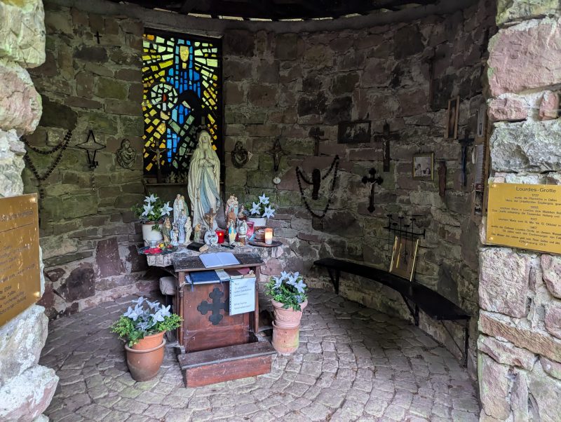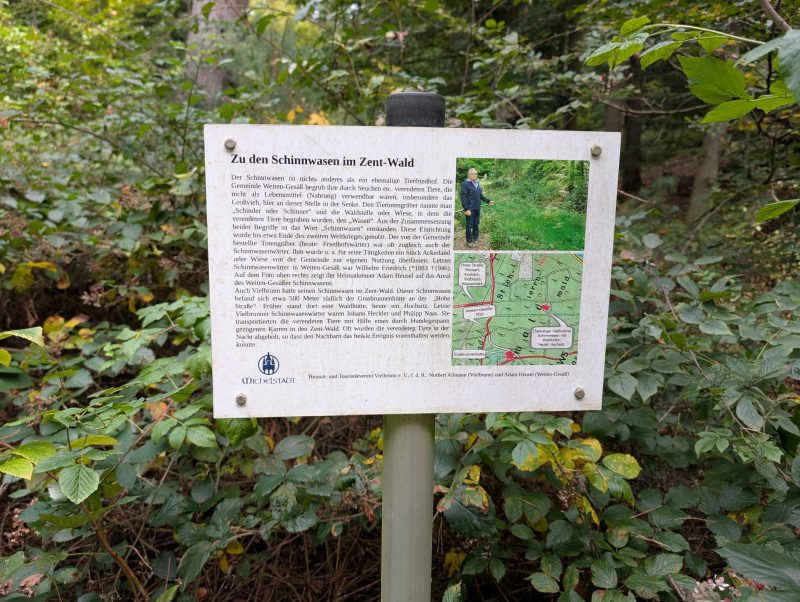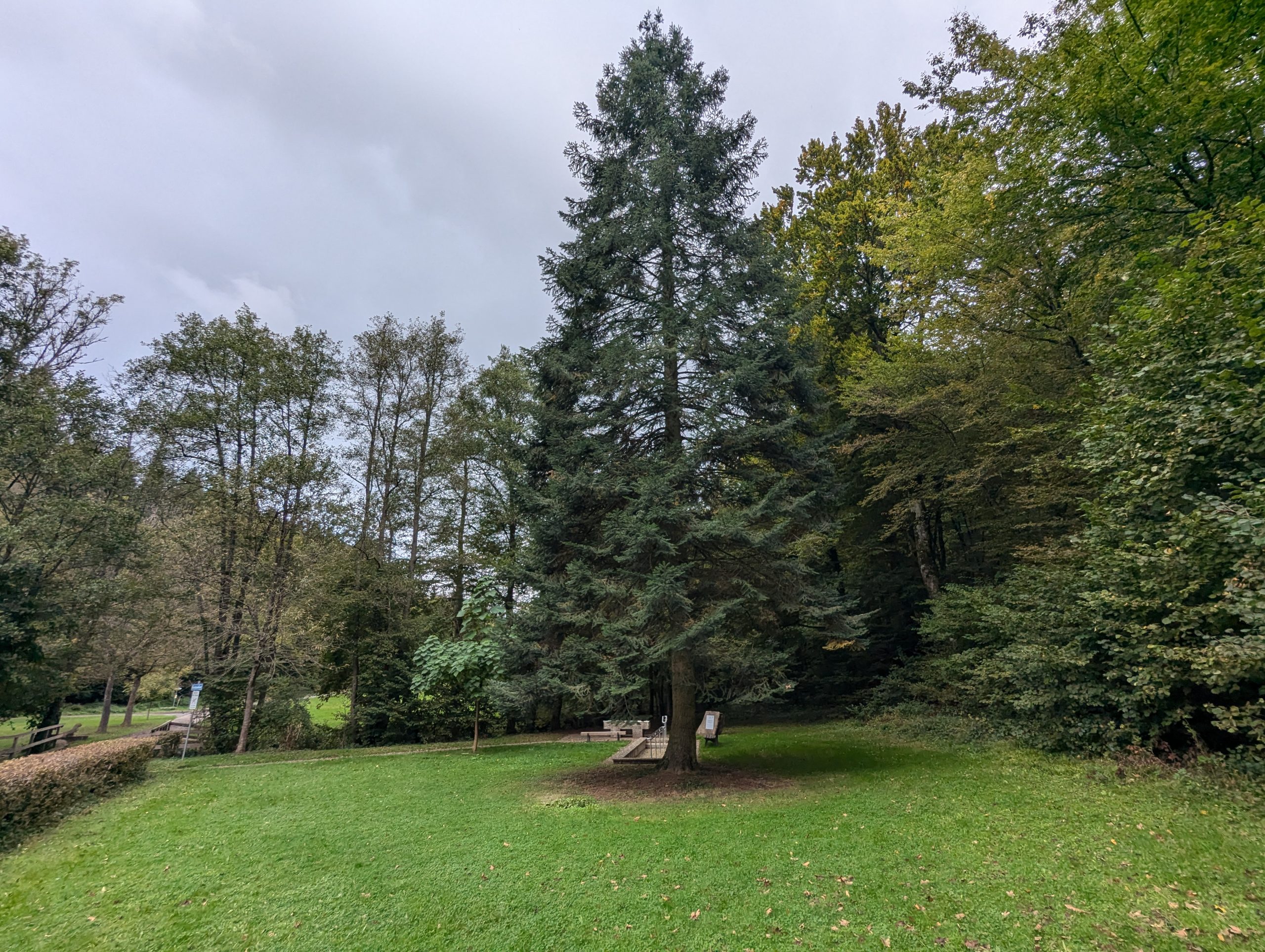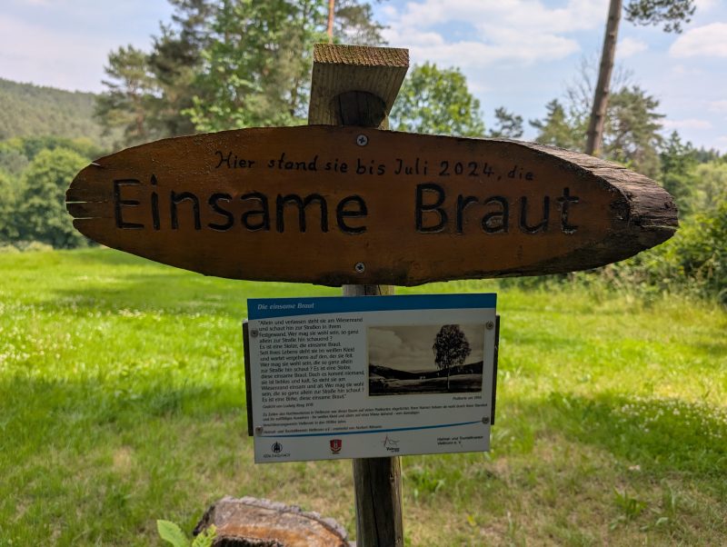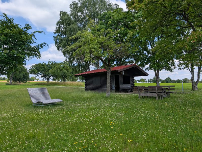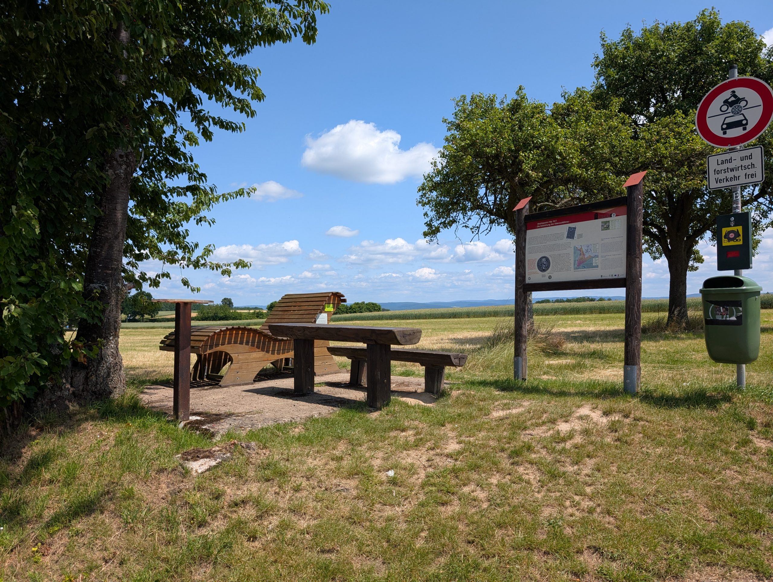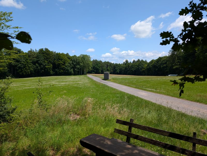 Am Ende der Strecke liegt ein Campingplatz, der als Übernachtungsort auch in Frage käme, aber die Rezeption ist nicht besetzt und so bleibt es beim Parkplatz am Friedhof bei Hutten, in dessen Büschen auch mein Rad einen Anbindeplatz findet. Es gibt viele lokale Rundwanderwege und auch ein paar zertifizierte mit hoher Ruhebankdichte.