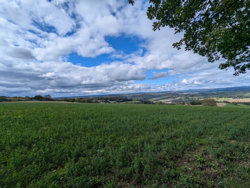 Von der Nuhne bei Rengershausen über die Hügel nach Norden bis zu einem Busch oberhalb von Münden ging die erste Etappe auf dem Rad. Der Lichtenfelser Panoramaweg zurück nimmt ein paar Schleifen und ein paar Höhenmeter mehr mit als die Radstrecke. An einer im Track noch zu sehenden Stelle gab es eine in einem Elektrostachdraht endende Differenz zwischen Markierung und Track.