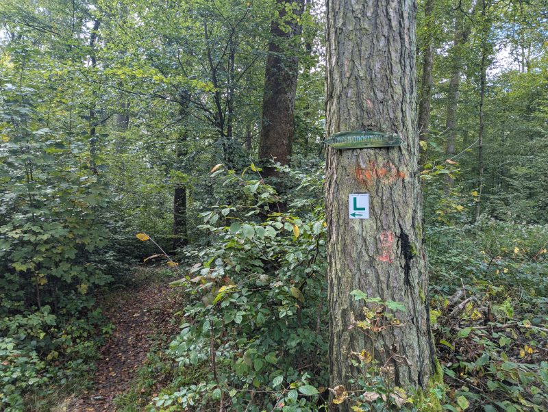 Der Eselsweg geht direkt am Radparkplatz vorbei, am Anfang noch idyllisch durch Buchenniederwald und hält sich östlich vom Hinweg und spart damit ein paar Höhenmeter.