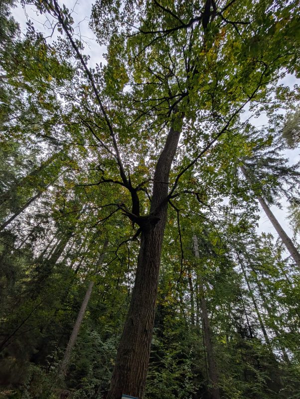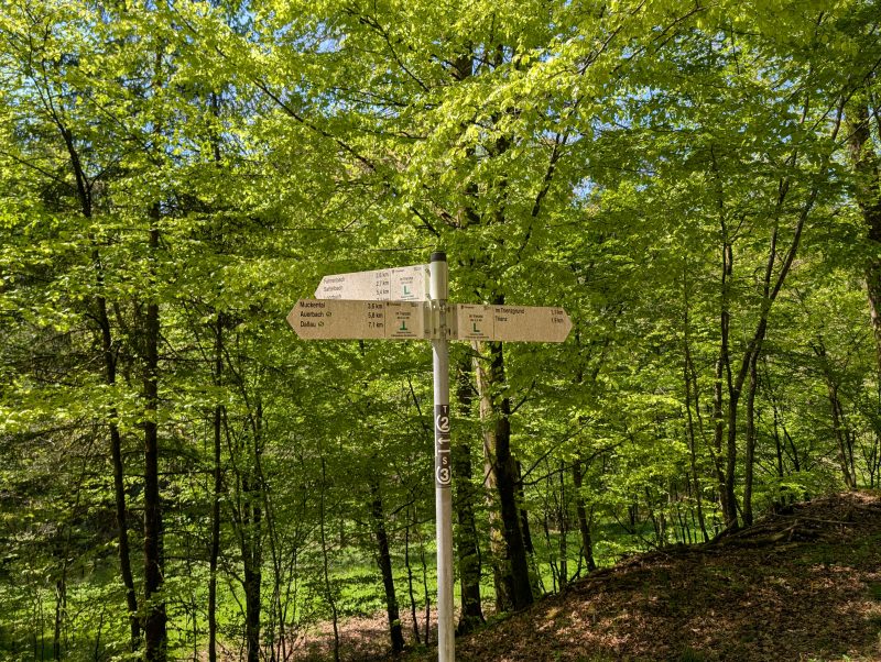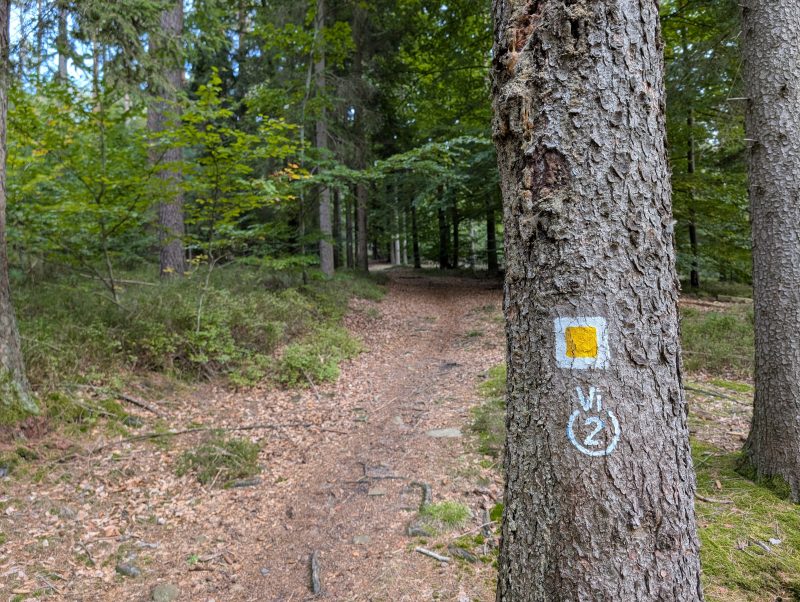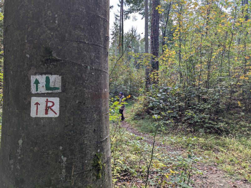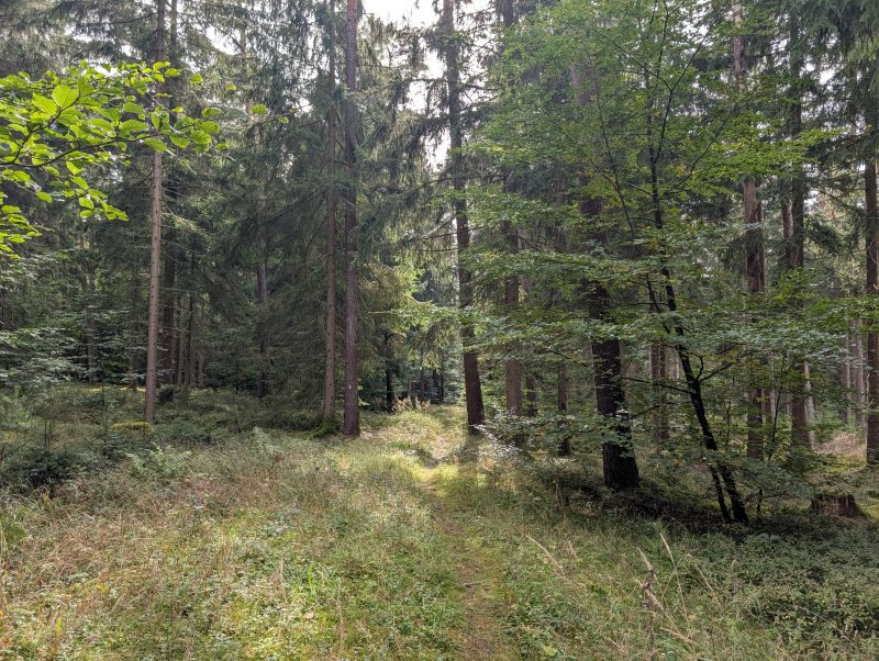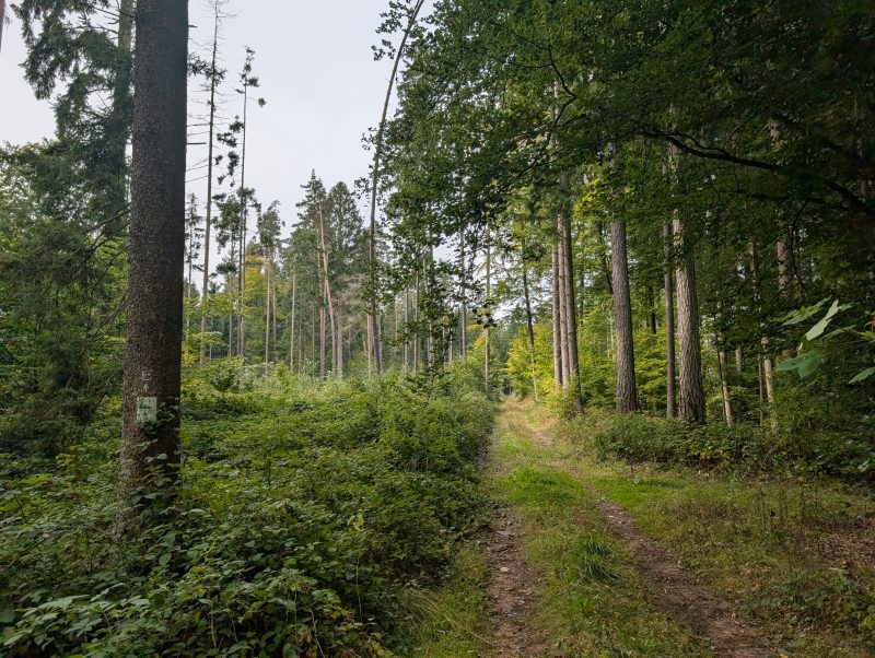 Die Wege sind teils breit geschottert, teils schmal und pfadig. Gut zu gehen und leicht wellig. Die Zehen schmerzen daher nicht so sehr, vielleicht auch weil ich jetzt eher Wanderschuh ähnliches Material an den Füßen habe. Fichten wechseln mit Buchen und Mischbeständen.
