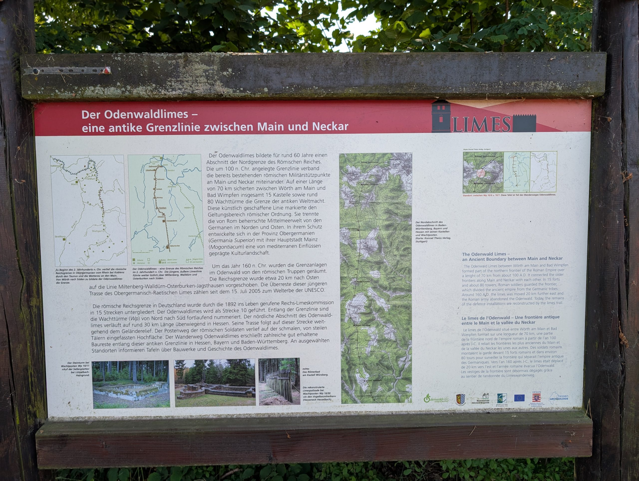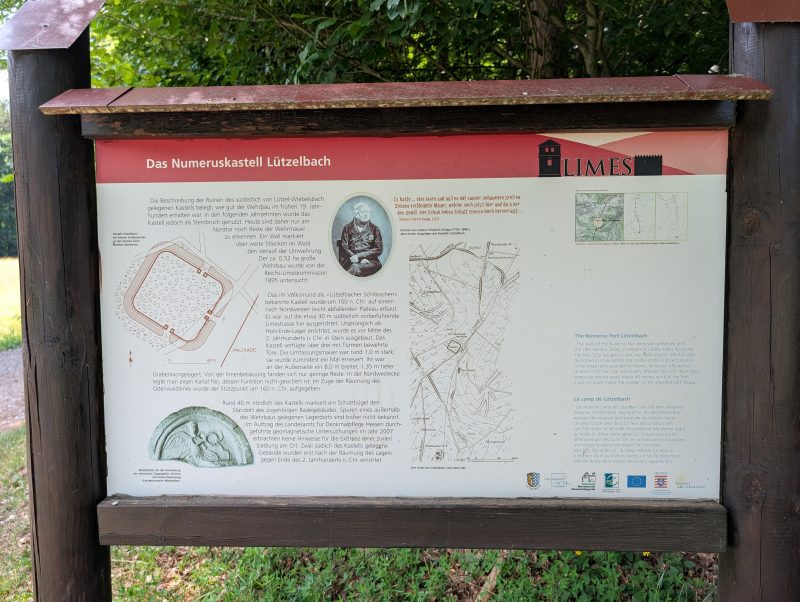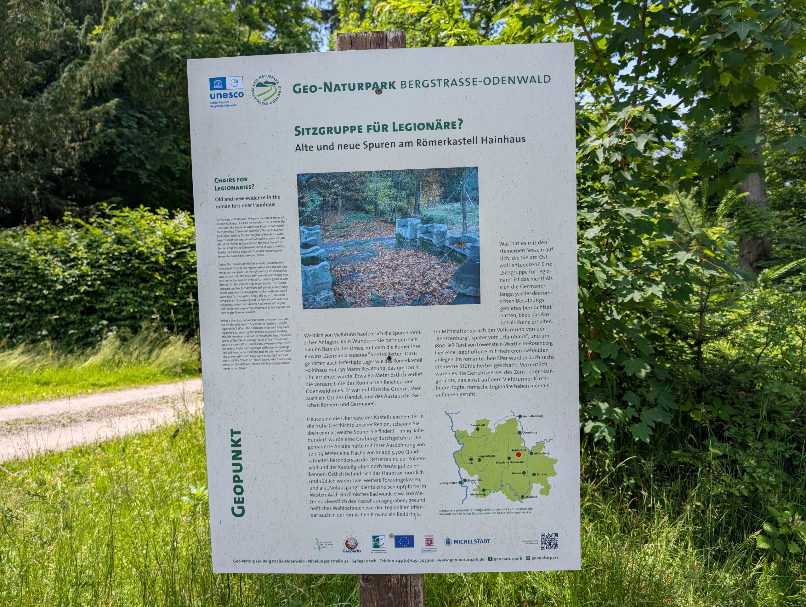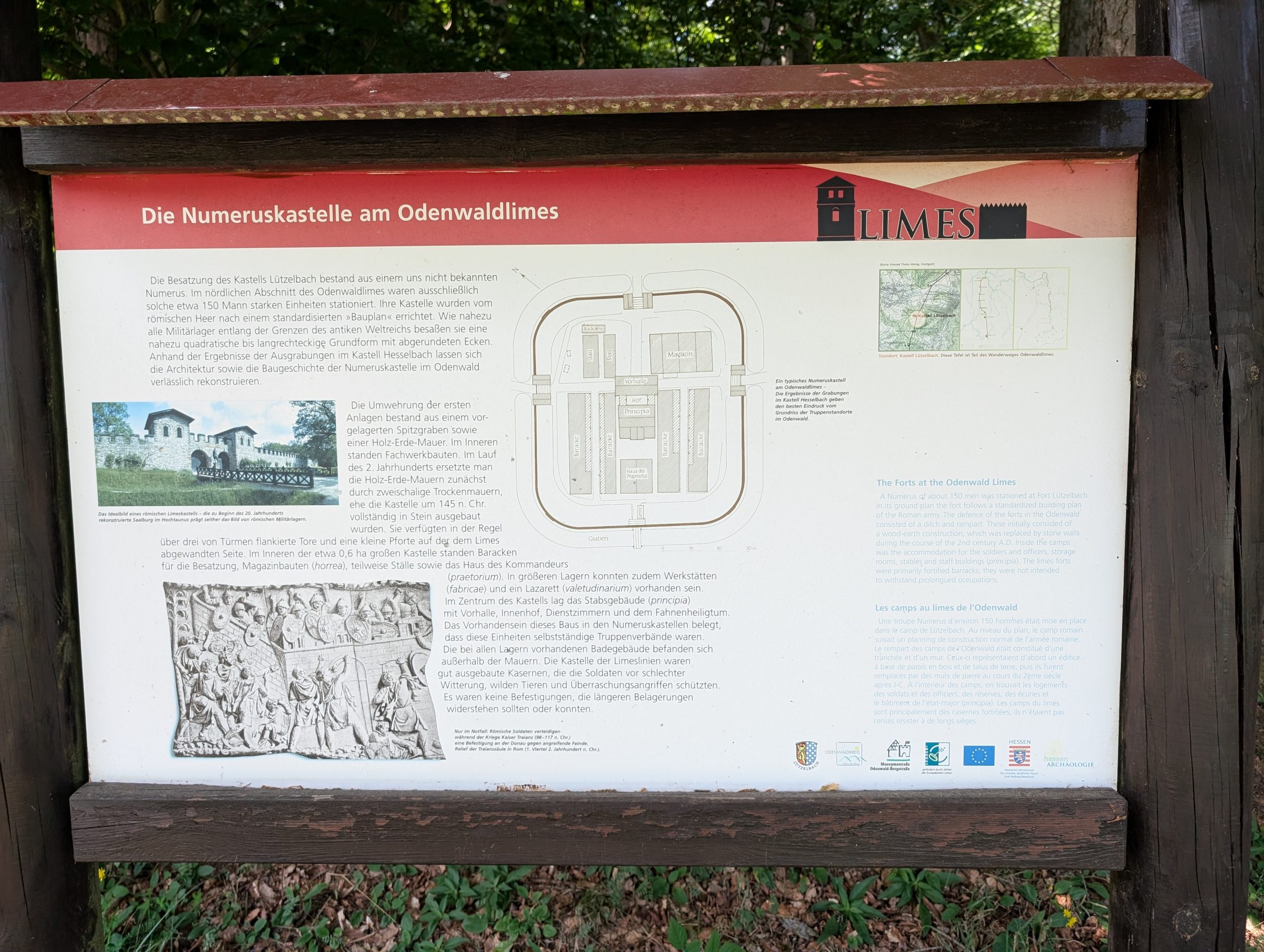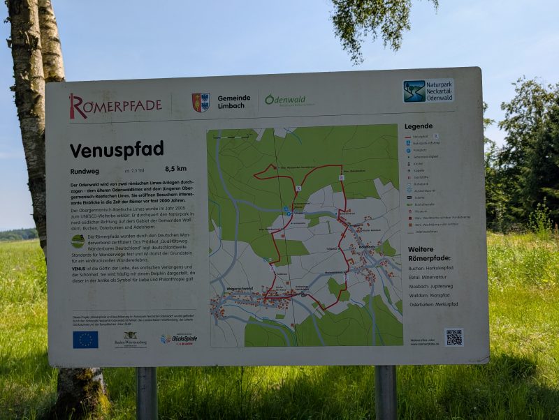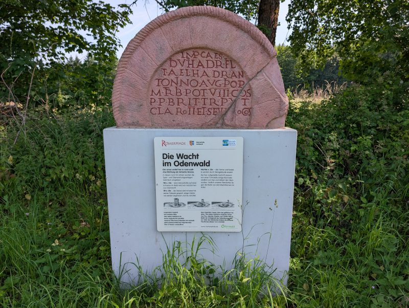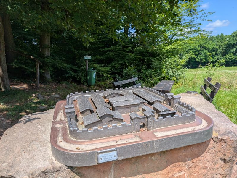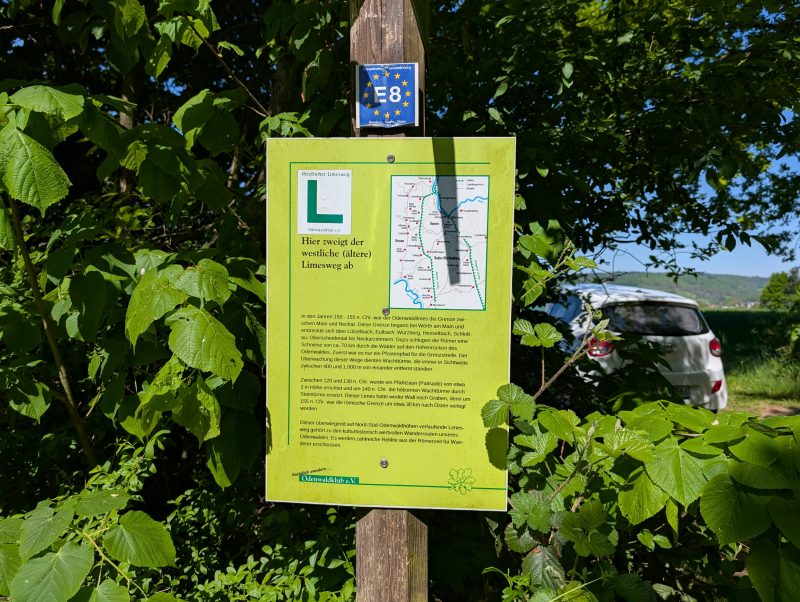 Mitte Juni 2025 ist es sehr warm und wir beschließen, einige Teile des Wanderweges wieder als Tandem-Wanderungen anzugehen. Ausgangspunkt dieser Tour ist ein Wanderparkplatz kurz vor Lützel Wiebelsbach. Mit dem Westlichen Limesweg und etwas später parallel zum Limesweg geht es in Richtung Haingrund. An einer Wegspinne im Wald verlassen wir schon wieder unseren Westlichen Limesweg und folgen dem Weg Br1 an Breitenbrunn vorbei und weiter steil hinab mit Lü2 bis Lützel-Wiebelsbach. Anschließend leitet uns dieser Weg wieder steil den Berg hinauf bis zu unserem Wanderparkplatz. Beeindruckend auf dieser Strecke sind die zwei Kupfermodelle der Kleinkastelle “Auf der Windlücke” und “Numeruskastell Lützenbach”.
